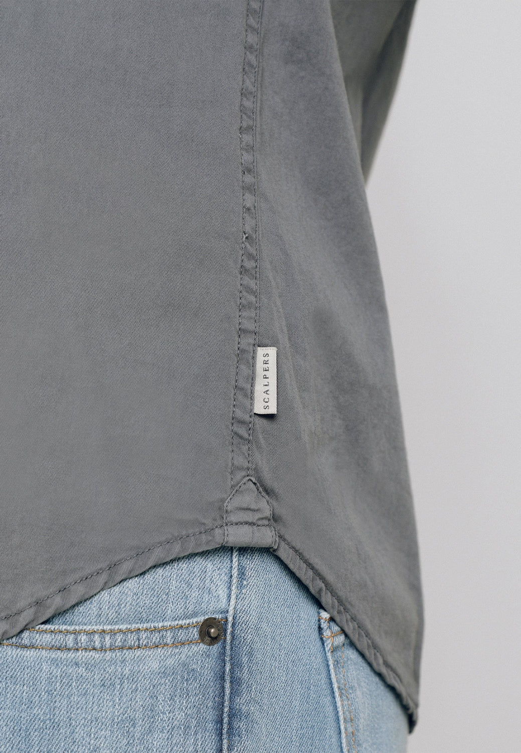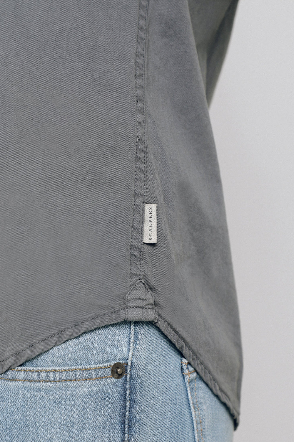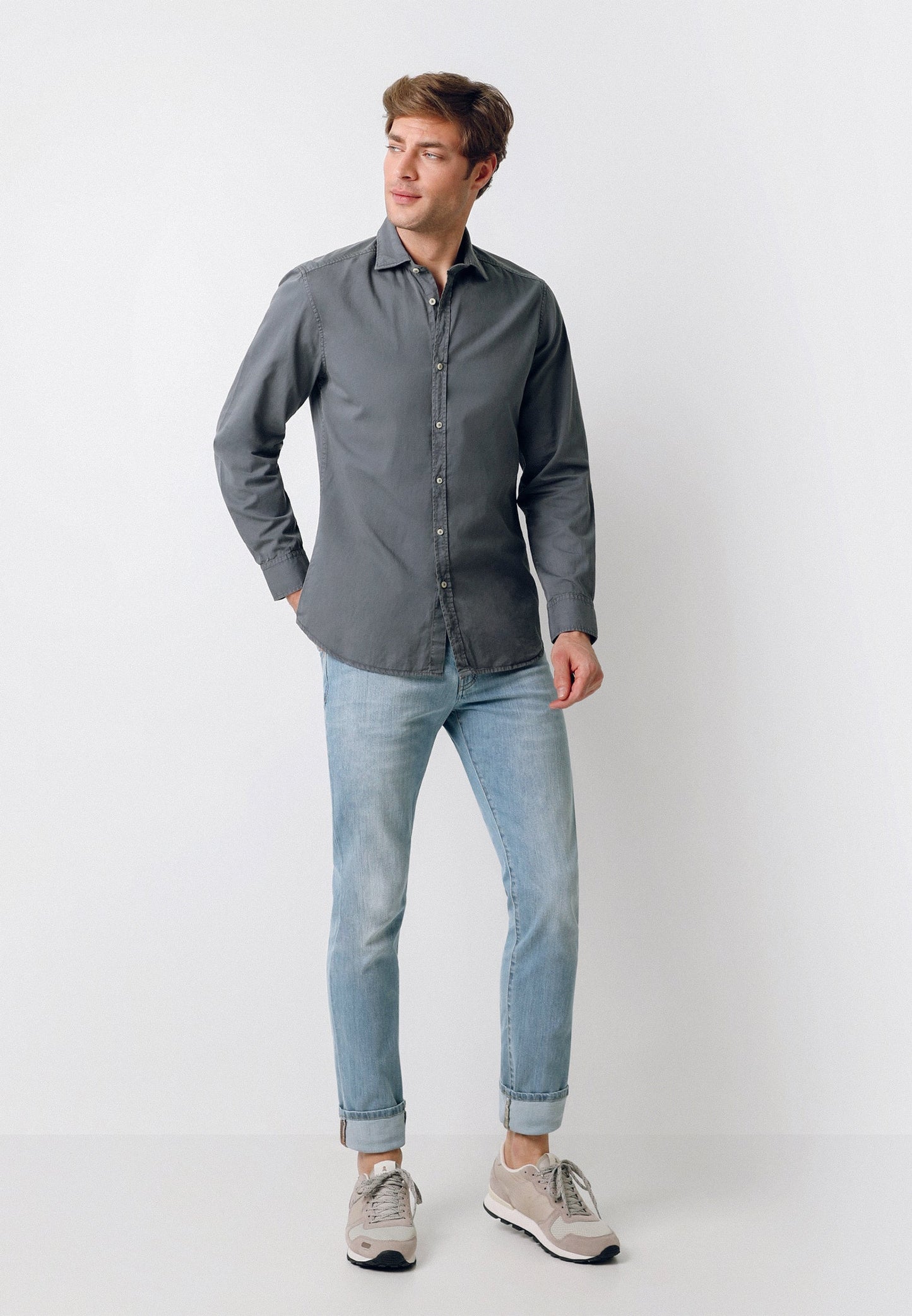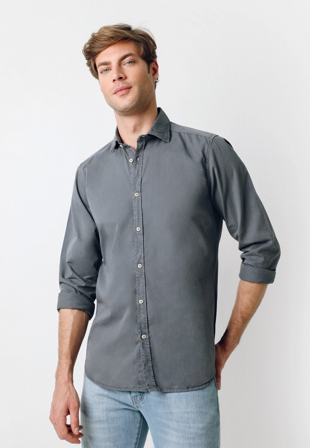Camisa confeccionada en tejido 100% algodón. Corte Regular Fit, cuello italiano y cierre con botones. Manga larga terminada en puño simple y detalle de etiqueta lateral.
