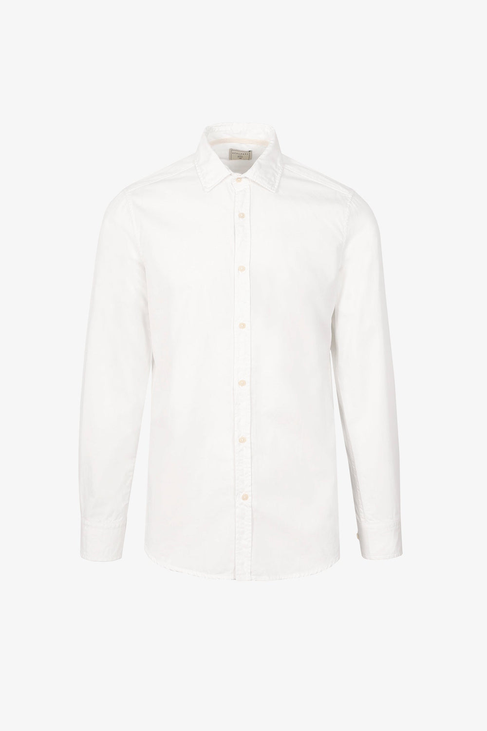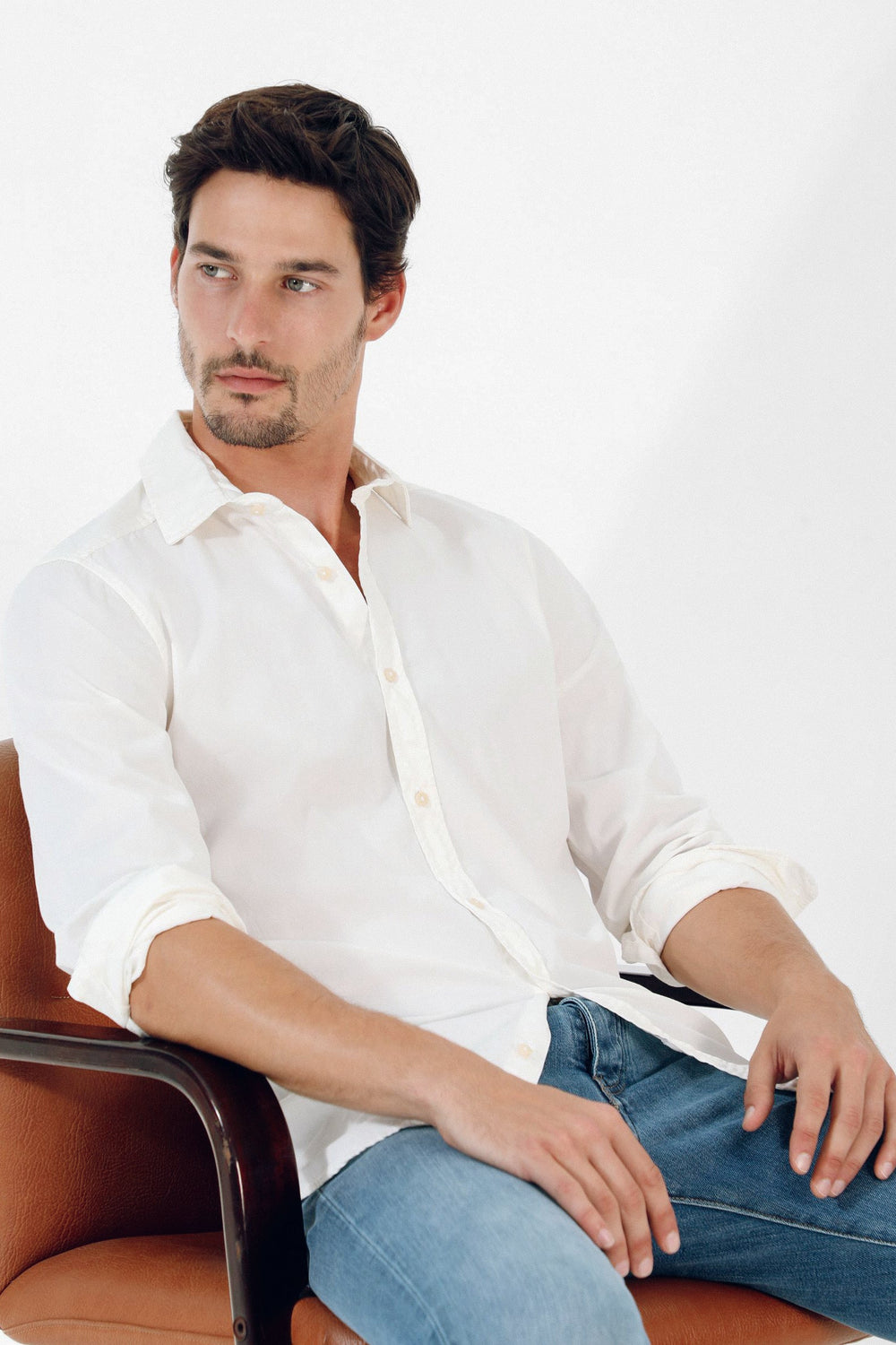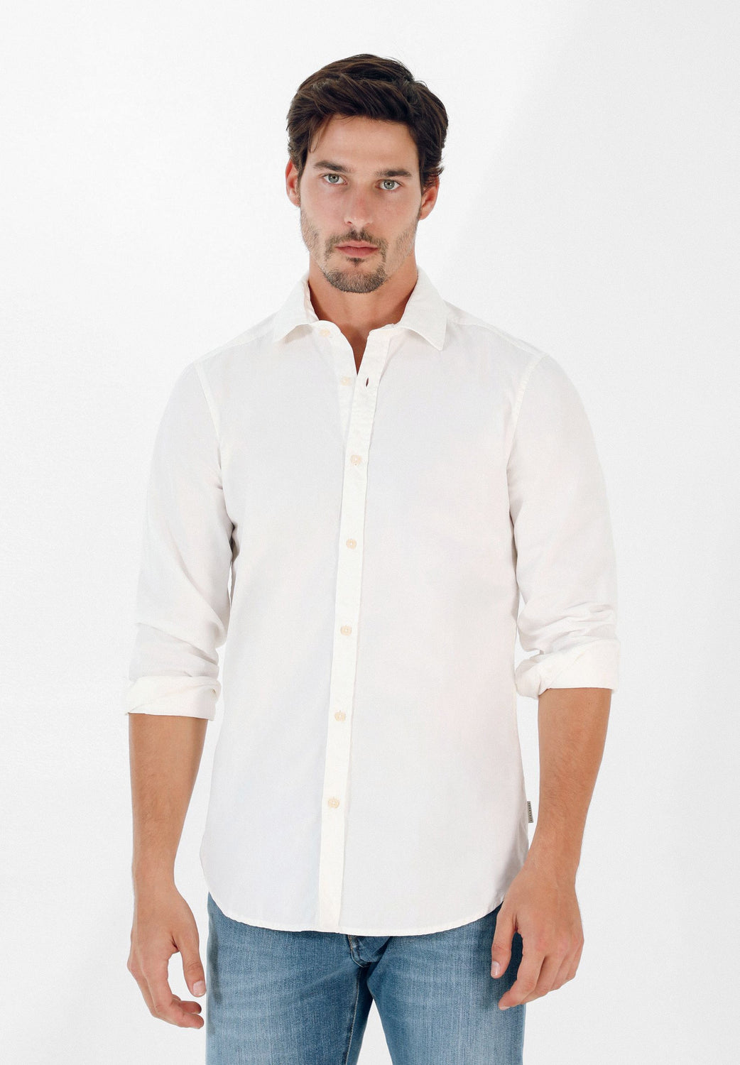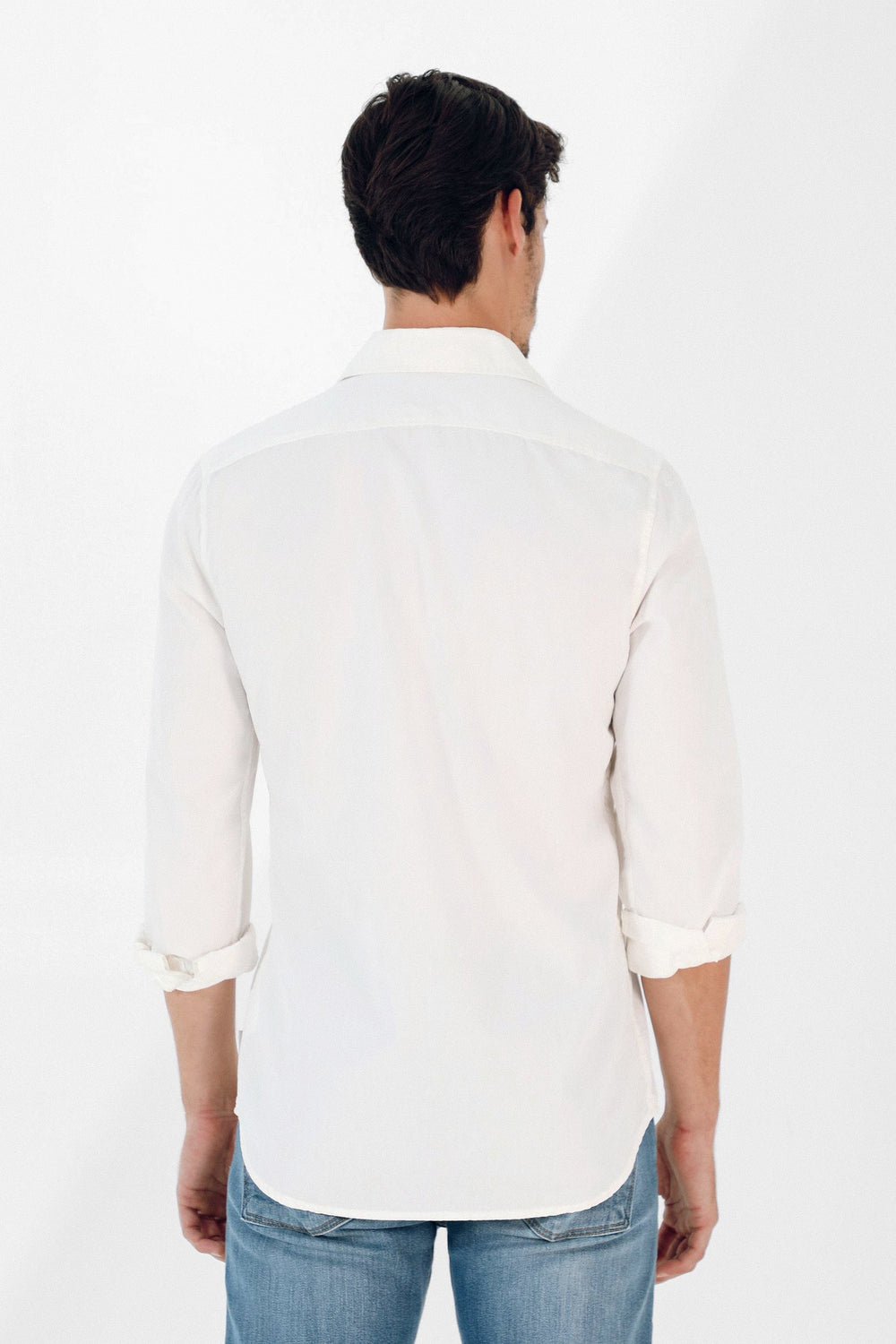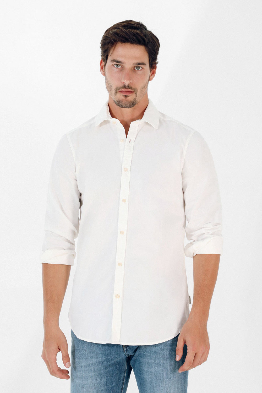 Camisa confeccionada en tejido 100% algodón. Corte Regular Fit, cuello italiano y cierre con botones. Manga larga terminada en puño simple y detalle de etiqueta lateral.