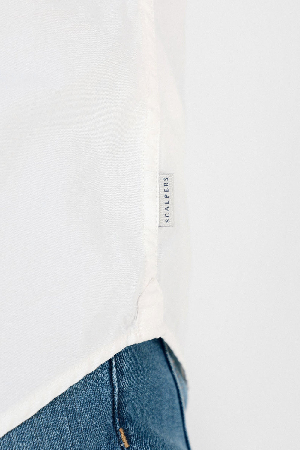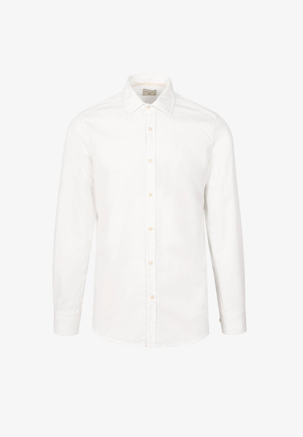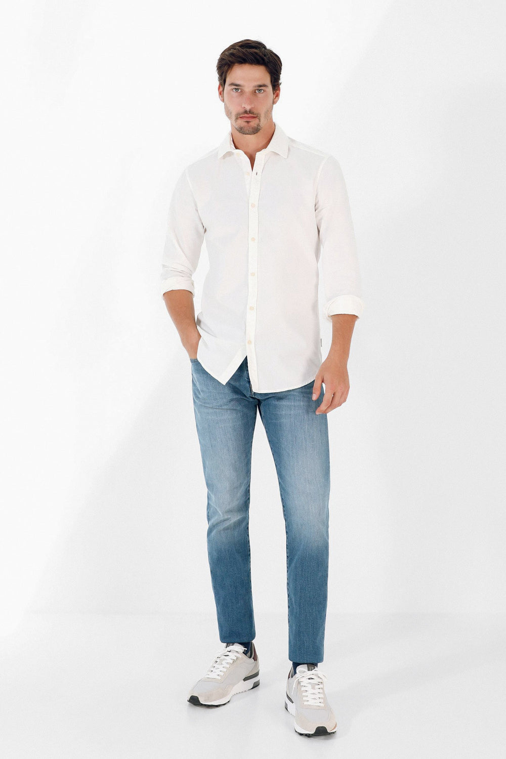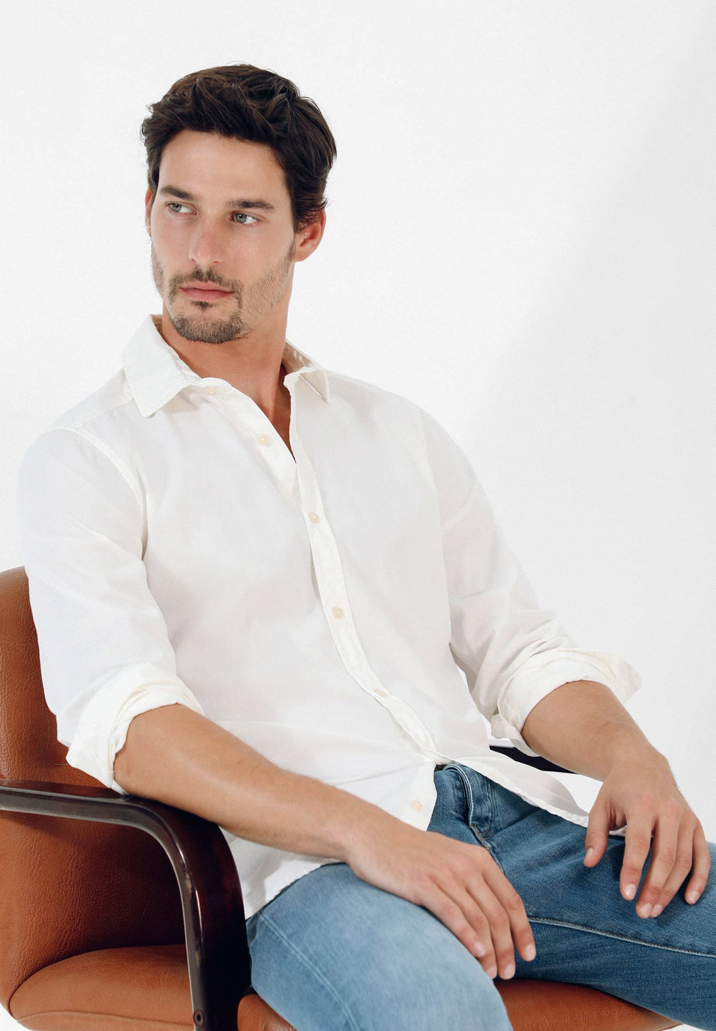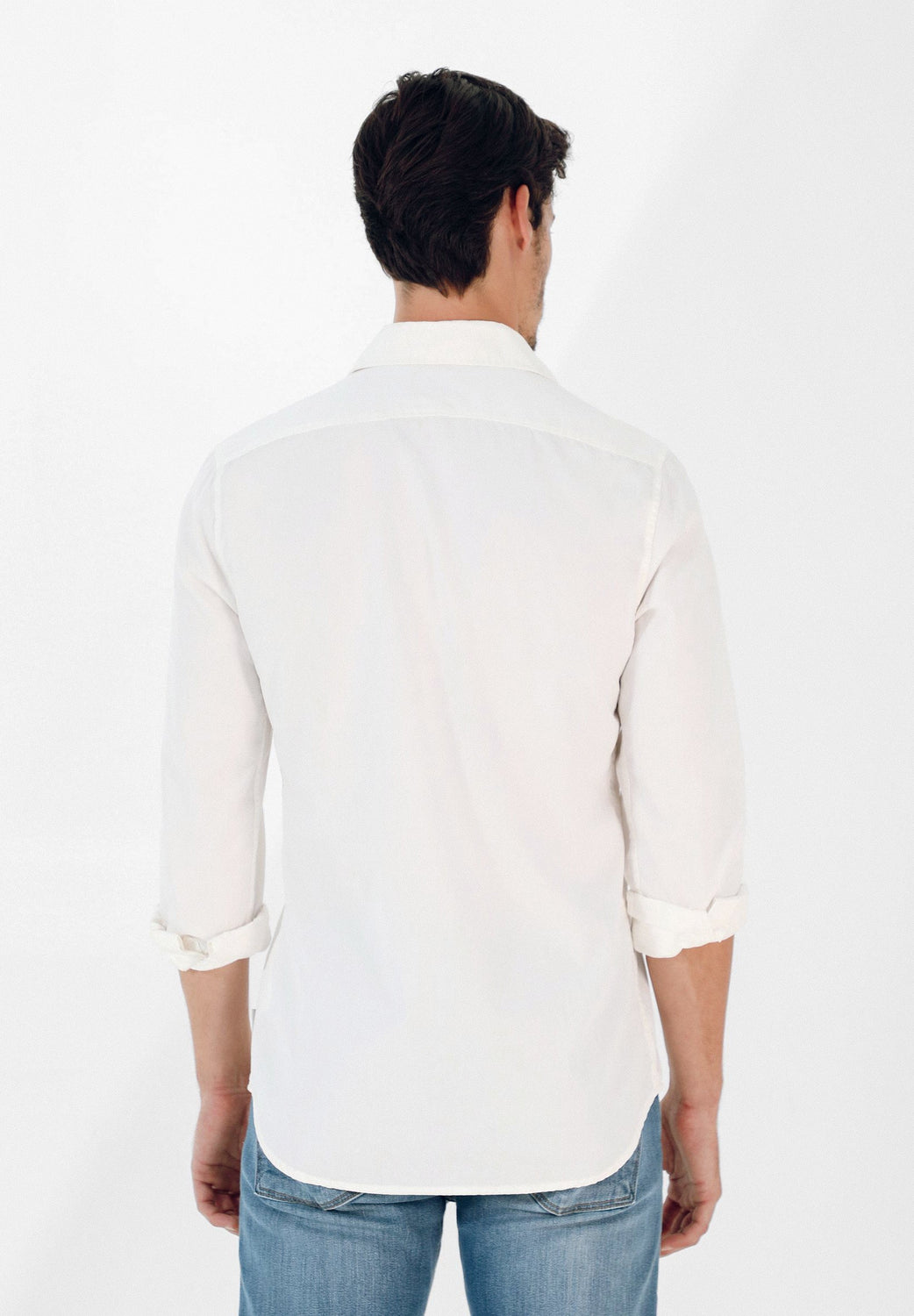 Camisa confeccionada en tejido 100% algodón. Corte Regular Fit, cuello italiano y cierre con botones. Manga larga terminada en puño simple y detalle de etiqueta lateral.