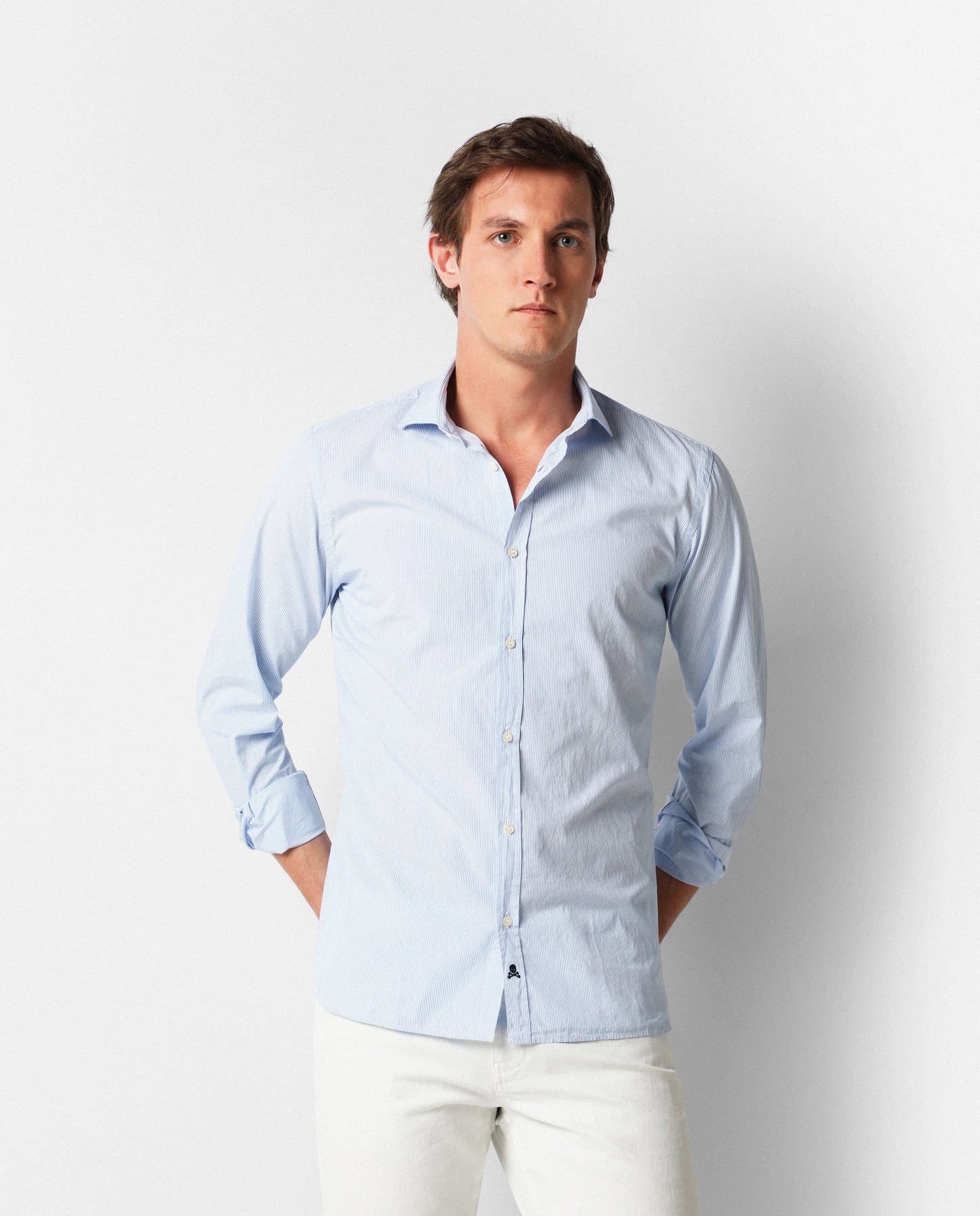 Camisa de vestir confeccionada en tejido 100% algodón. Corte Slim Fit con pinzas, cuello italiano con ballenas y botones. Manga larga terminada en puño y detalle de calavera bordada en el bajo.