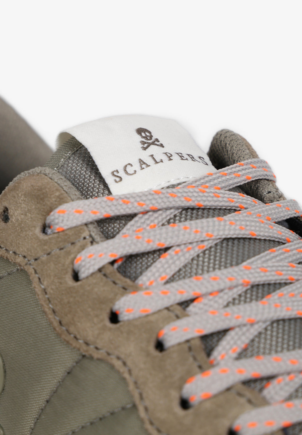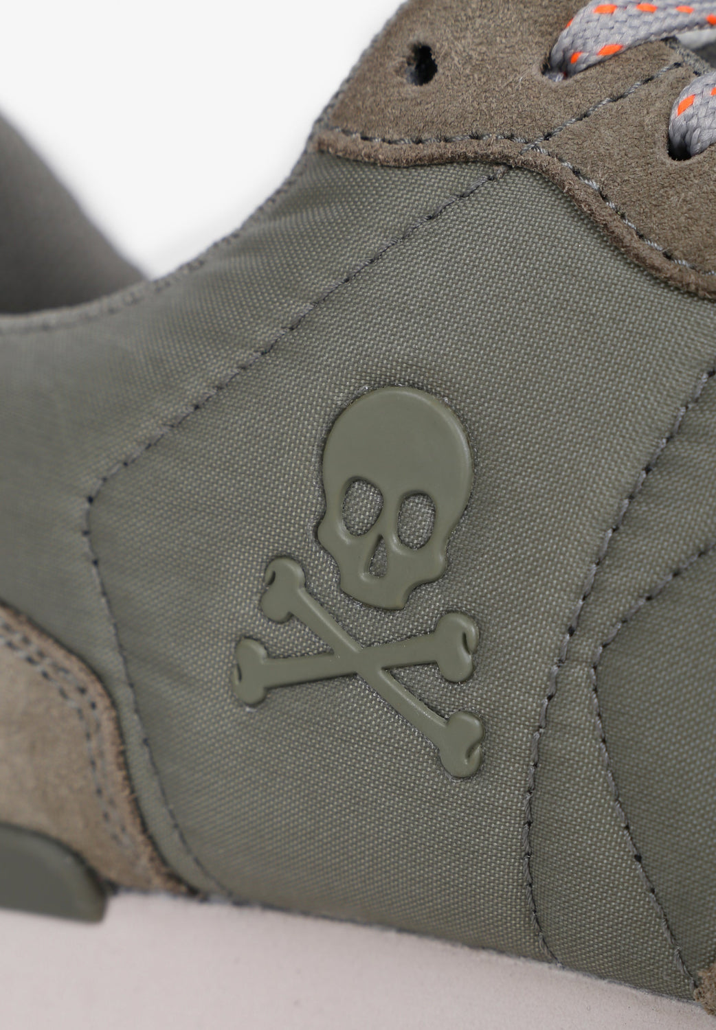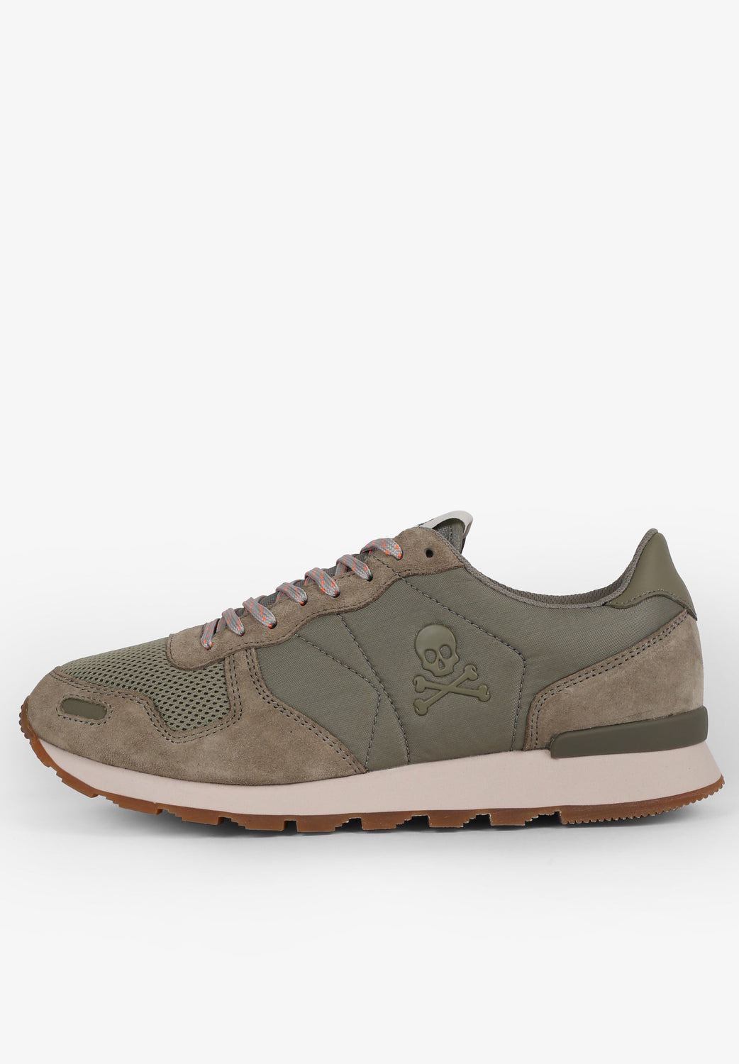 Zapatillas confeccionados en nailon y serraje. Cierre con cordones. Suela de goma y eva con estabilizador a contraste. Tejido transpirable de rejilla en pala, y calavera printeada en goma de alta densidad en el lateral.