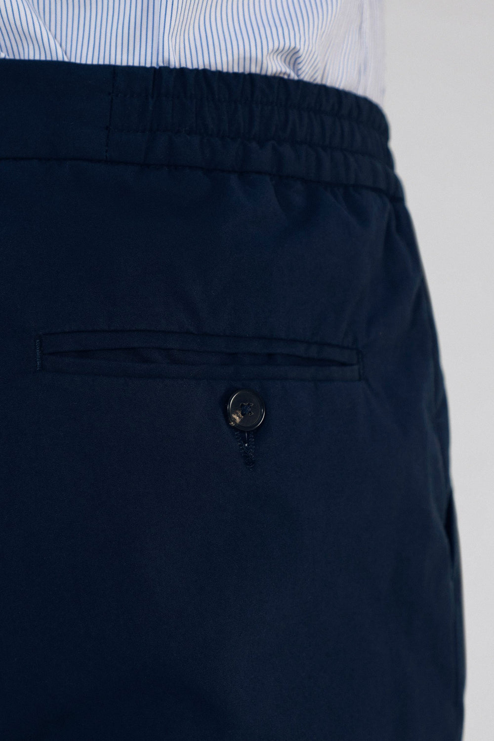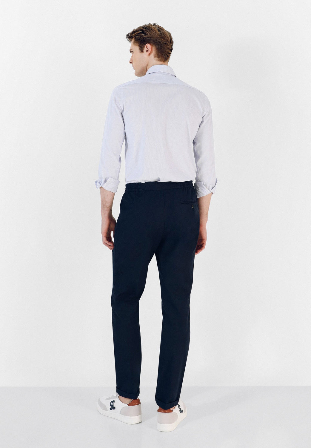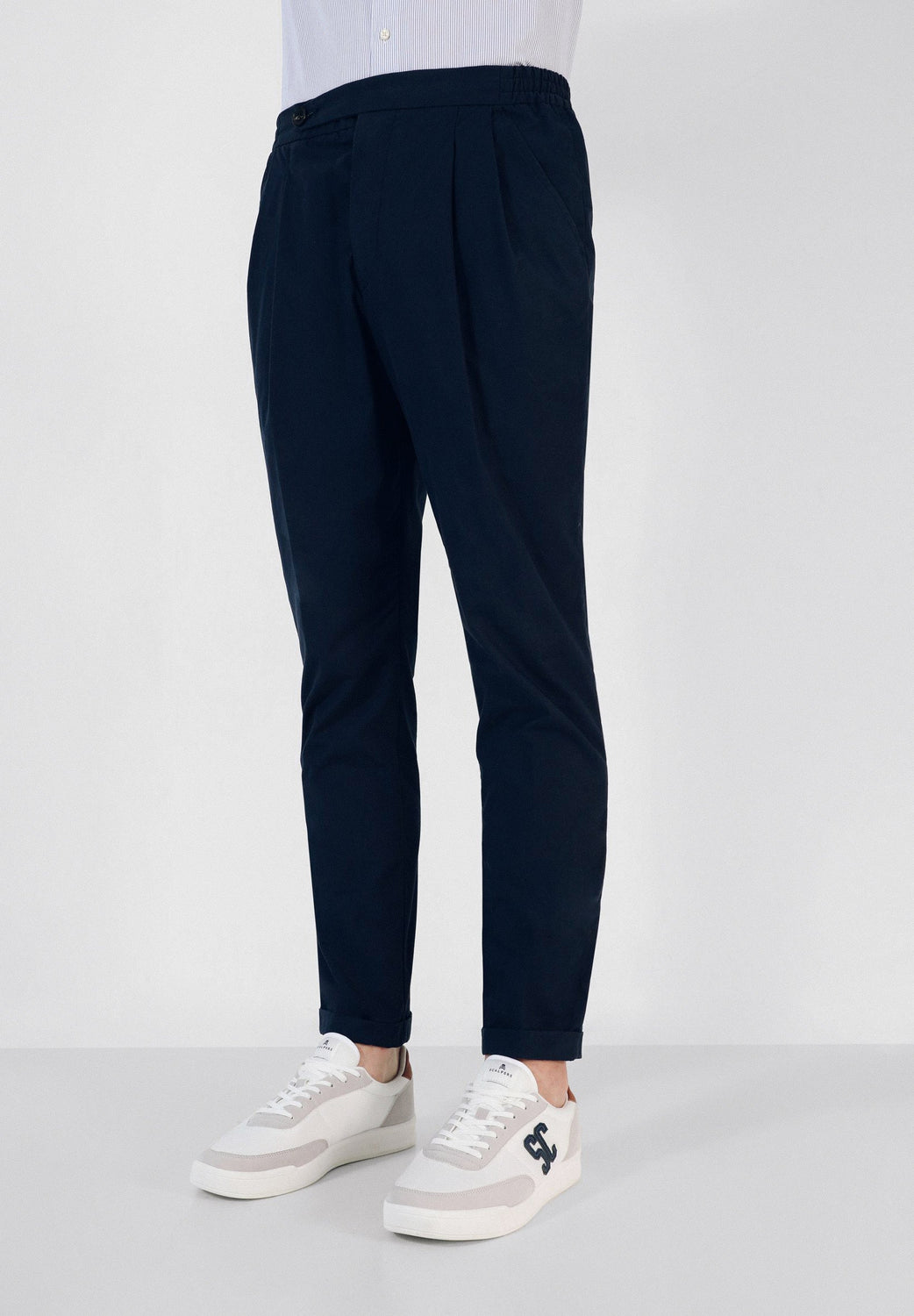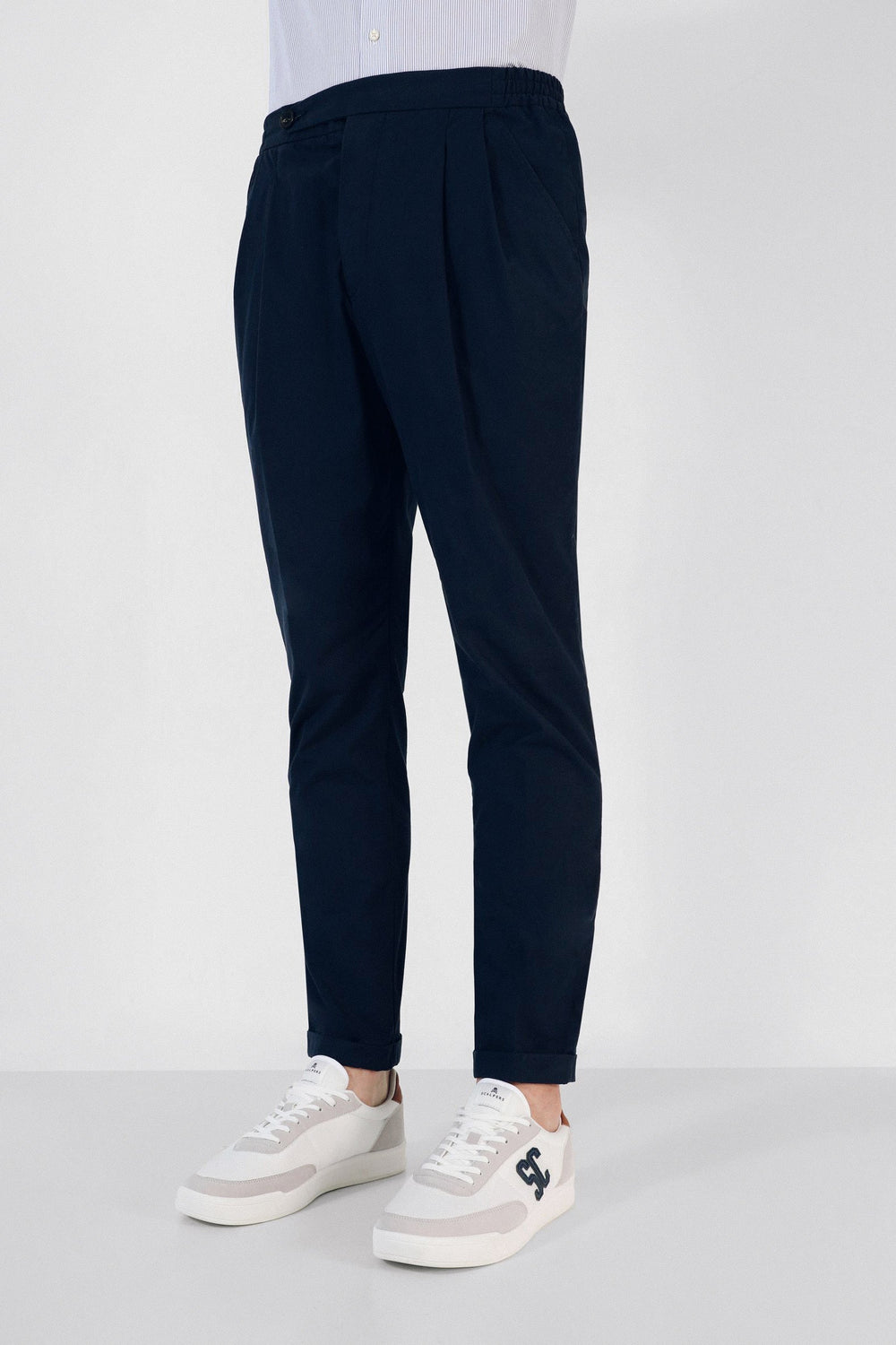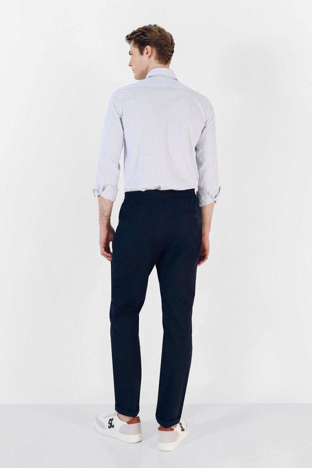 Pantalón confeccionado en tejido 100% algodón. Corte Slim Fit con pinzas y cintura con goma elástica, cierre con cremallera oculta por tapeta y botón en cintura que prolonga. Bolsillos laterales y bolsillos de vivo con botón.