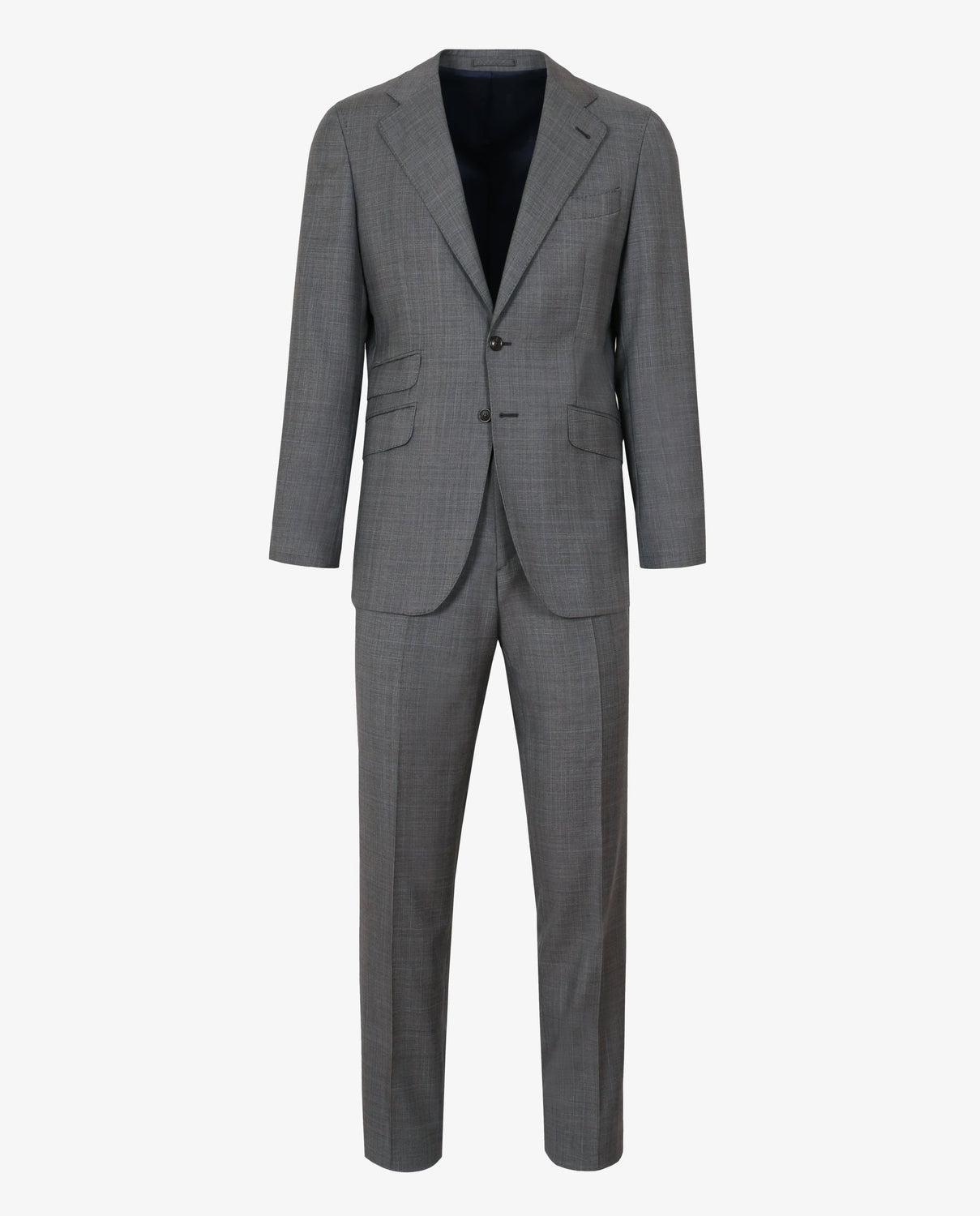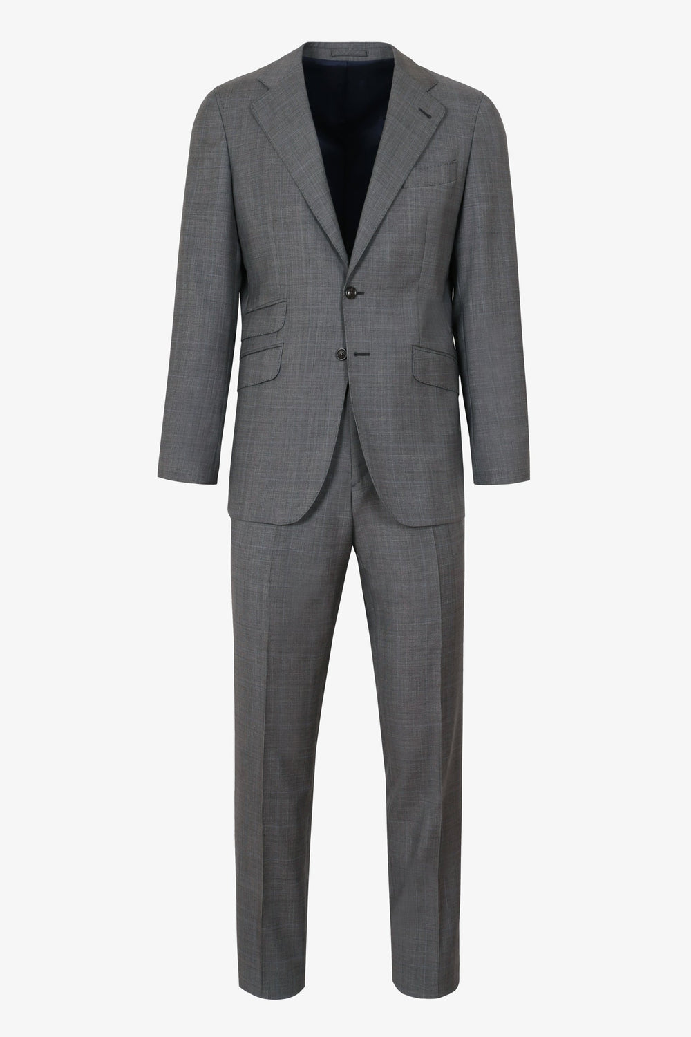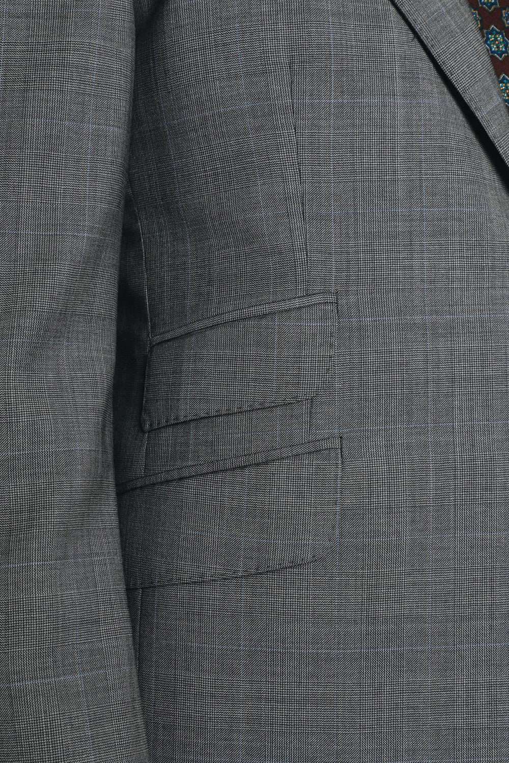 Traje confeccionado en tejido 100% algodón. Corte Slim Fit, americana con solapa y ojal y cierre con dos botones. Manga larga terminada en puño con botones y bolsillos laterales con tapeta y bolsillo insertado a la altura del pecho.