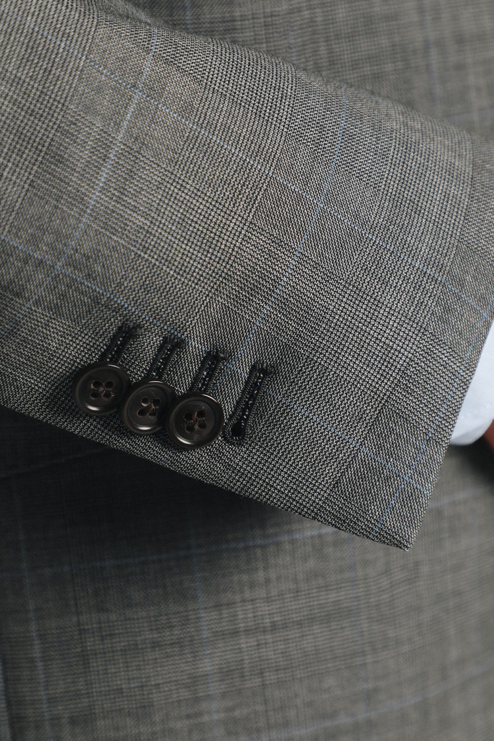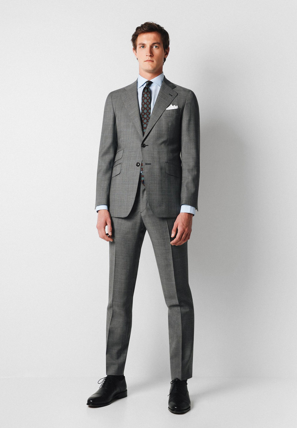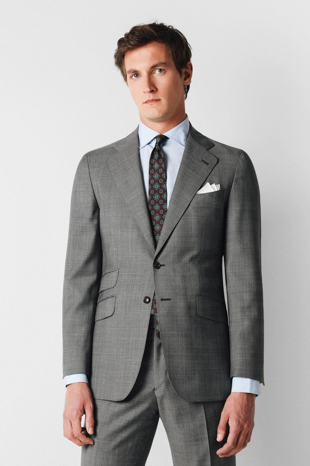 Traje confeccionado en tejido 100% algodón. Corte Slim Fit, americana con solapa y ojal y cierre con dos botones. Manga larga terminada en puño con botones y bolsillos laterales con tapeta y bolsillo insertado a la altura del pecho.