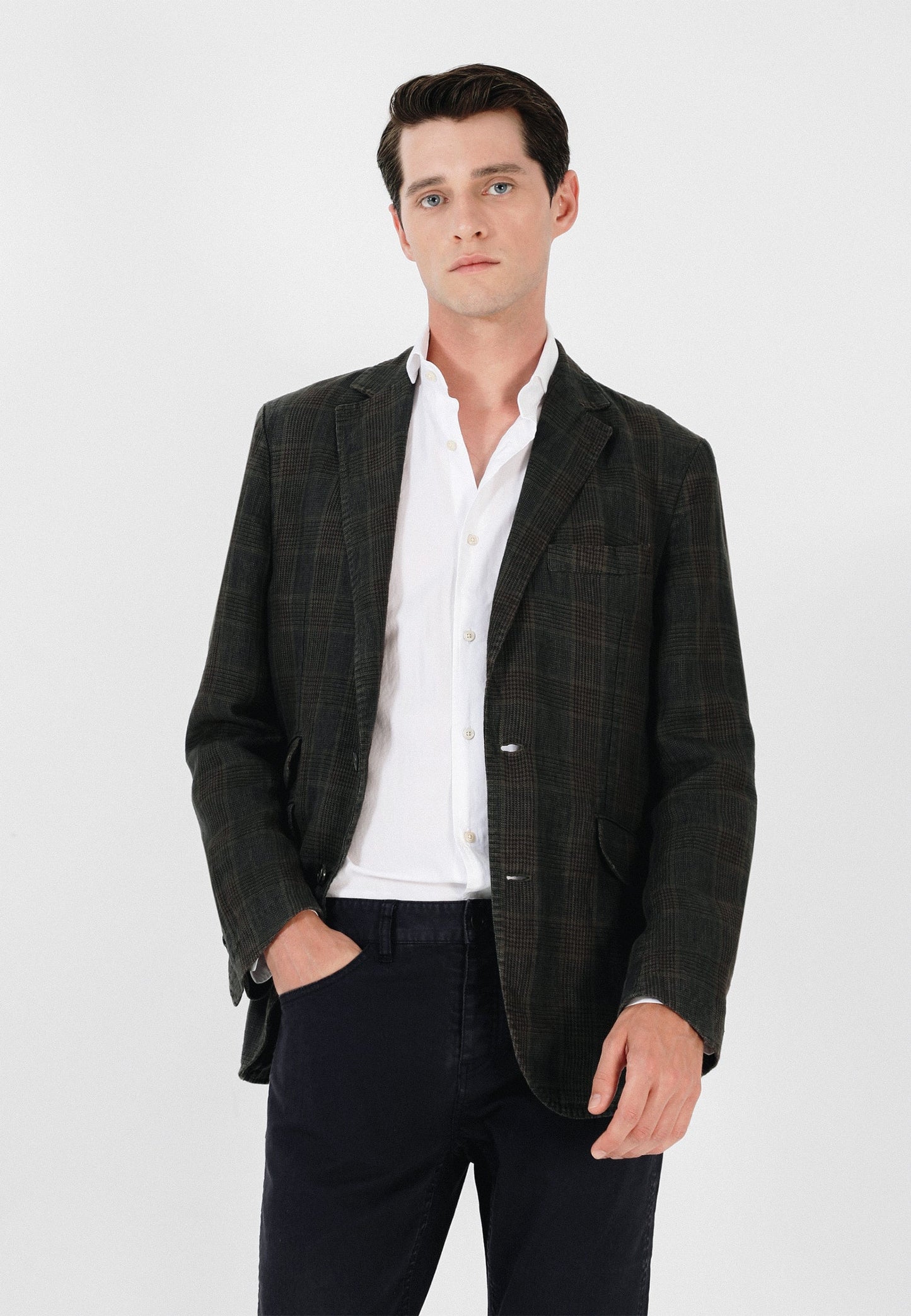 Americana de cuadros confeccionada en tejido 100% lino. Corte Slim Fit, cuello con solapa de muesca y cierre con botones. Manga larga terminada en puño con cuatro botones y bolsillos frontales de vivo y solapa. Bolsillos interiores.