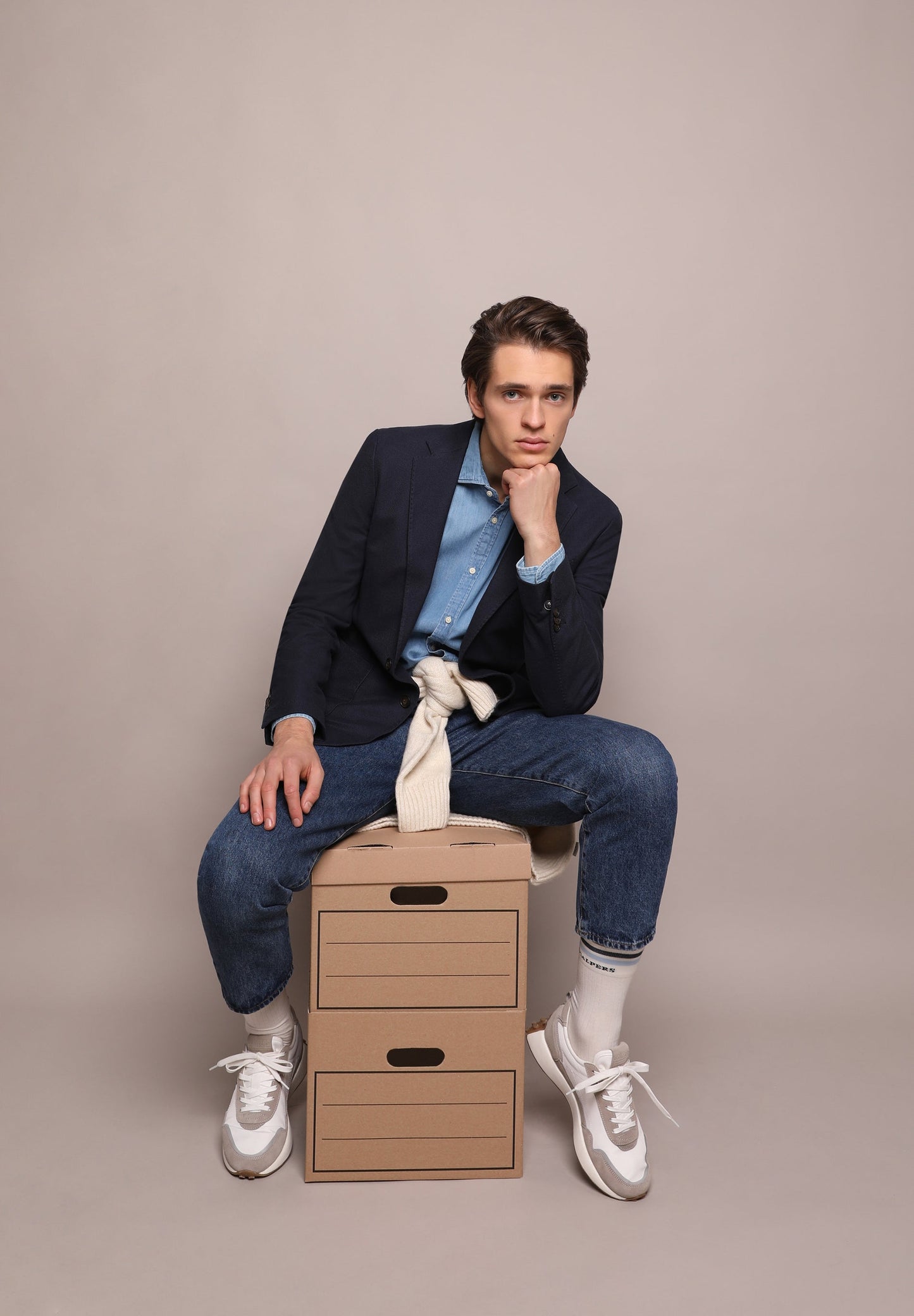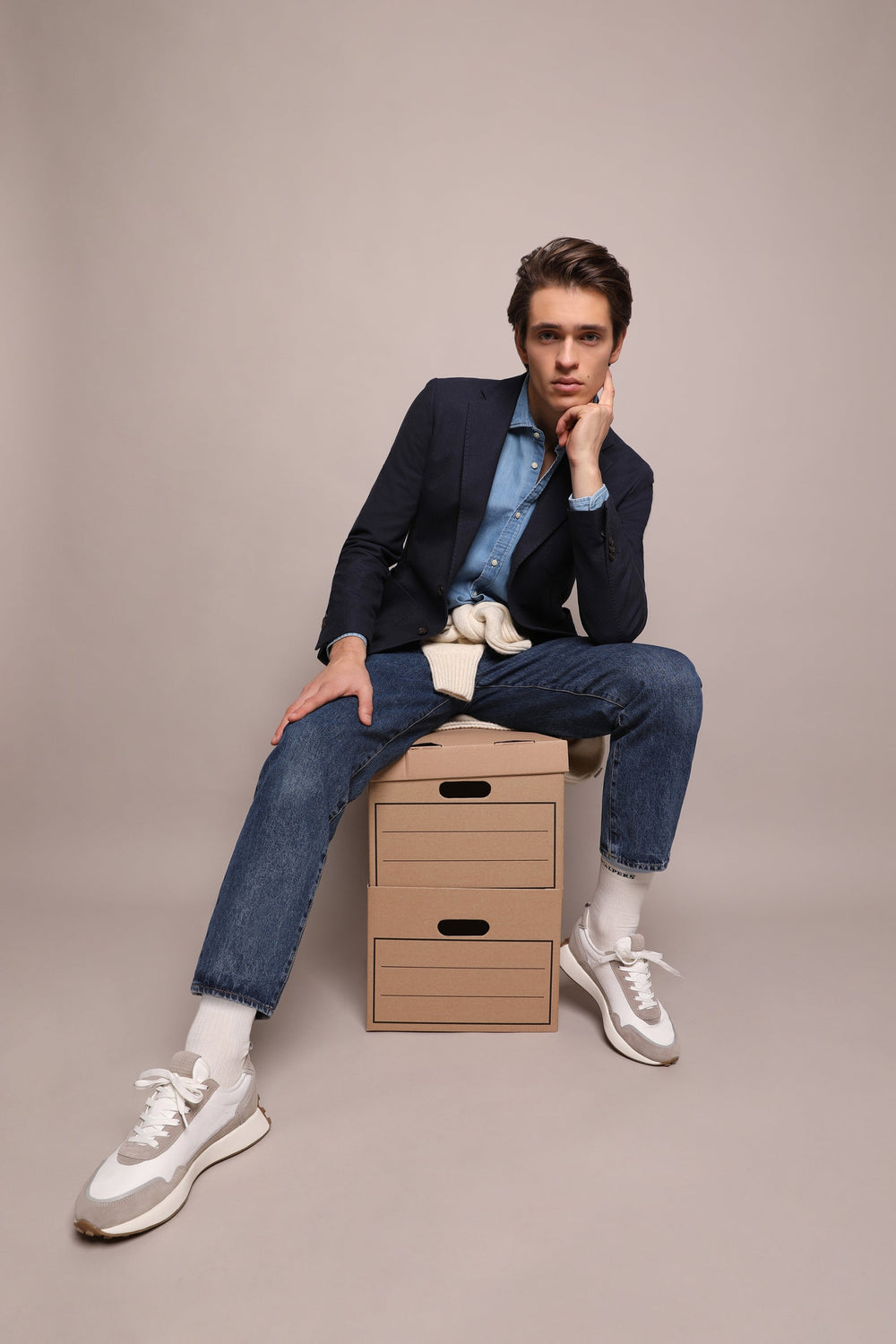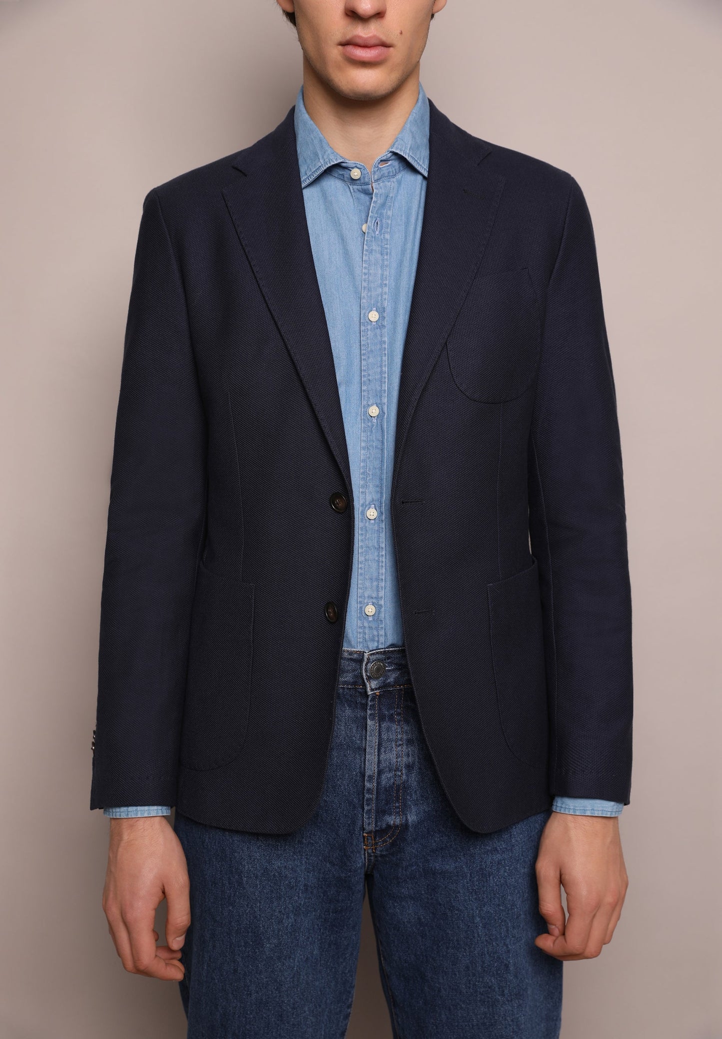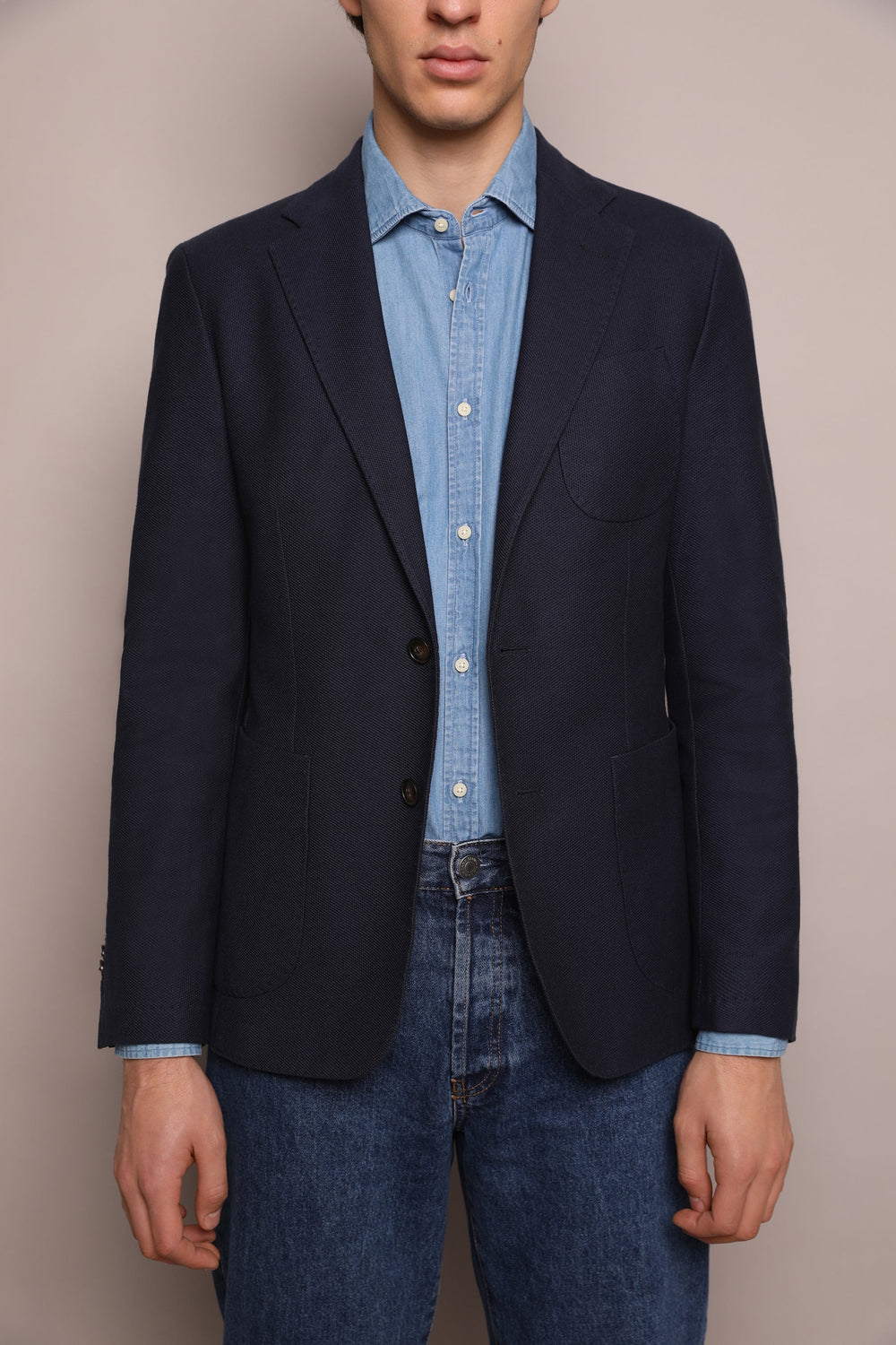 Americana confeccionada en tejido 100% algodón. Corte Slim Fit, cuello con solapas de muesca y cierre con dos botones. Manga larga terminada en puño con botones y bolsillos frontales de parche. Dos aberturas en la parte posterior.