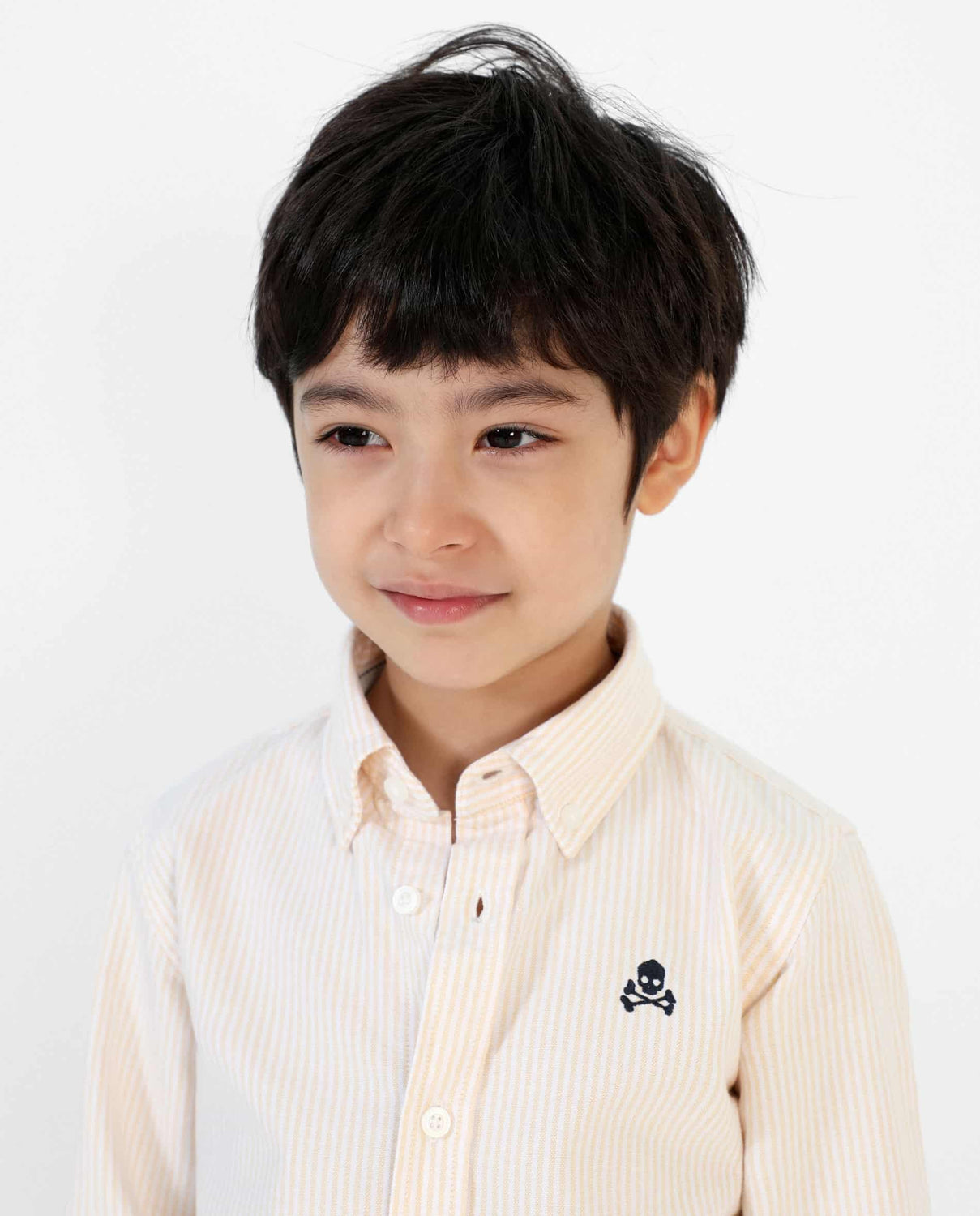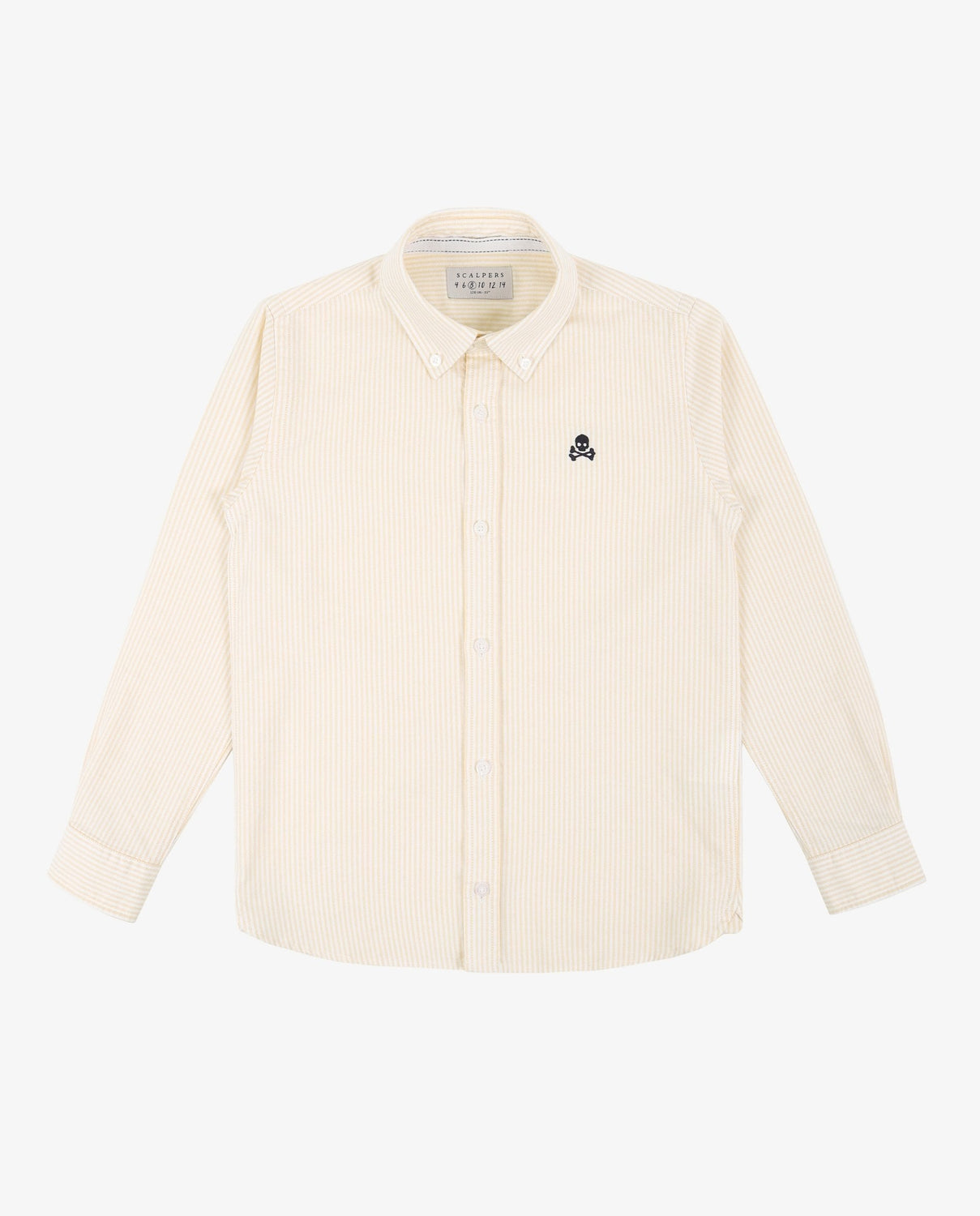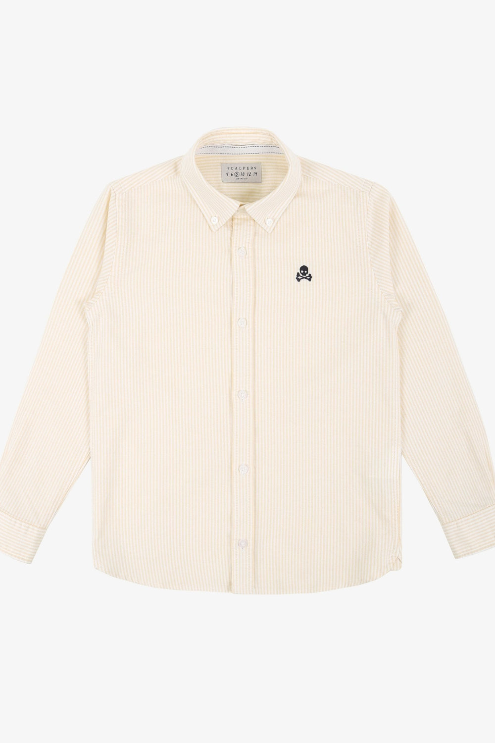Camisa oxford de rayas confeccionada en tejido 100% algodón. Corte Regular Fit, cuello con botones y cierre con botones. Manga larga terminada en puño y bordado de calavera a contraste en el pecho.