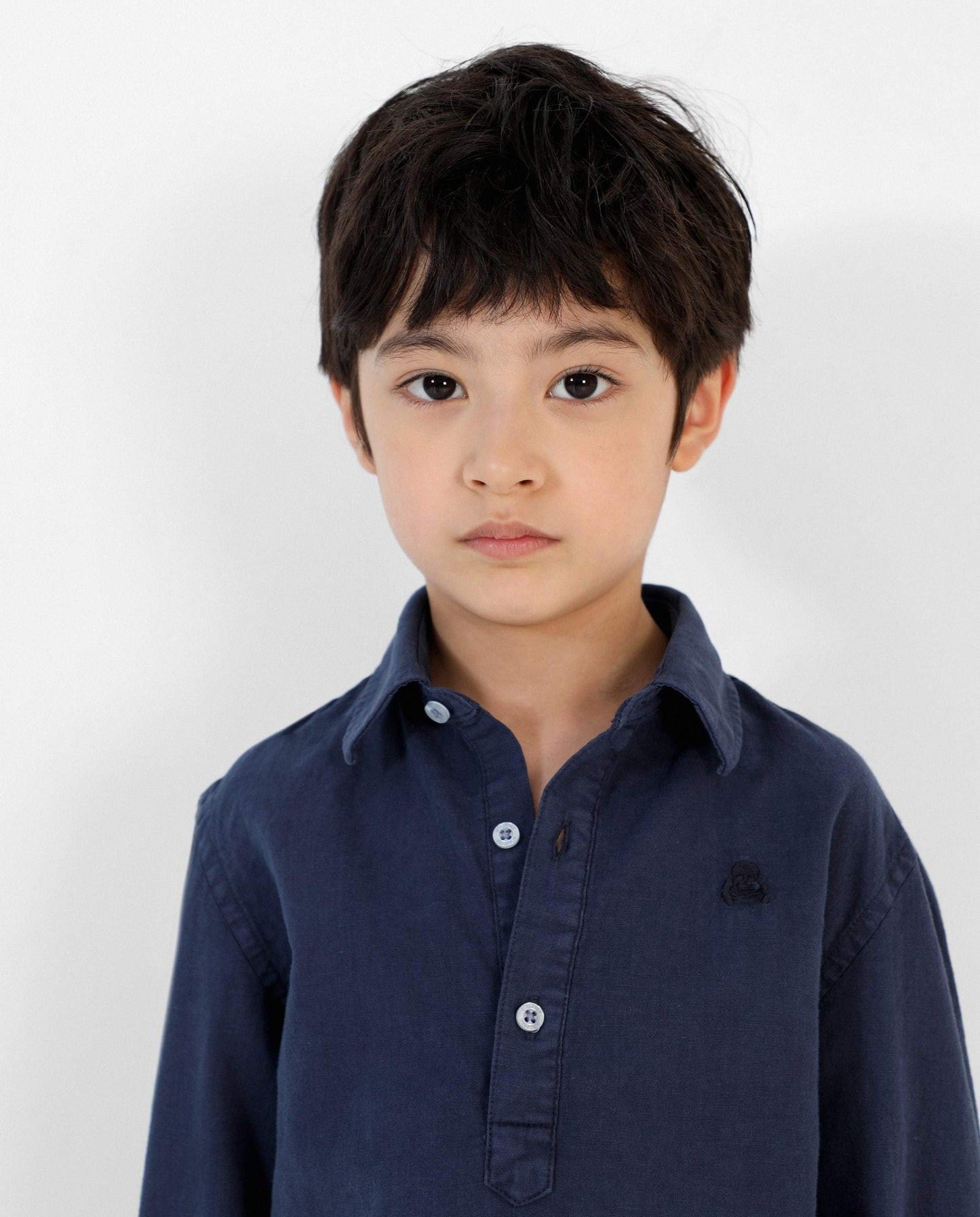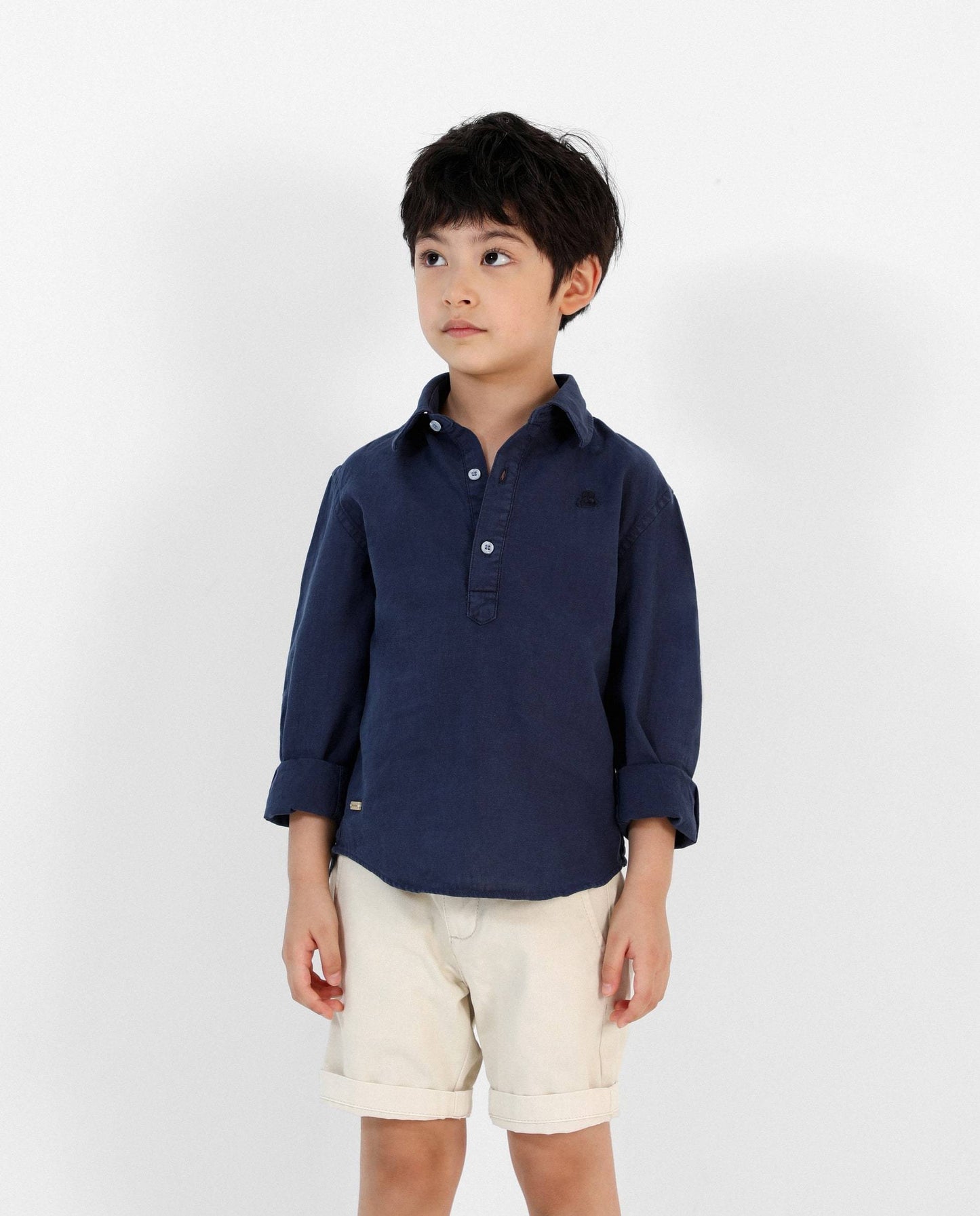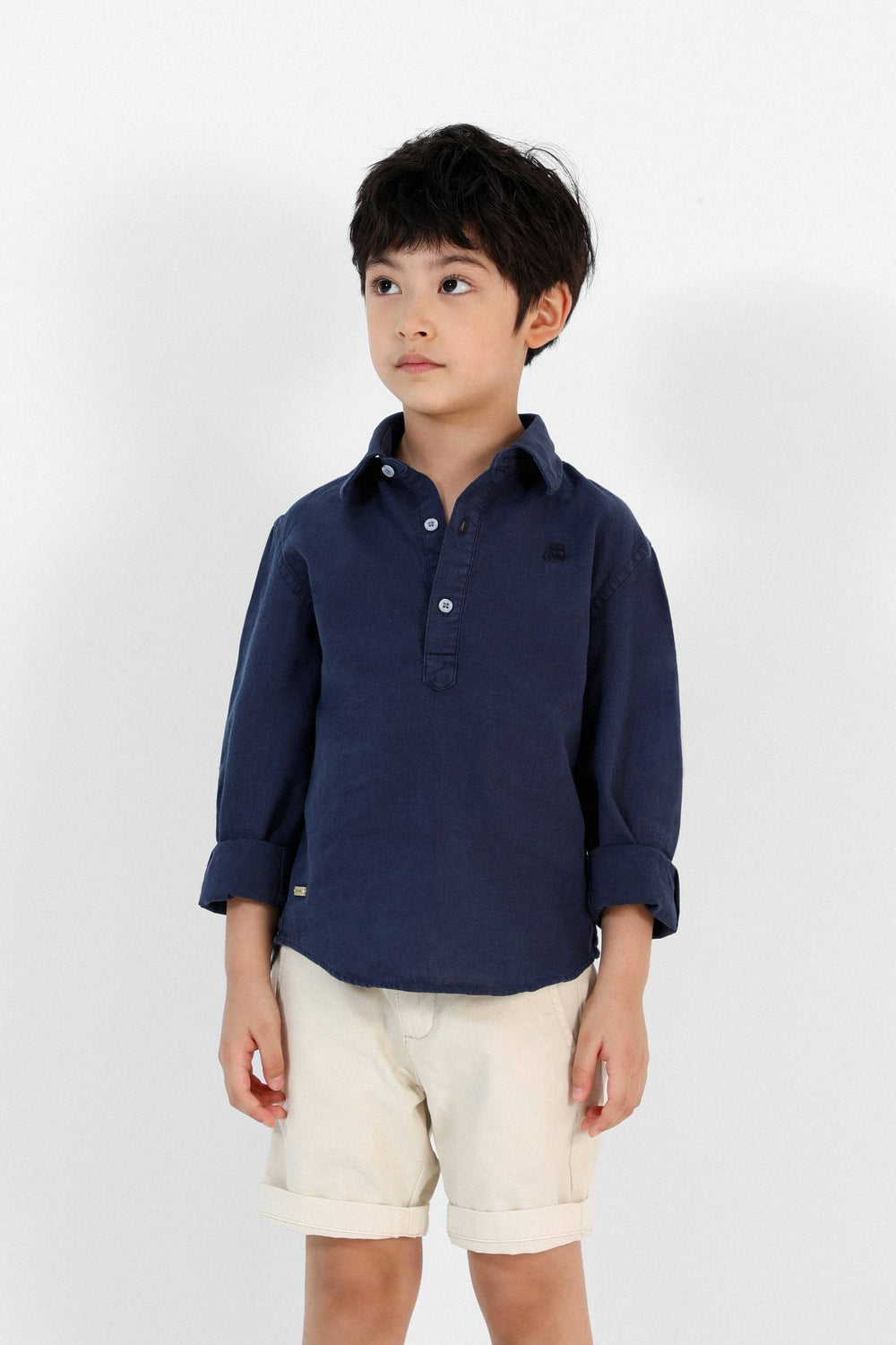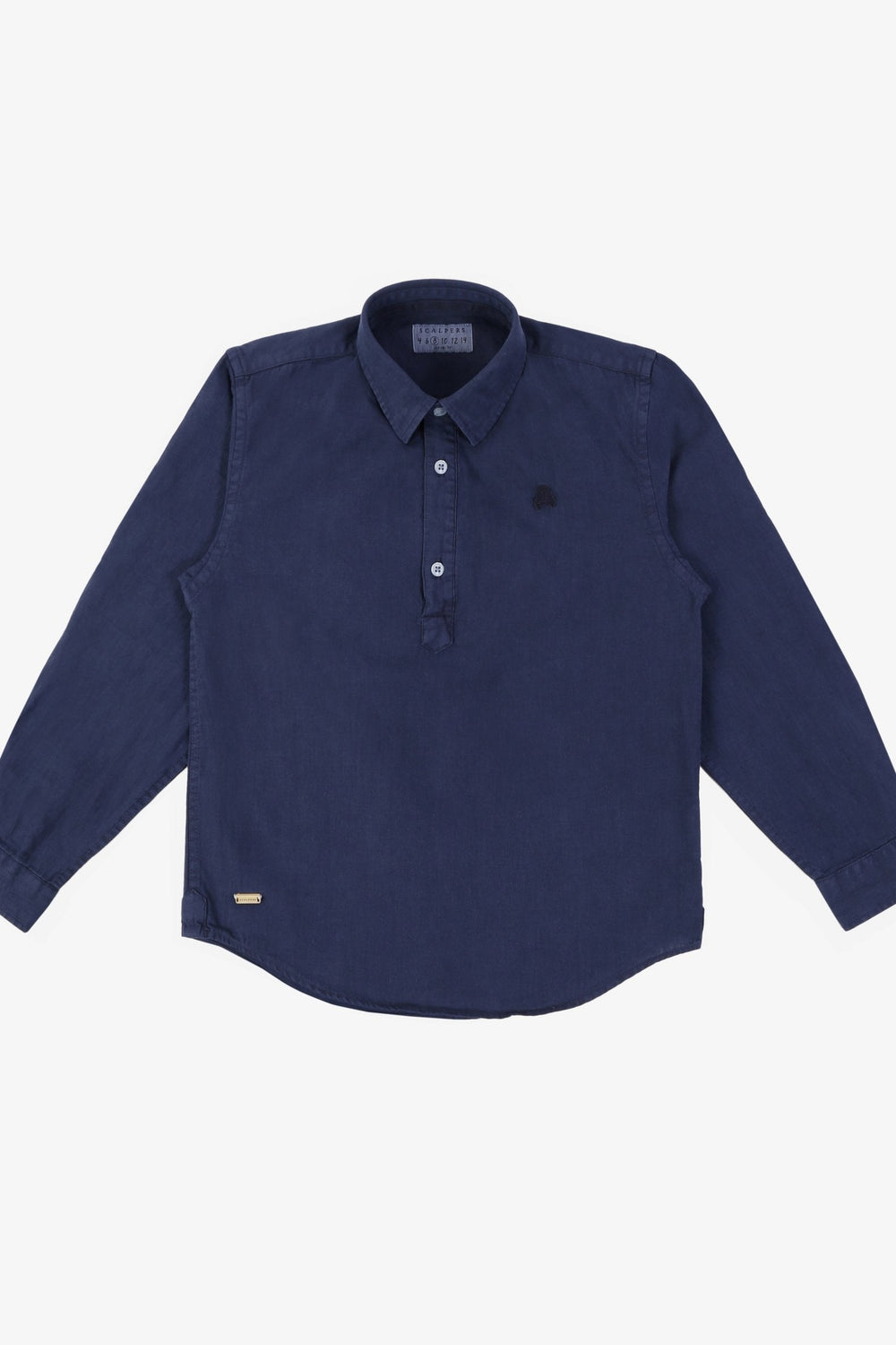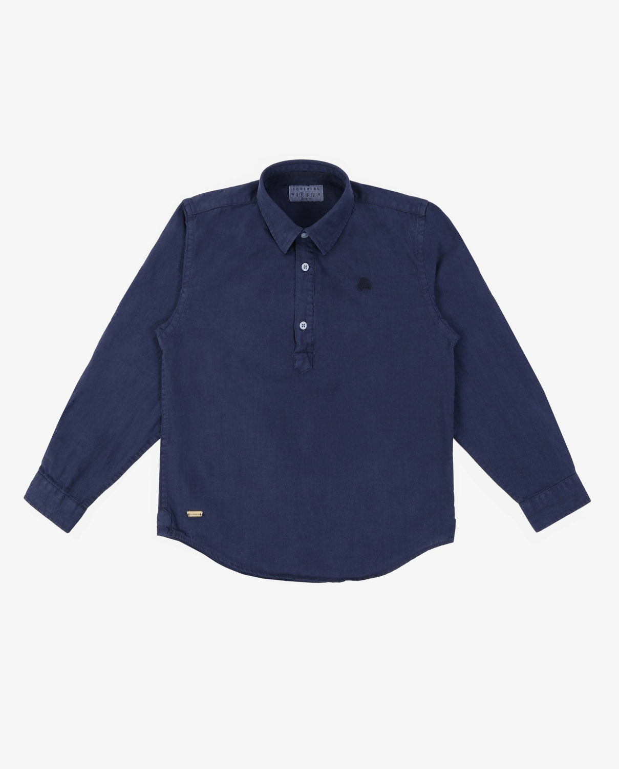Camisa polera confeccionada en tejido de algodón y lino. Corte Regular Fit, cuello italiano con ballenas y cierre con botones. Detalle de calavera bordada a tono.