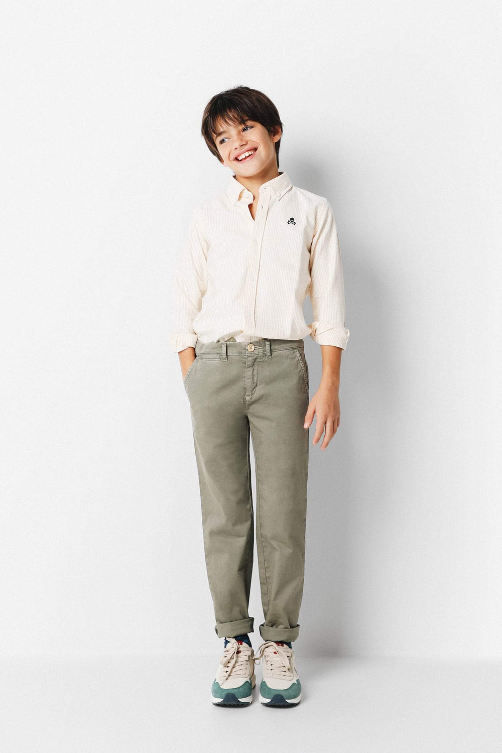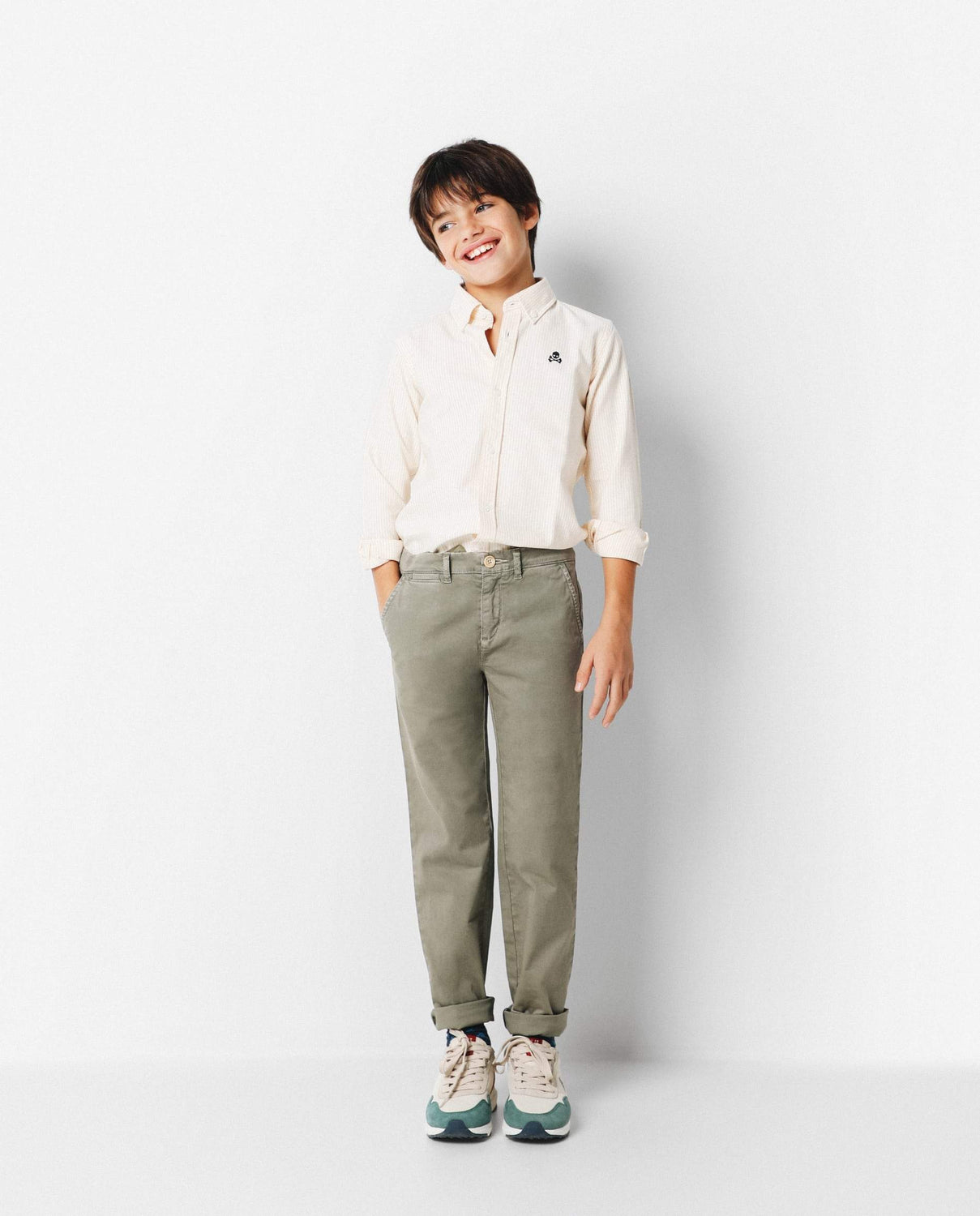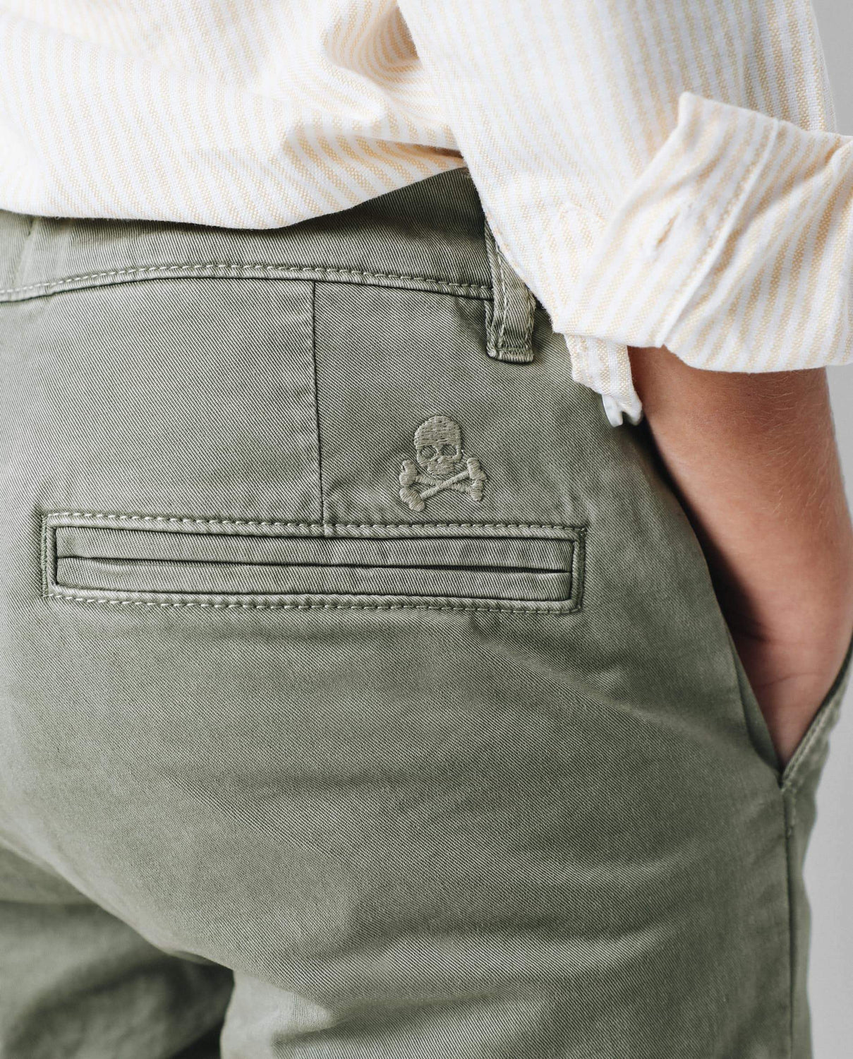 Pantalón chino confeccionado en tejido de algodón. Corte Regular Fit con cinturilla con ajustadores, cierre con botón y cremallera y bolsillos. Detalle de logo bordado en la parte trasera.