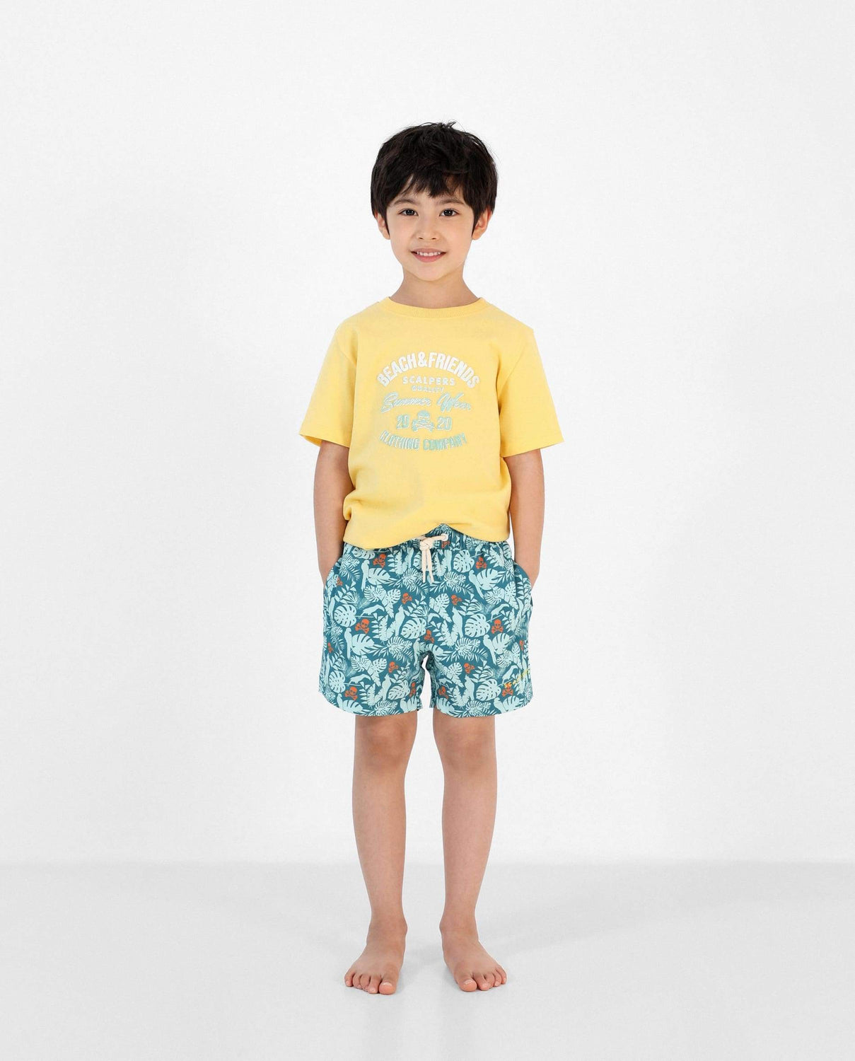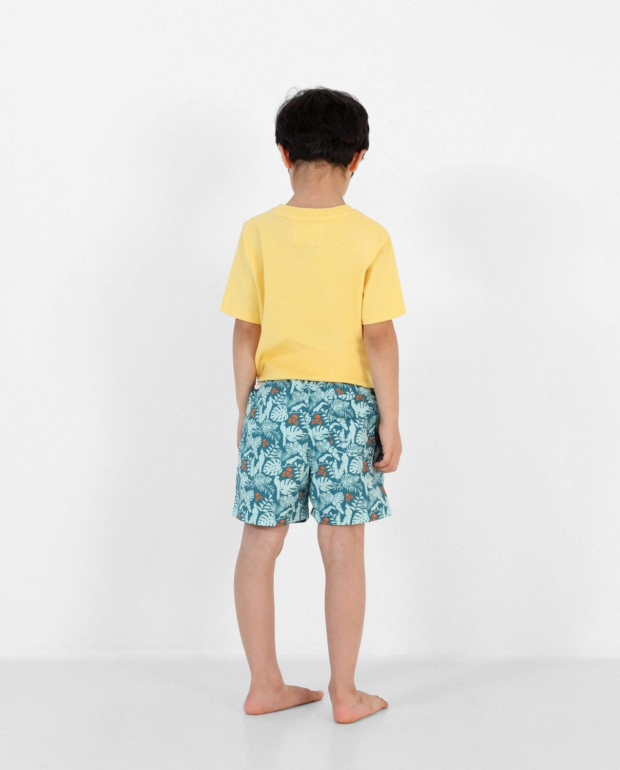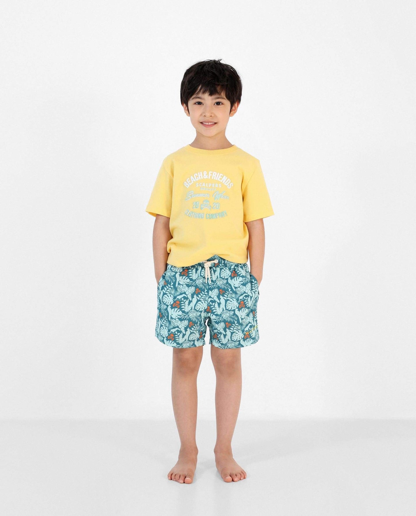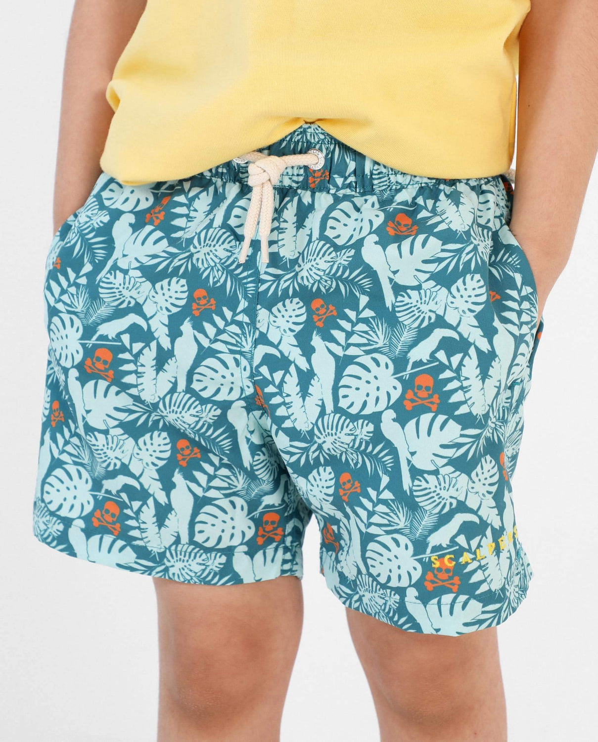 Bañador con estampado tropical confeccionado en tejido de secado rápido. Corte Regular Fit, cinturilla elástica ajustable con cordones. Bolsillos laterales y trasero con velcro. Detalle de bordado.