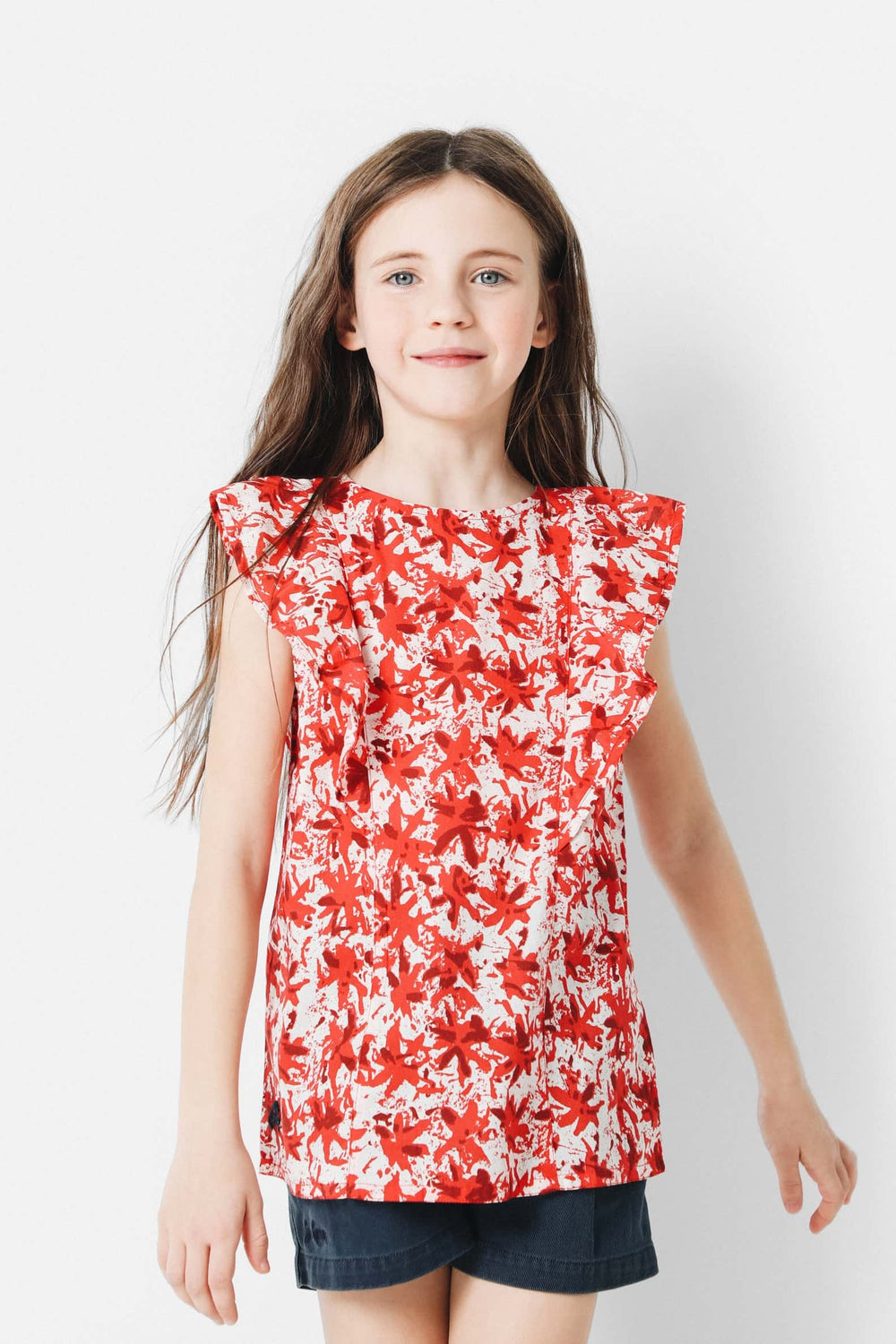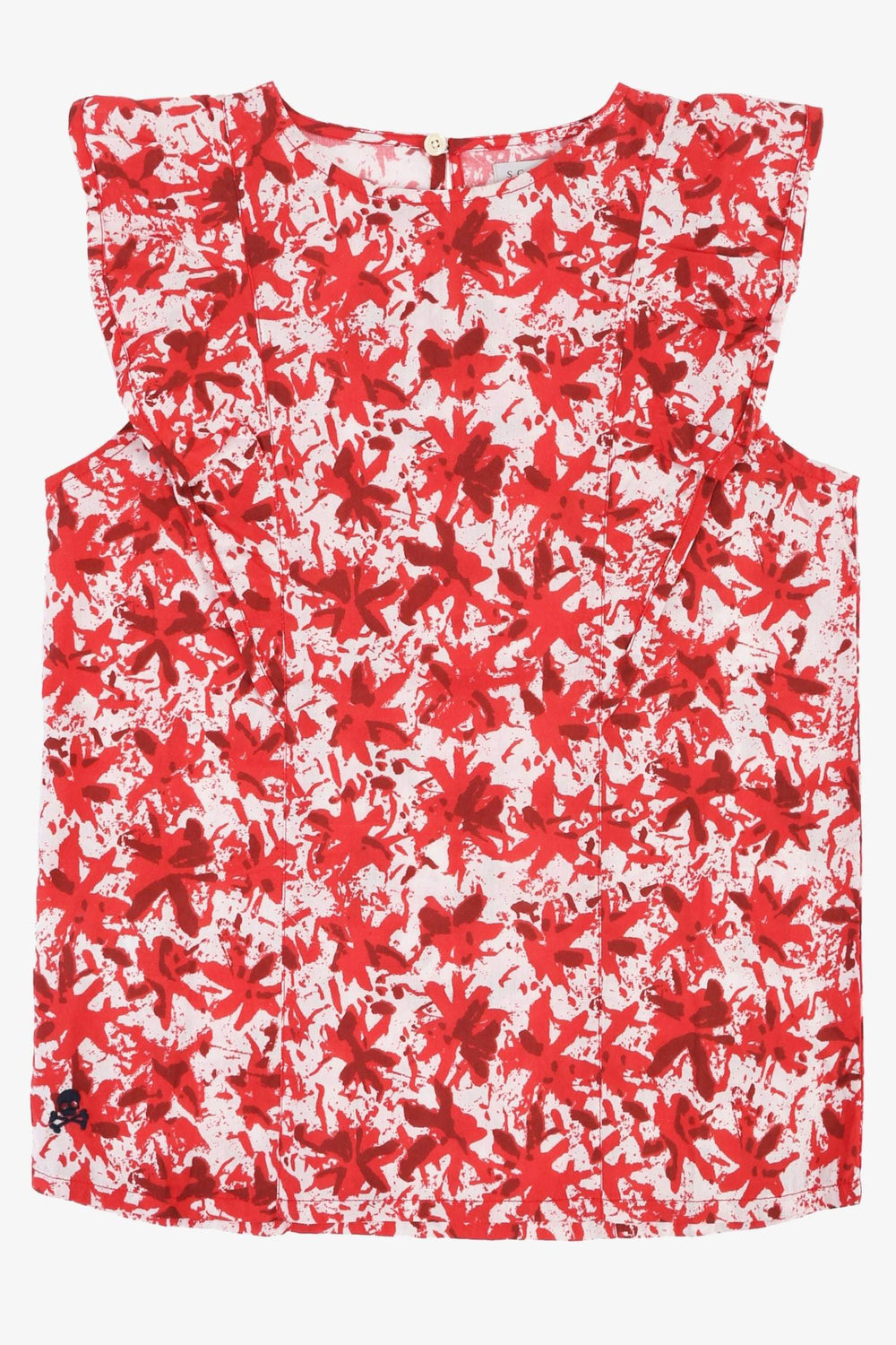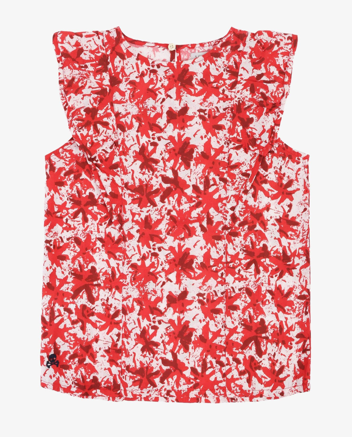 Blusa con estampado de flores confeccionada en tejido de algodón. Corte Regular Fit, cuello redondo y cierre trasero con botón. Manga en sisa con detalle de volantes y detalle de calavera bordada.