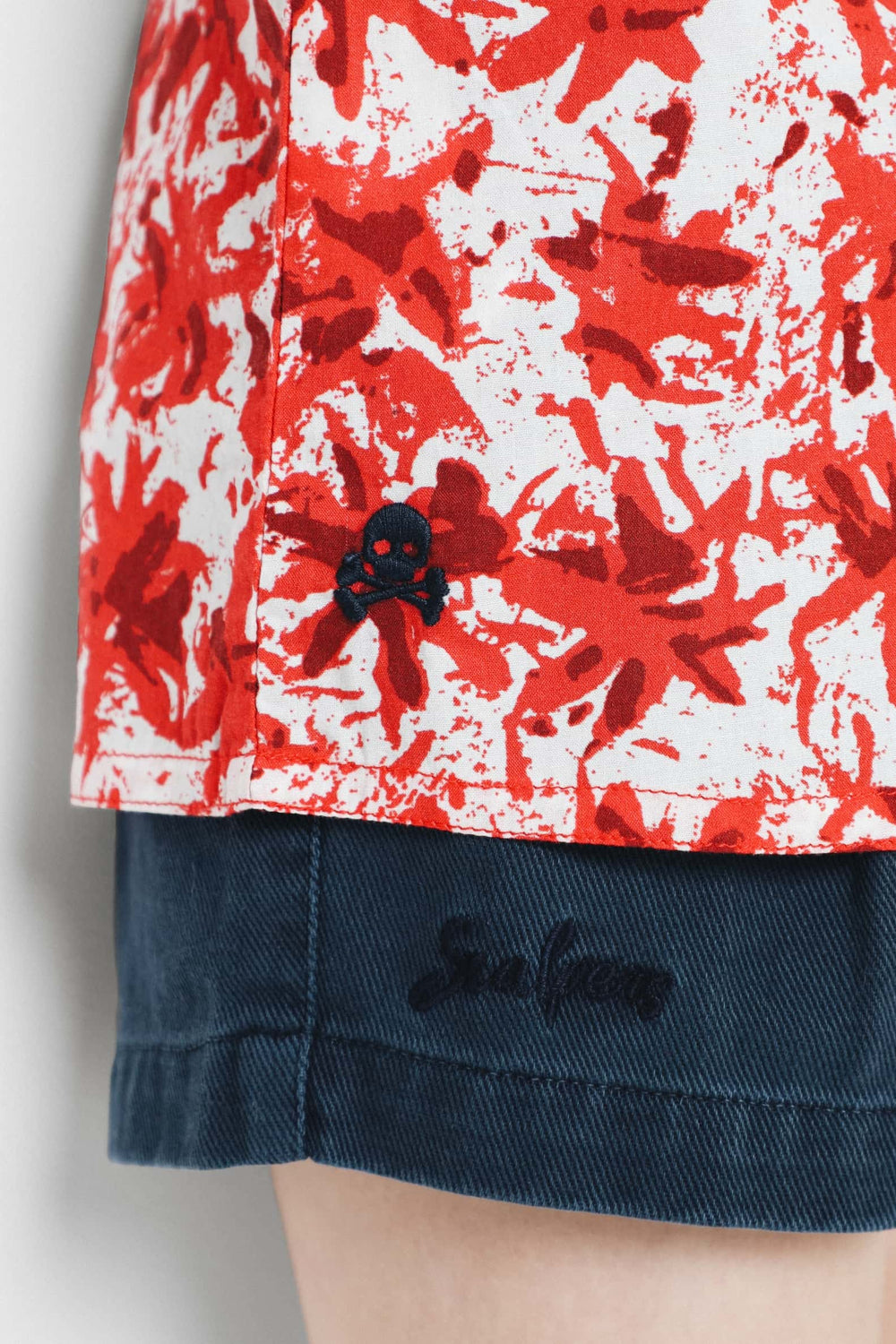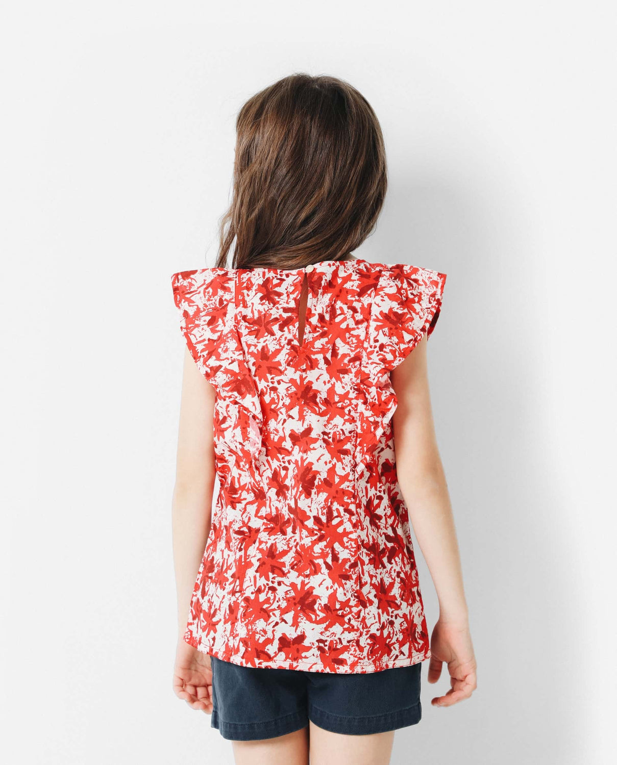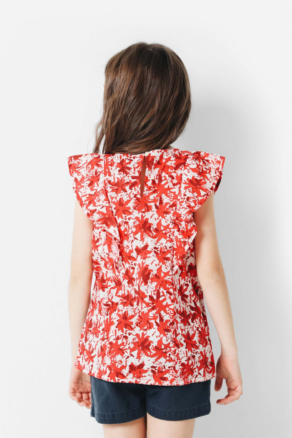 Blusa con estampado de flores confeccionada en tejido de algodón. Corte Regular Fit, cuello redondo y cierre trasero con botón. Manga en sisa con detalle de volantes y detalle de calavera bordada.