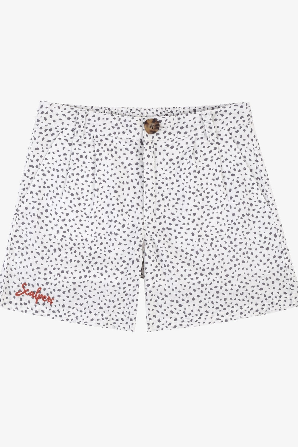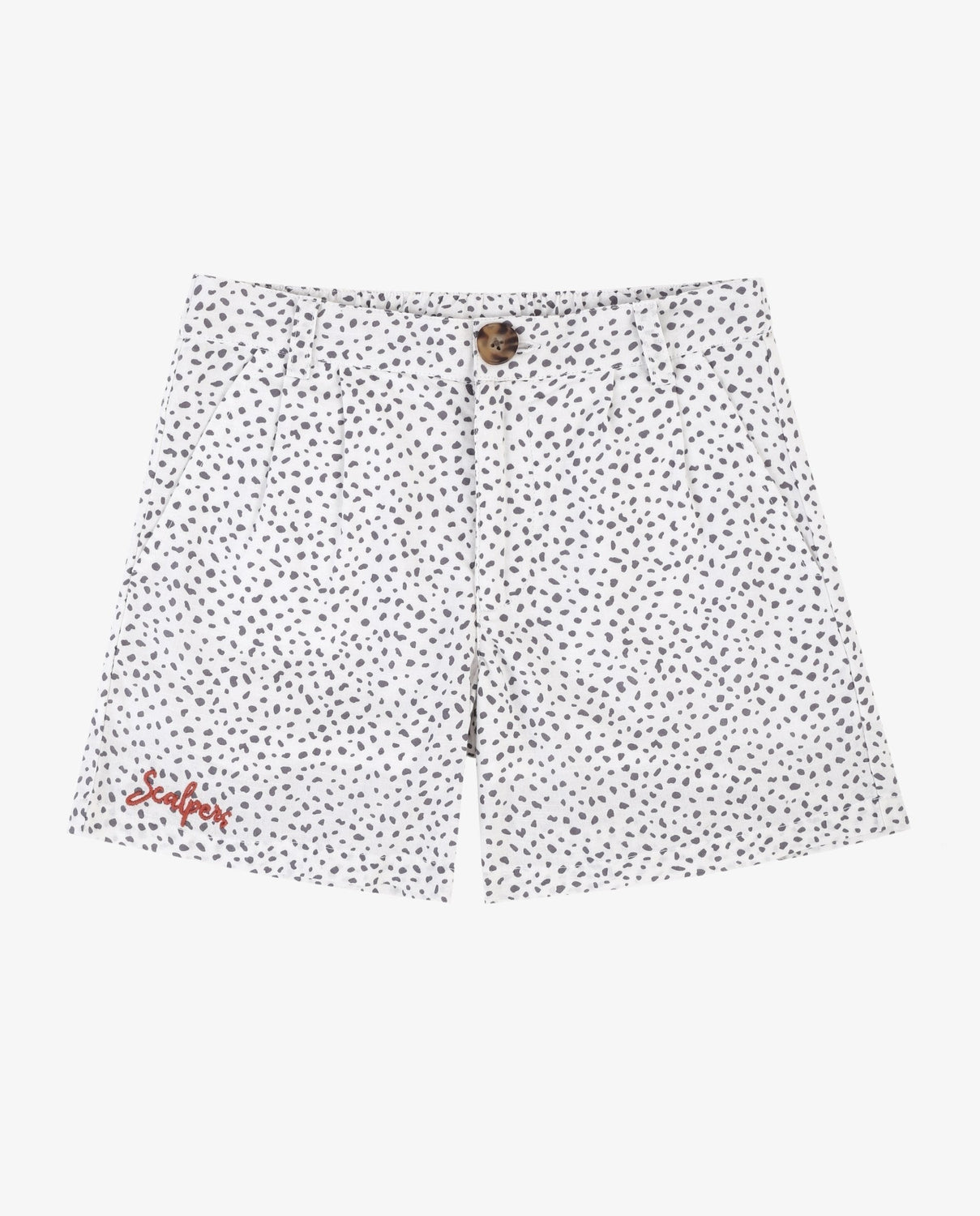 Bermudas con animal print confeccionada en tejido de voile. Corte Regular Fit con pinzas y cinturilla elástica y cierre con cremallera oculta por tapeta y botón. Detalle de calavera bordada a contraste en el bajo.