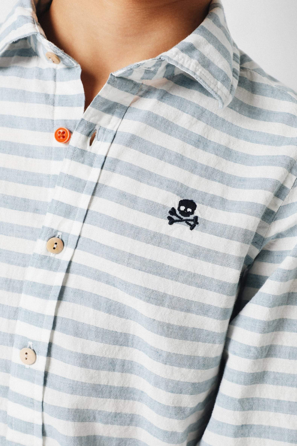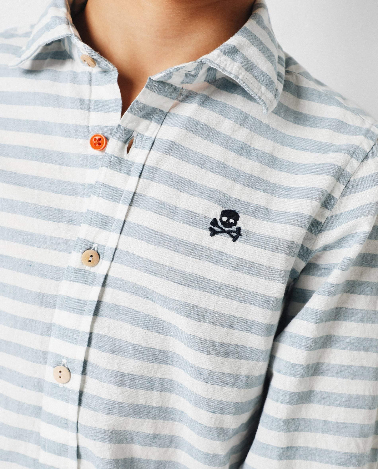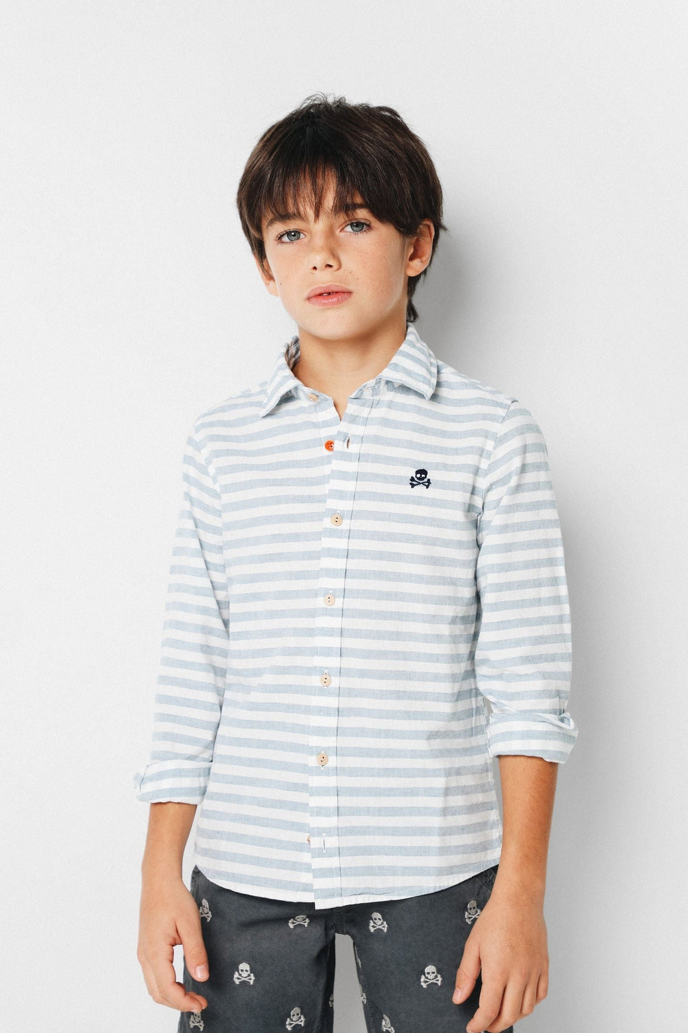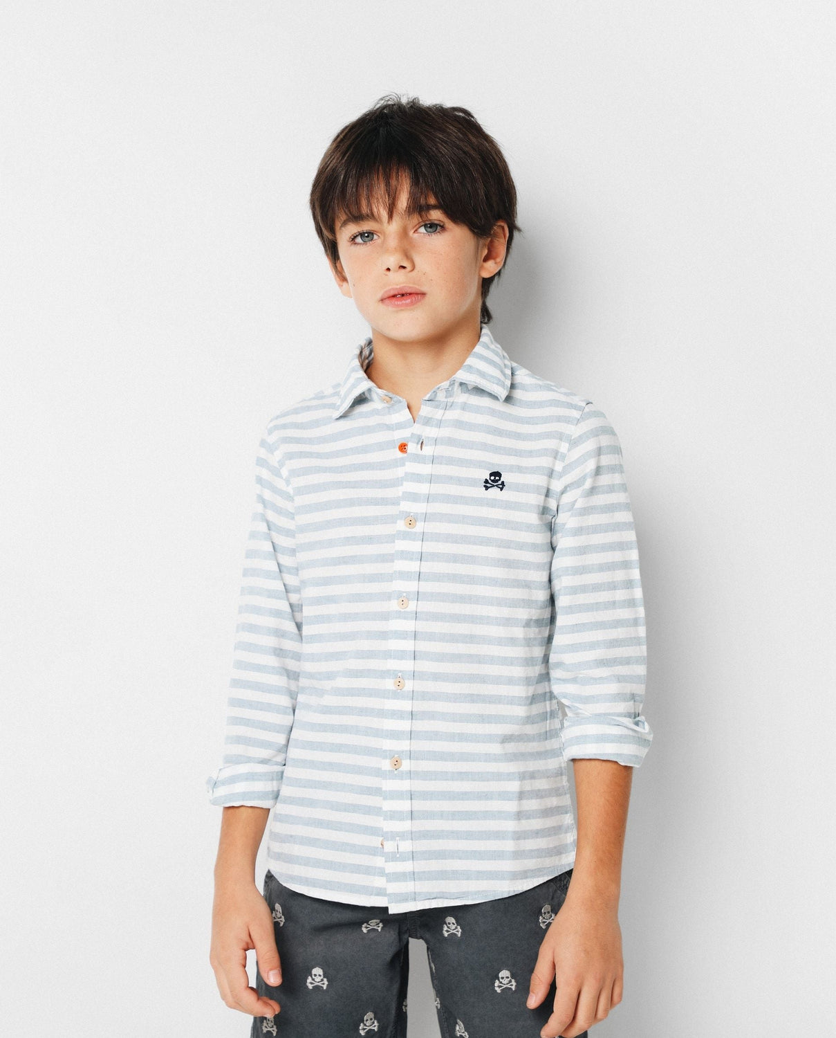 Camisa de rayas confeccionada en tejido de lino. Corte Regular Fit, cuello italiano y cierre con botones. Manga larga terminada en puño. Detalle de calavera a contraste en el pecho.