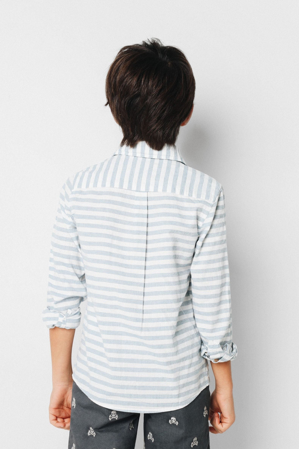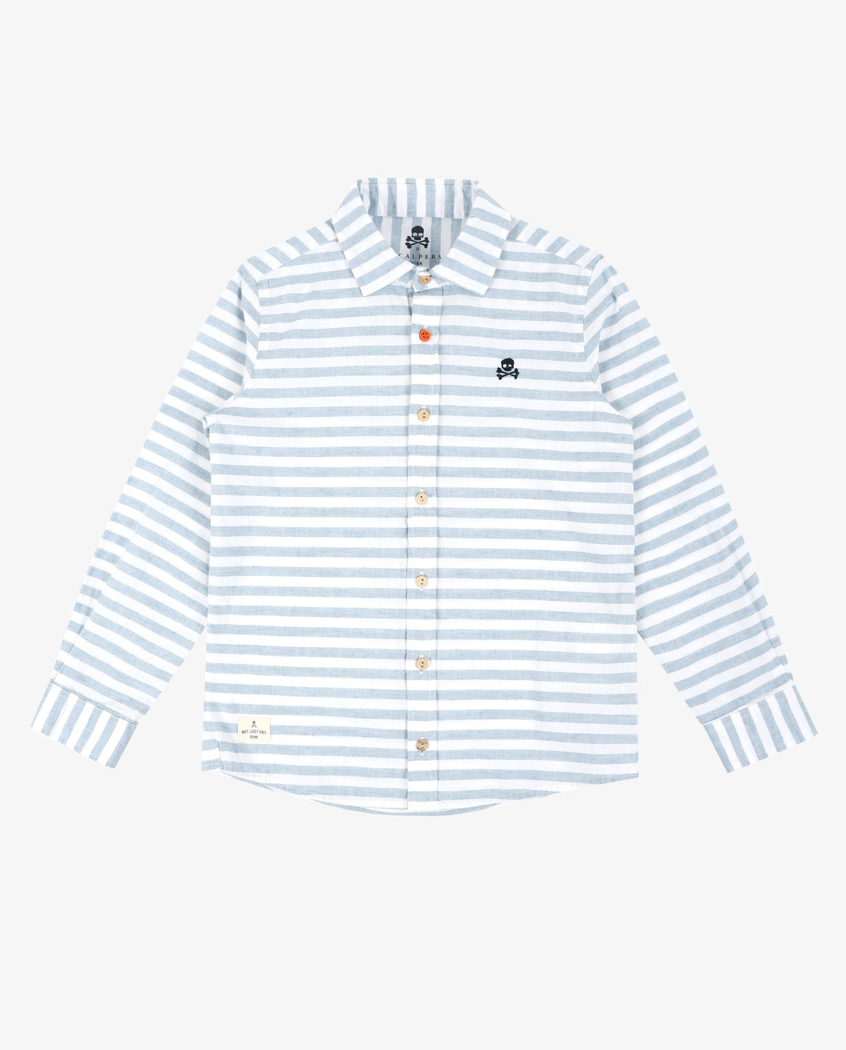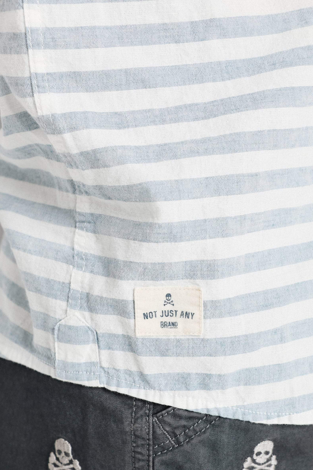 Camisa de rayas confeccionada en tejido de lino. Corte Regular Fit, cuello italiano y cierre con botones. Manga larga terminada en puño. Detalle de calavera a contraste en el pecho.