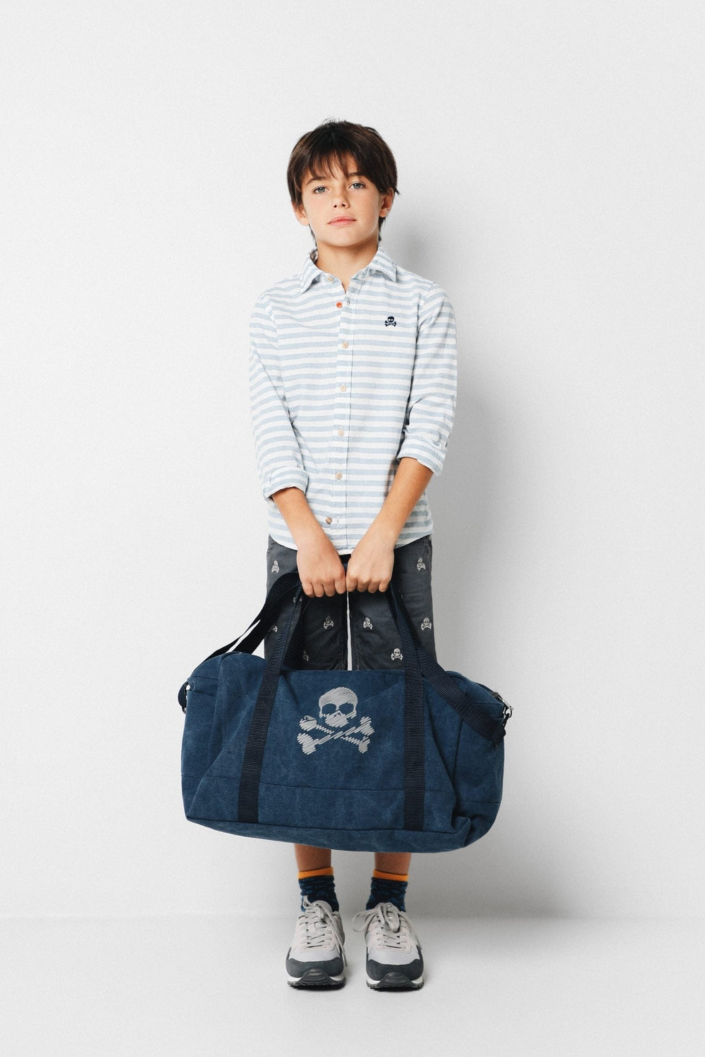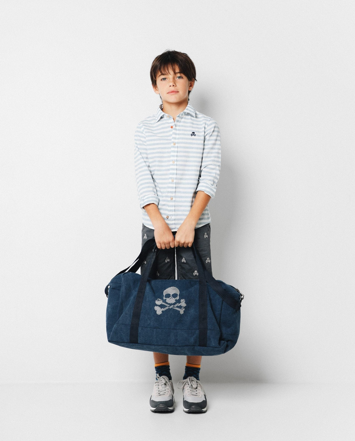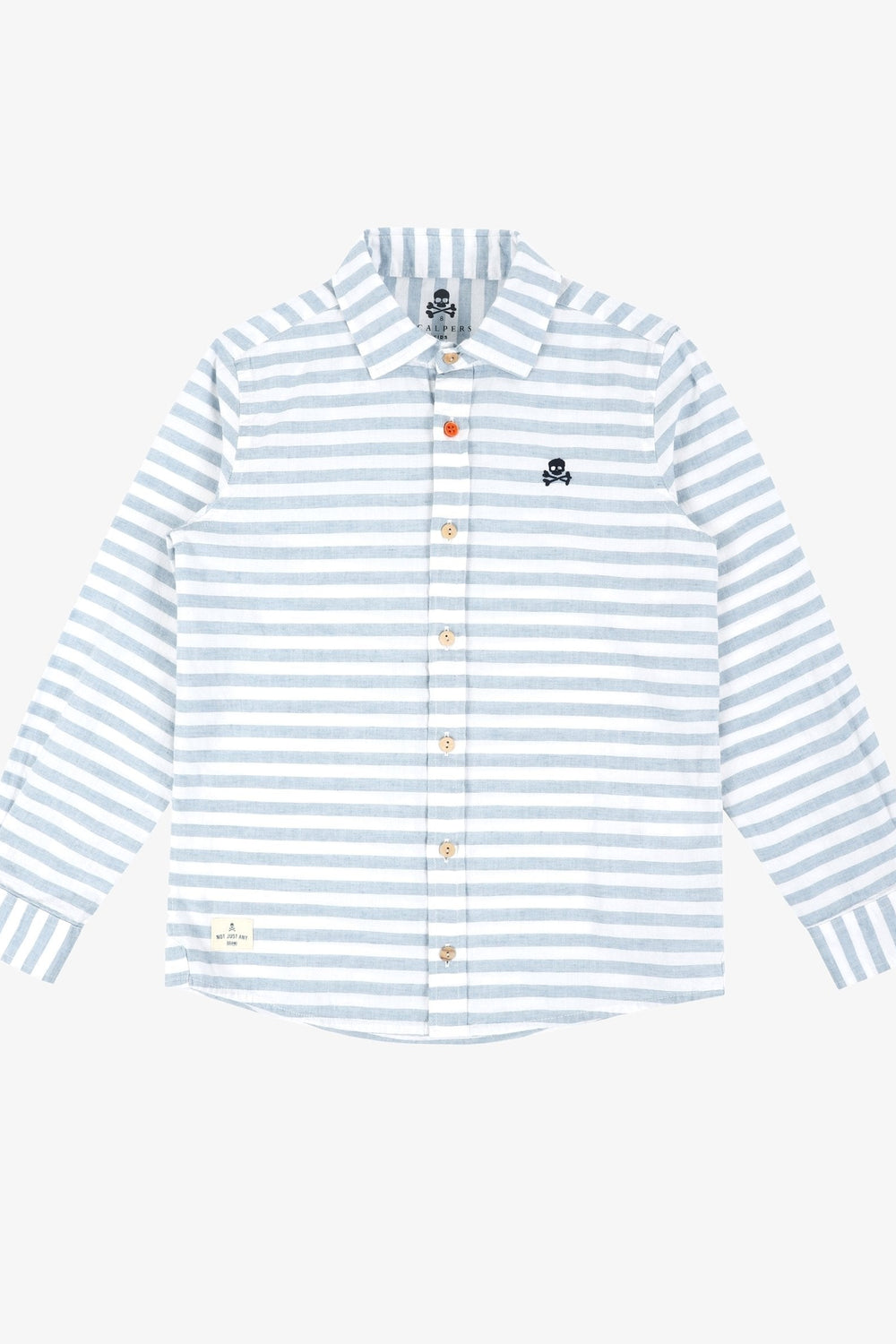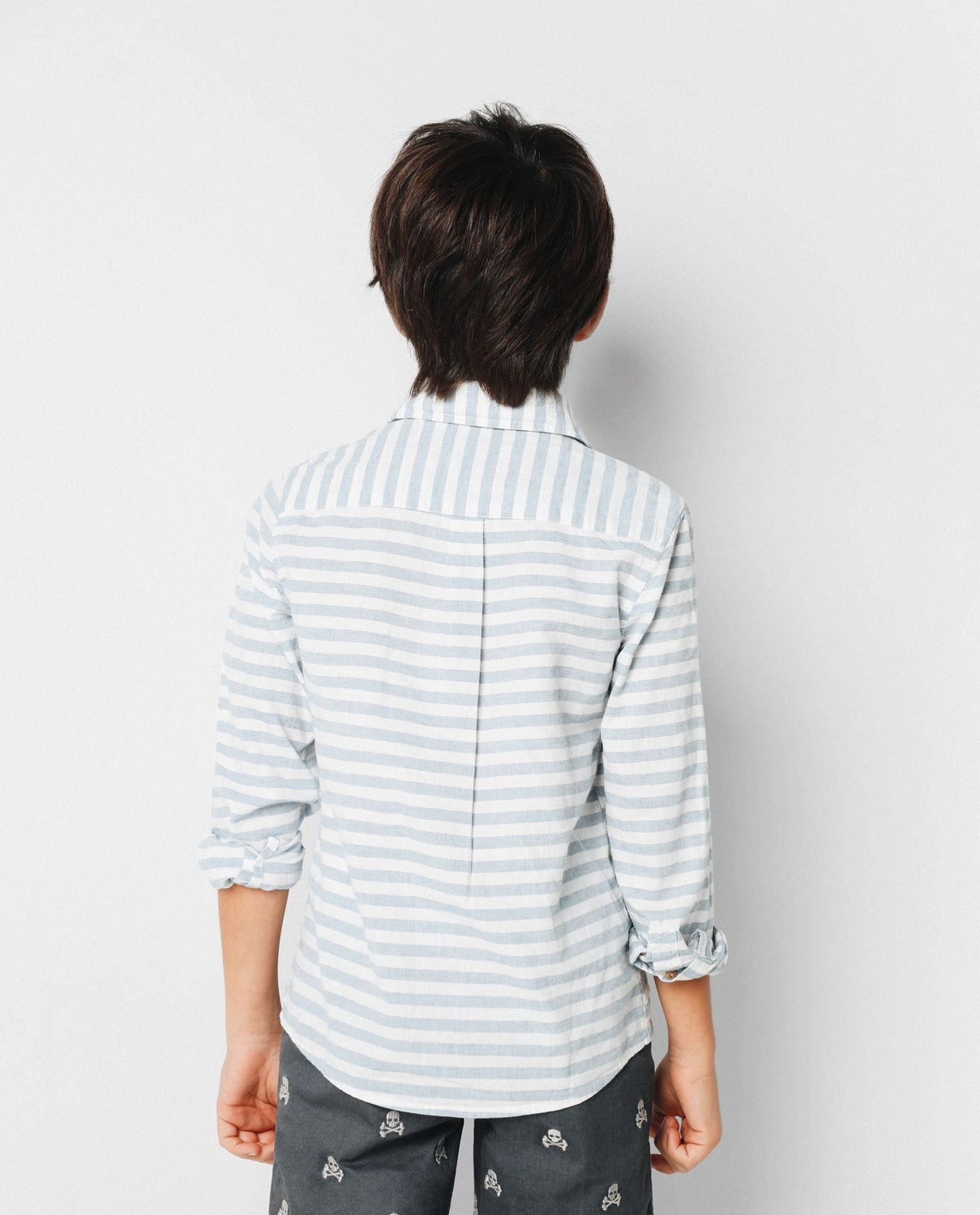 Camisa de rayas confeccionada en tejido de lino. Corte Regular Fit, cuello italiano y cierre con botones. Manga larga terminada en puño. Detalle de calavera a contraste en el pecho.