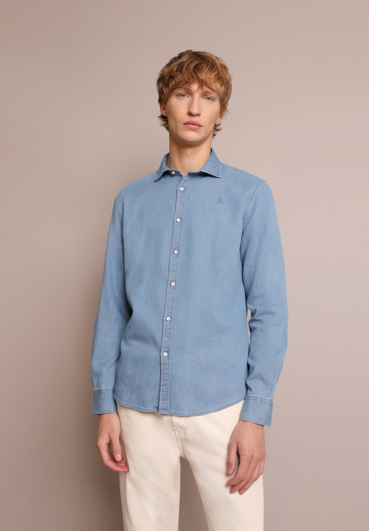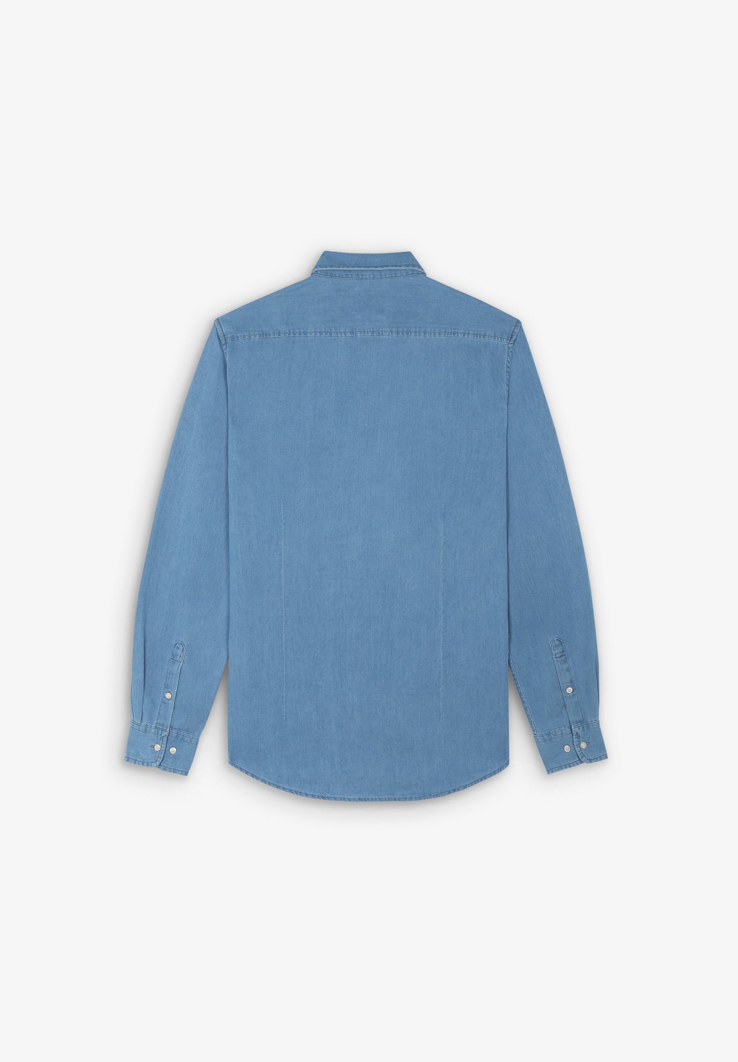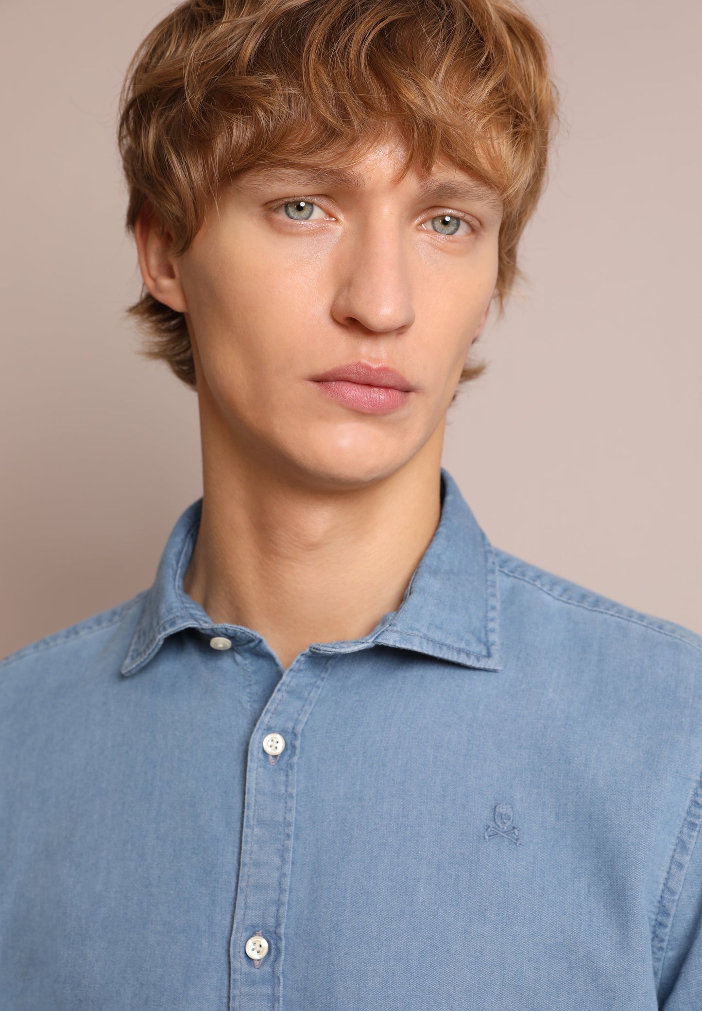 Camisa denim confeccionada en tejido 100% algodón. Corte Slim Fit, cuello italiano con ballenas y cierre con botones. Manga larga terminada en puño y detalle de calavera bordada a tono en el pecho.