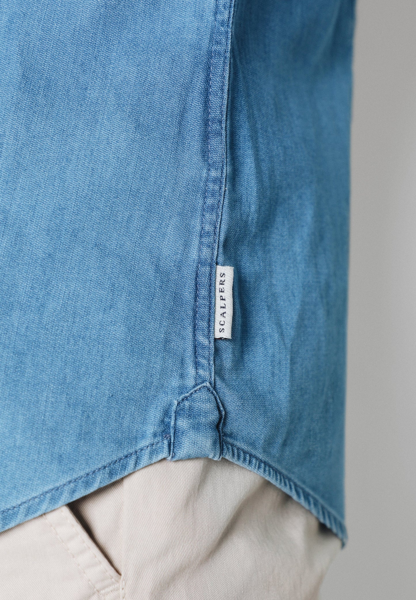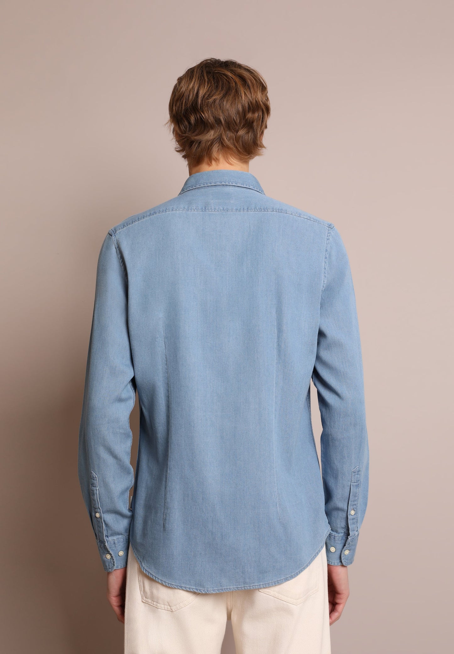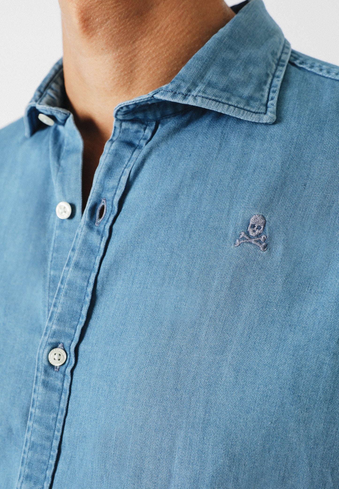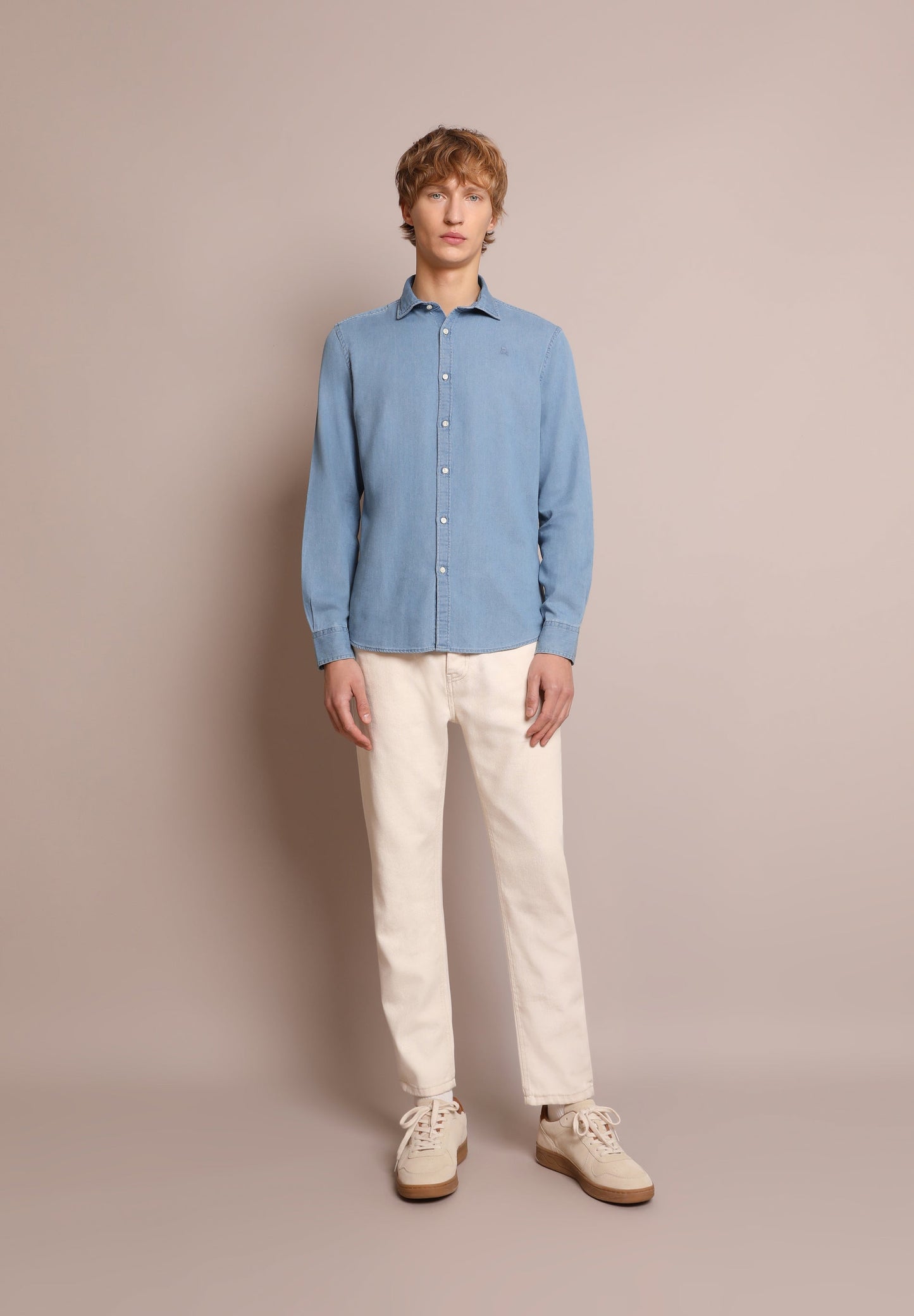 Camisa denim confeccionada en tejido 100% algodón. Corte Slim Fit, cuello italiano con ballenas y cierre con botones. Manga larga terminada en puño y detalle de calavera bordada a tono en el pecho.