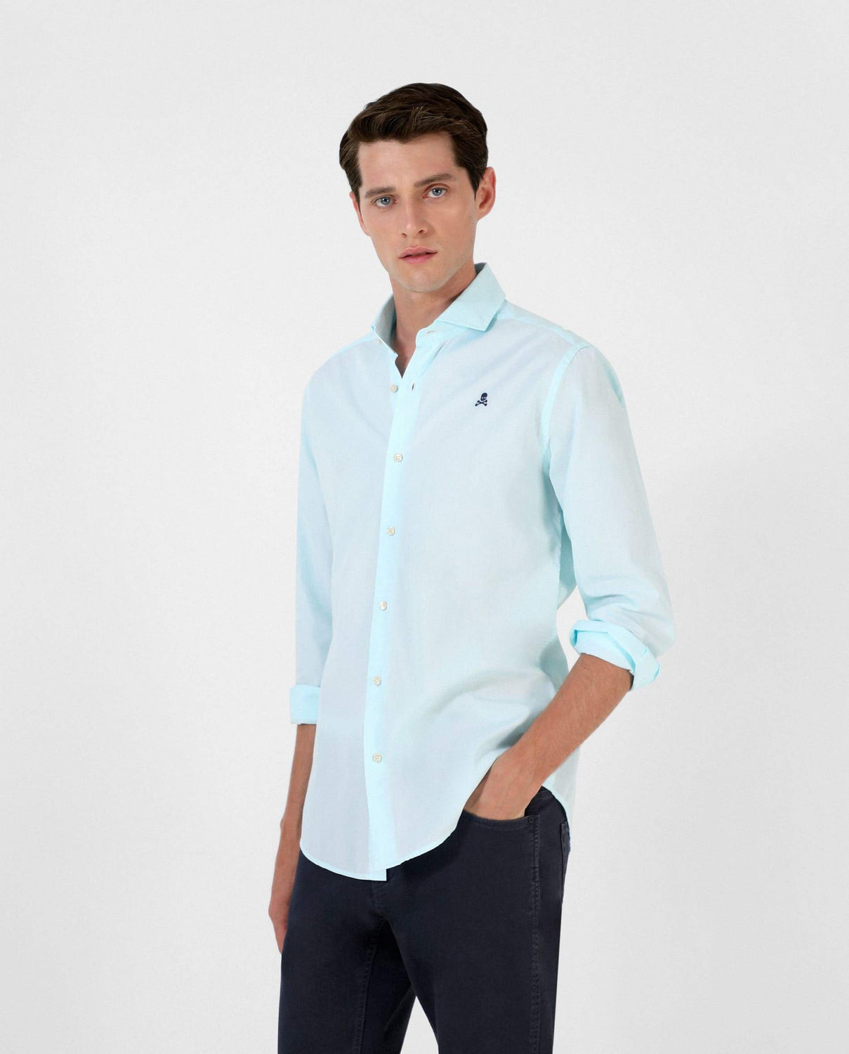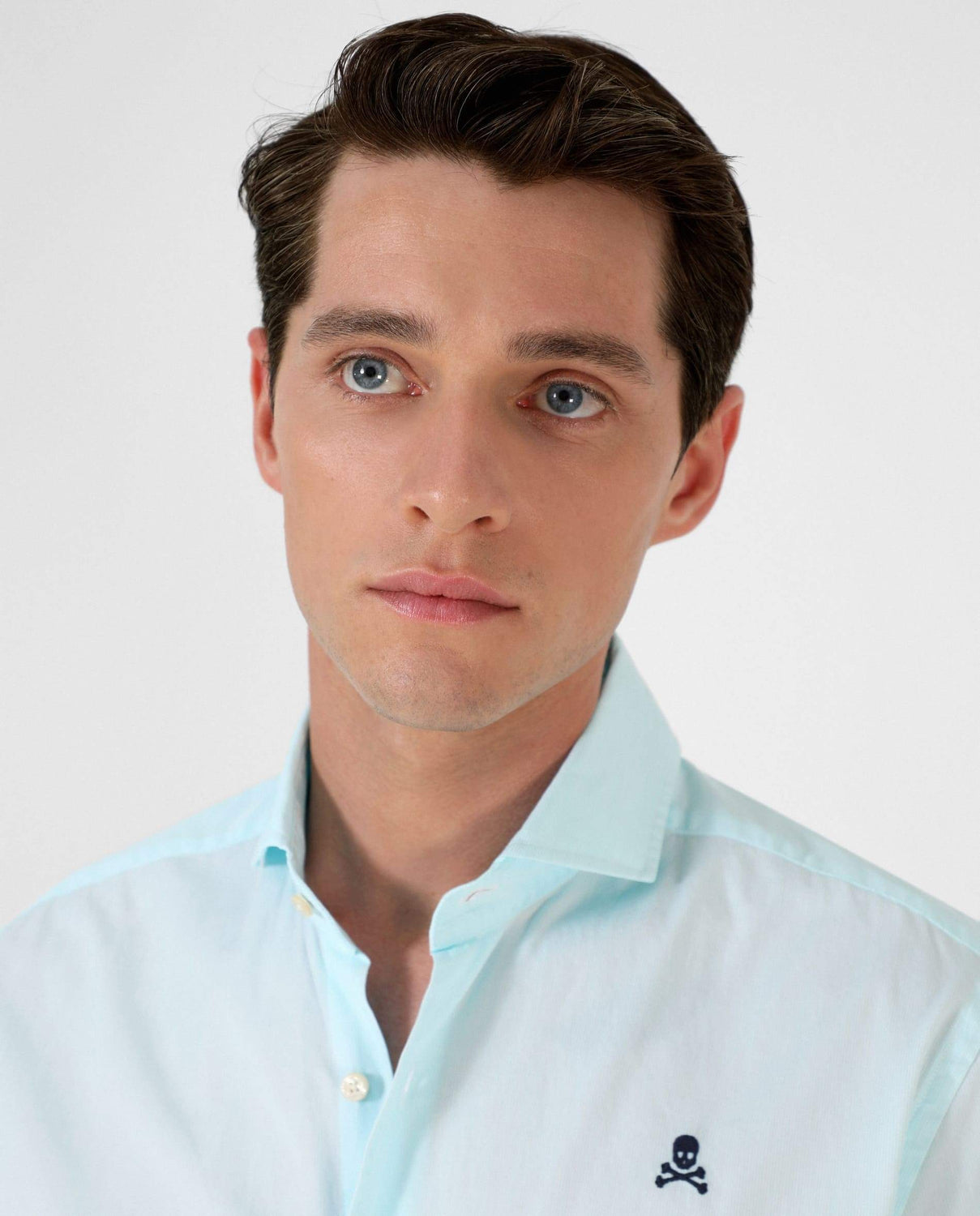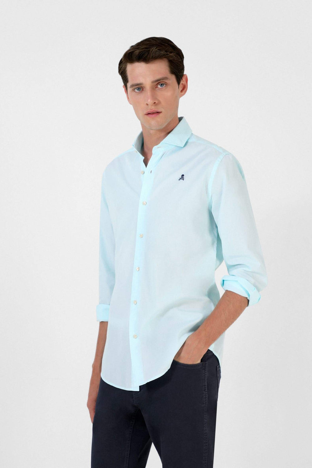Camisa confeccionada en tejido 100% algodón. Corte Regular Fit, cuello cutaway y cierre con botones. Manga larga terminada en puño simple y detalle de calavera bordada en el pecho.