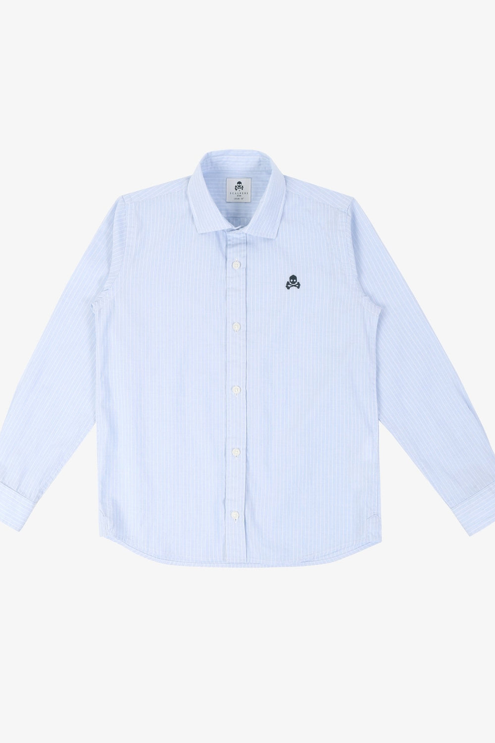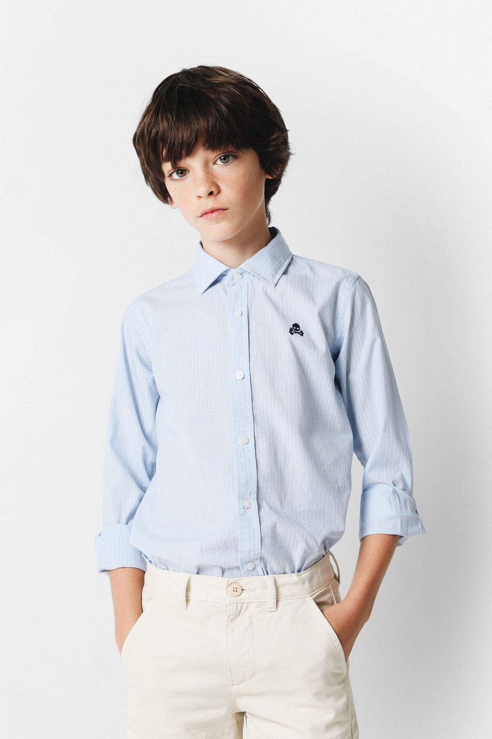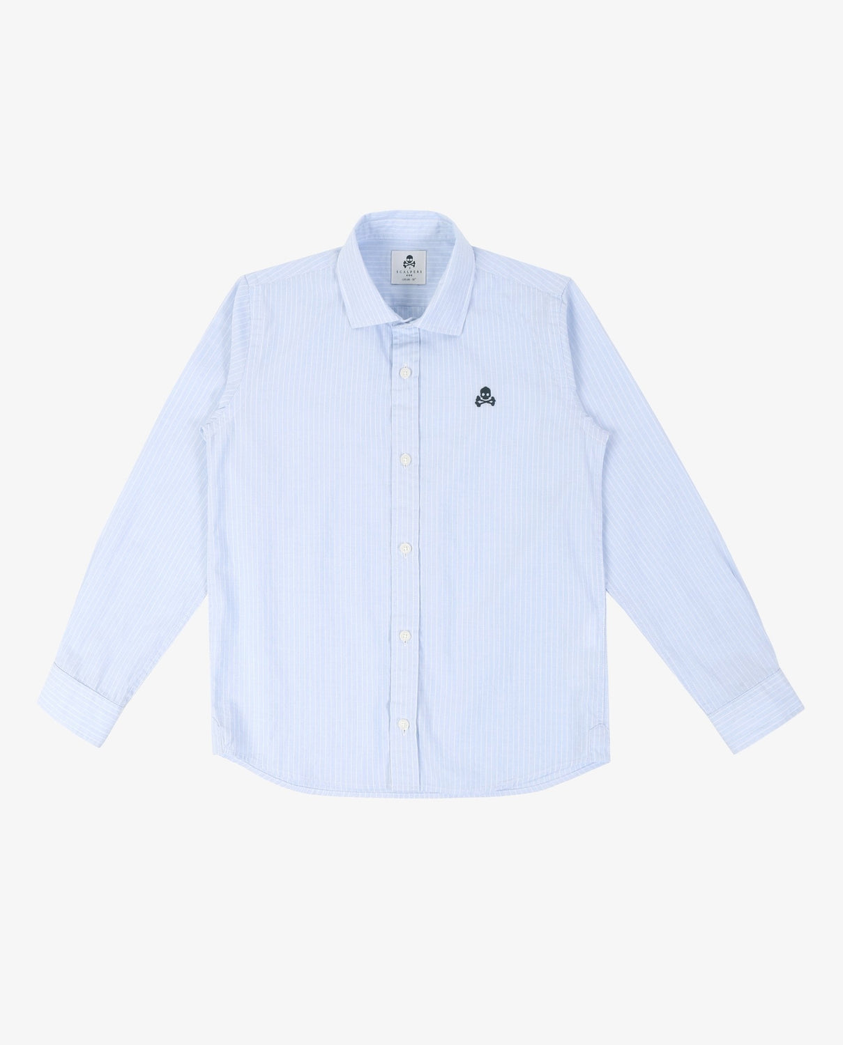 Camisa de rayas de vestir confeccionada en tejido 100% algodón. Corte Regular Fit, cuello cutaway sin ballenas y cierre con botones. Detalle de bordado de calavera a contraste.