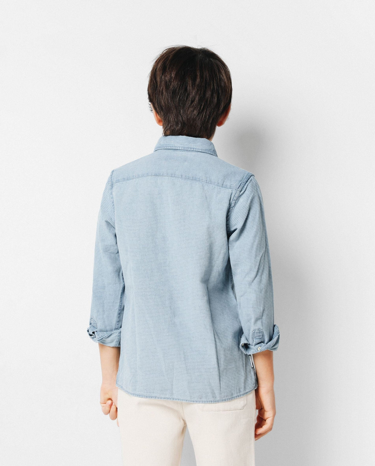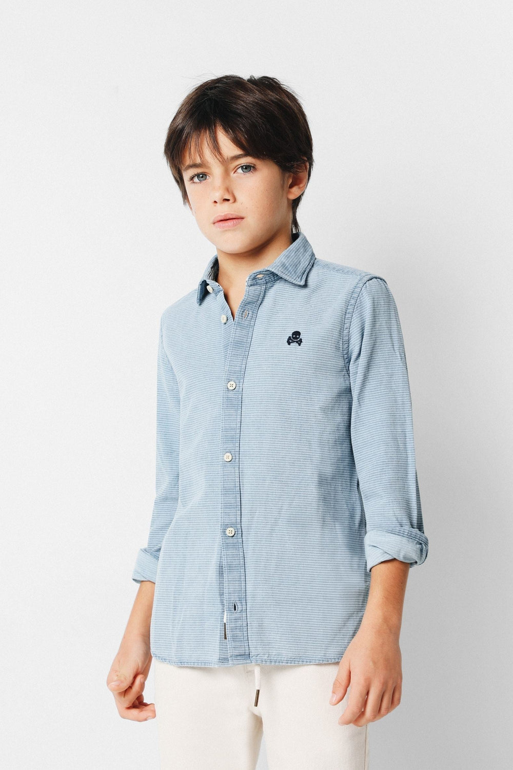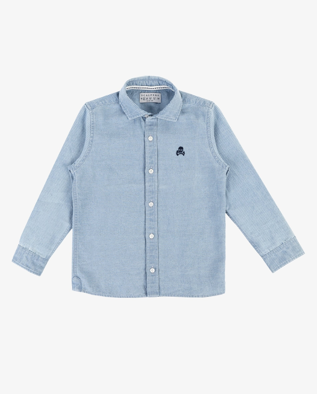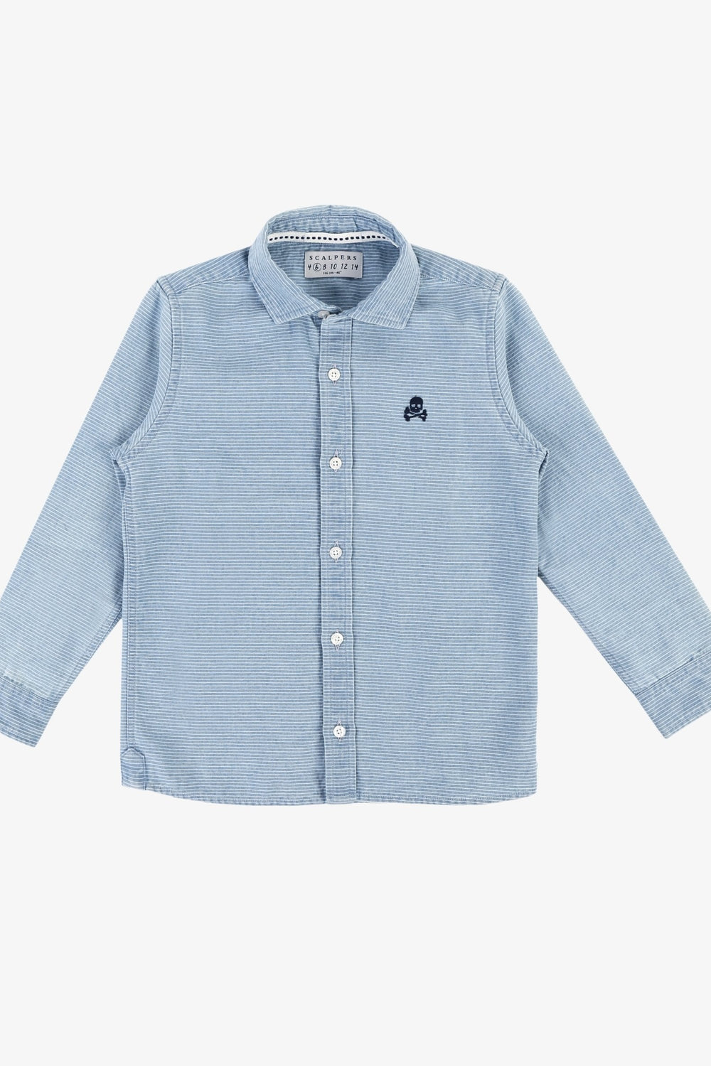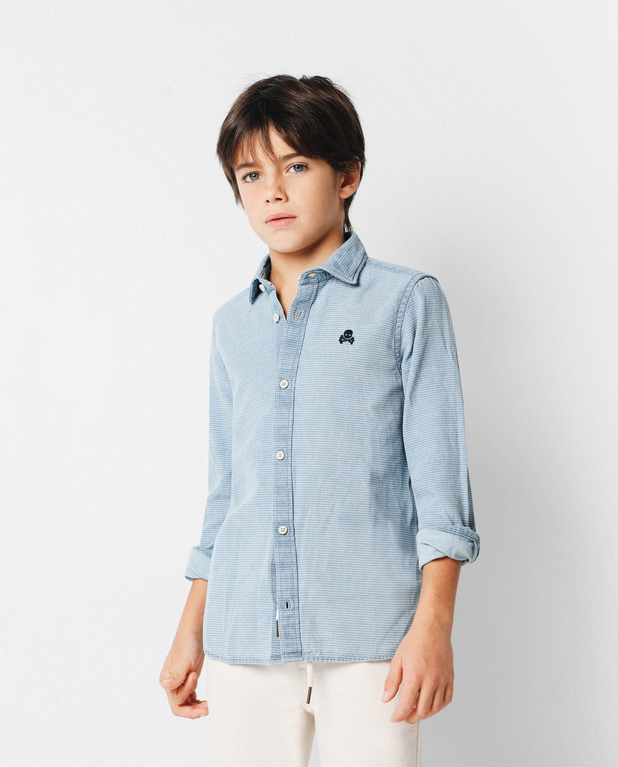 Camisa confeccionada en tejido de estructura rayada 100% algodón. Corte Regular Fit, cuello cutaway y cierre con botones y tapeta francesa. Manga larga terminada en puño y detalle de logo a contraste en el pecho.