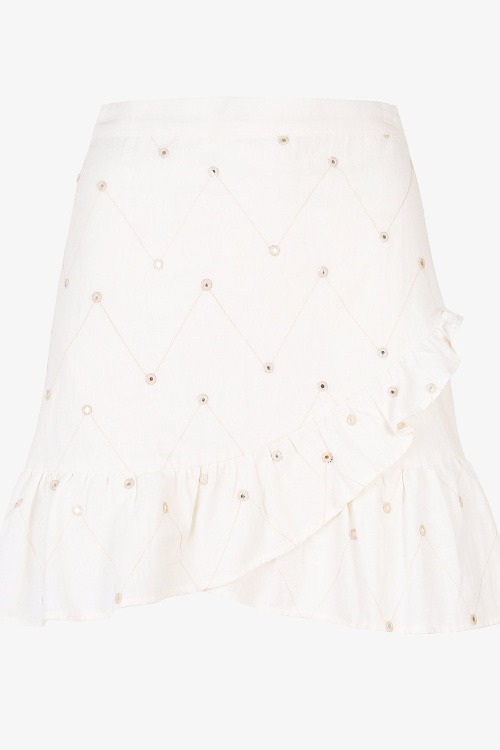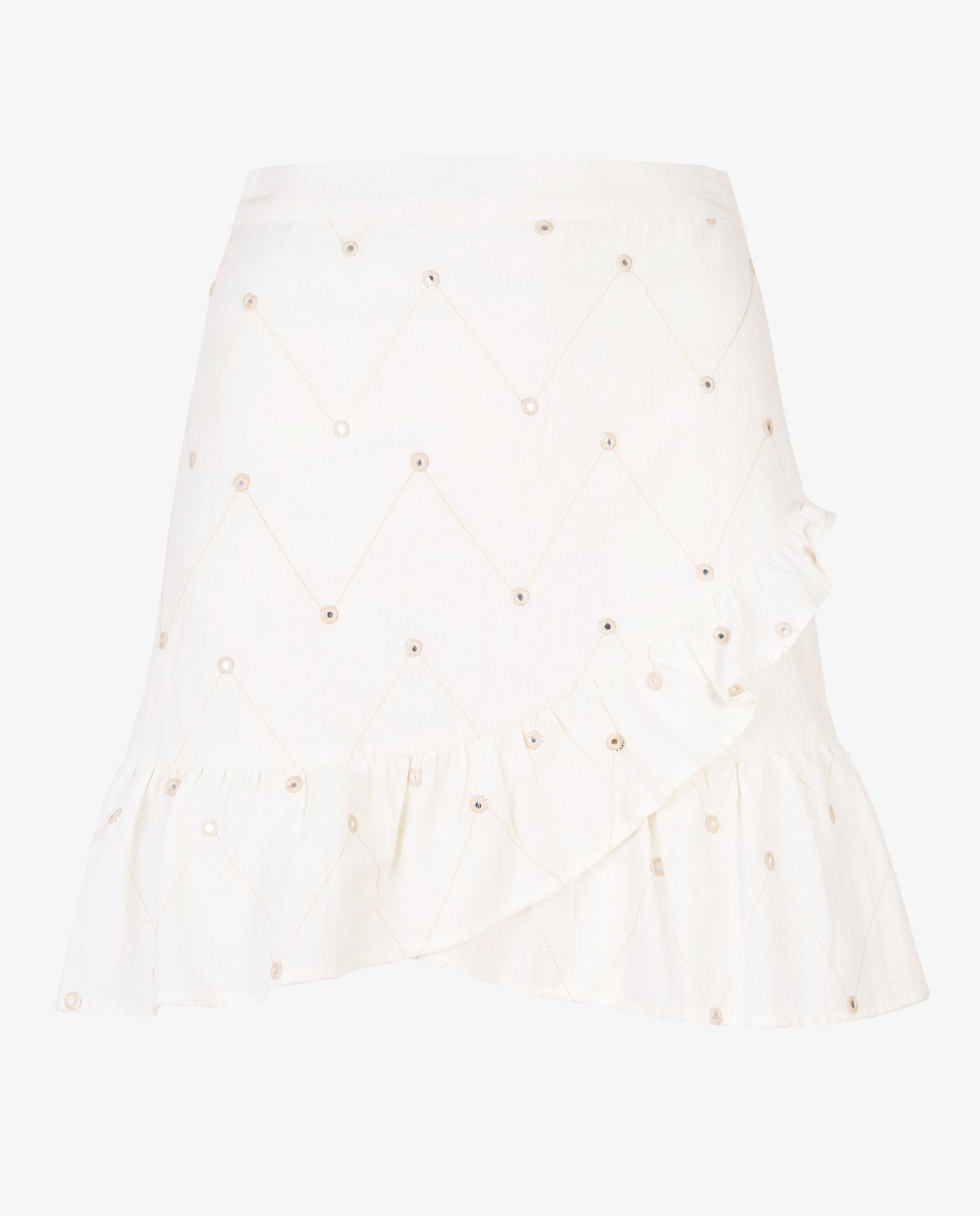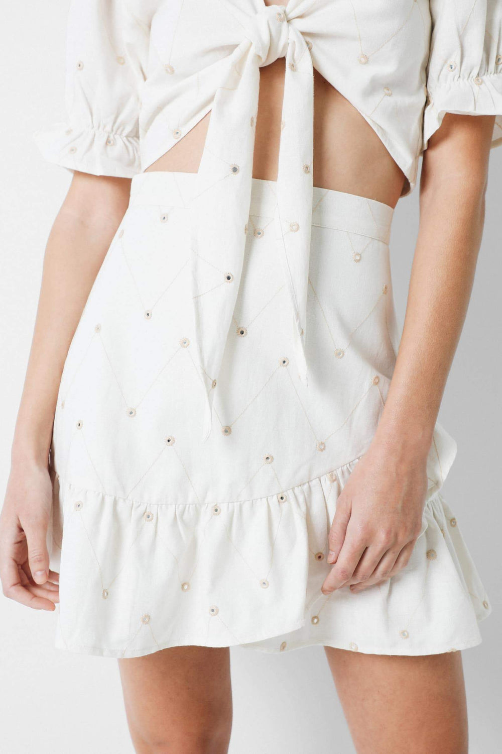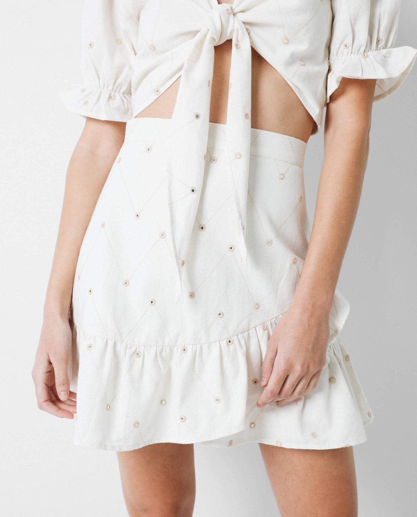 Falda mini con bordado de espejo confeccionada en tejido 100% algodón. Corte Slim Fit, cierre con cremallera invisible y volantes en el bajo.