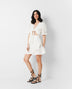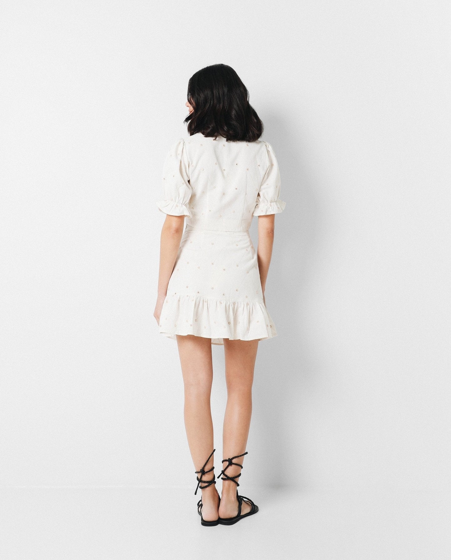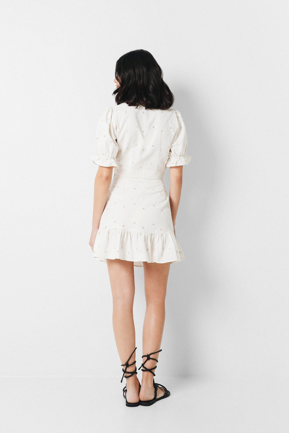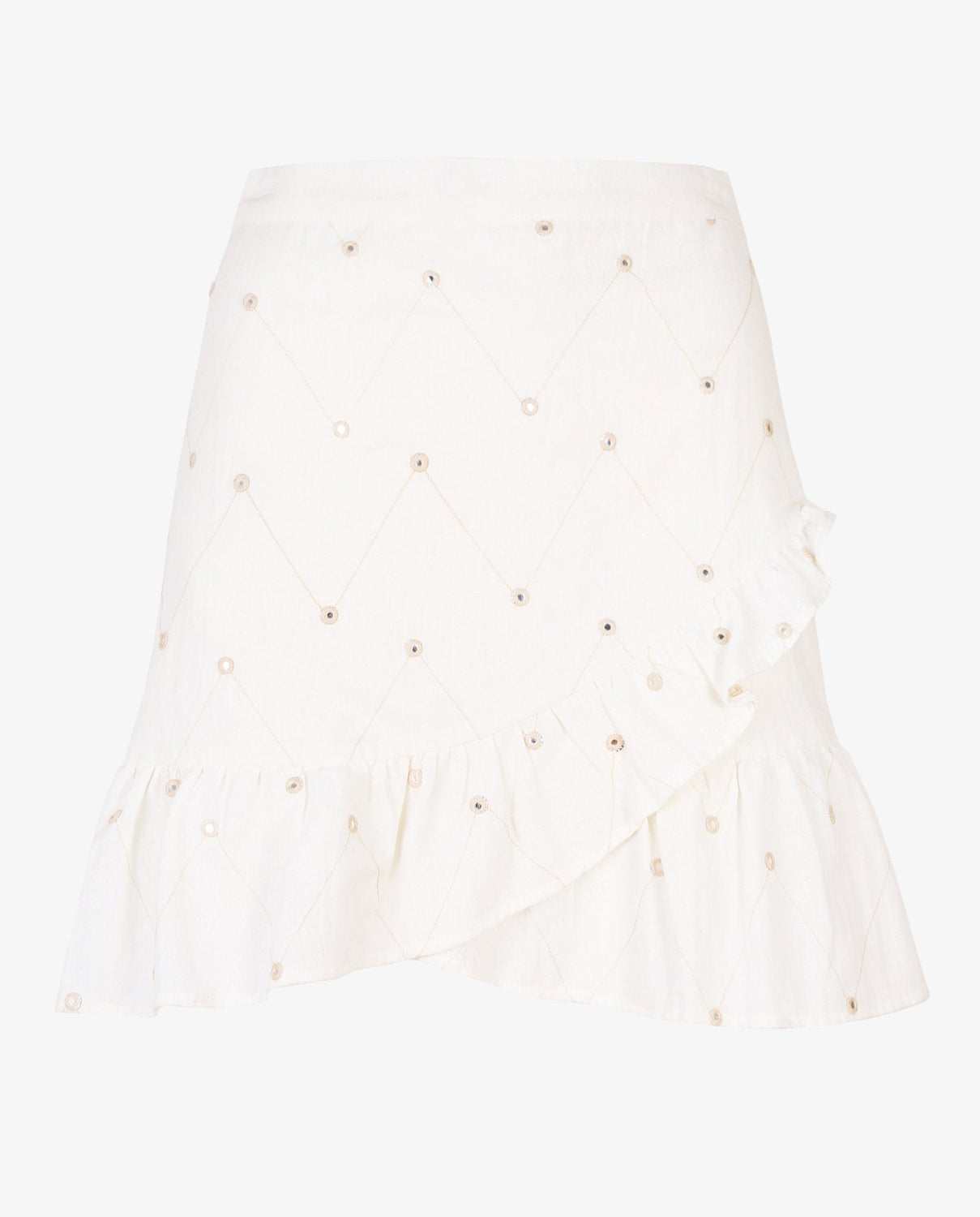 Falda mini con bordado de espejo confeccionada en tejido 100% algodón. Corte Slim Fit, cierre con cremallera invisible y volantes en el bajo.