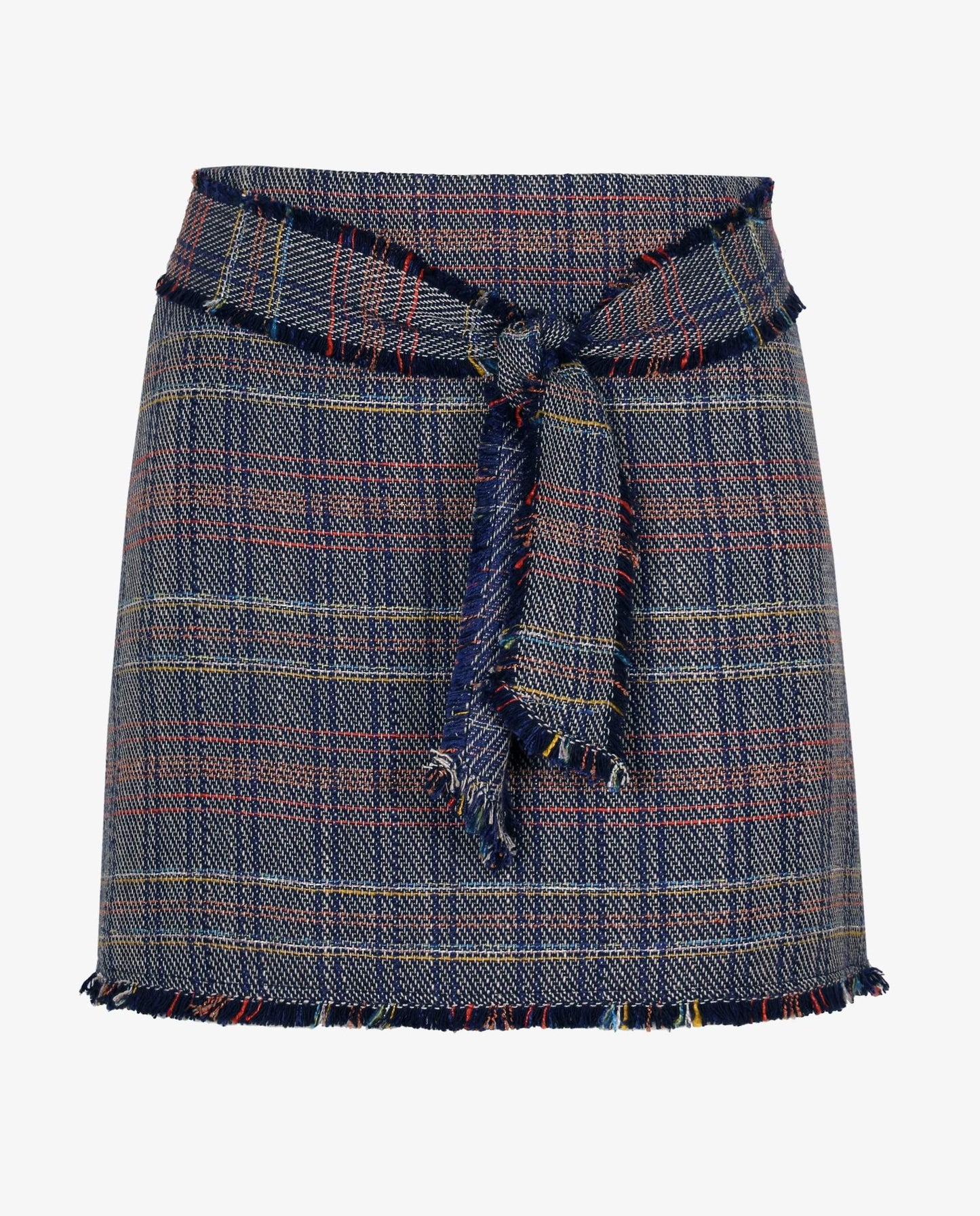 Falda mini confeccionada en tejido tweed. Corte recto de tiro alto y cierre con cremallera lateral metálica. Cinturón desflecado del mismo tejido.