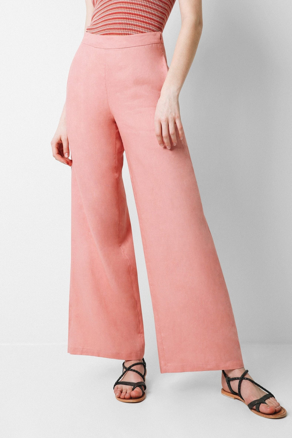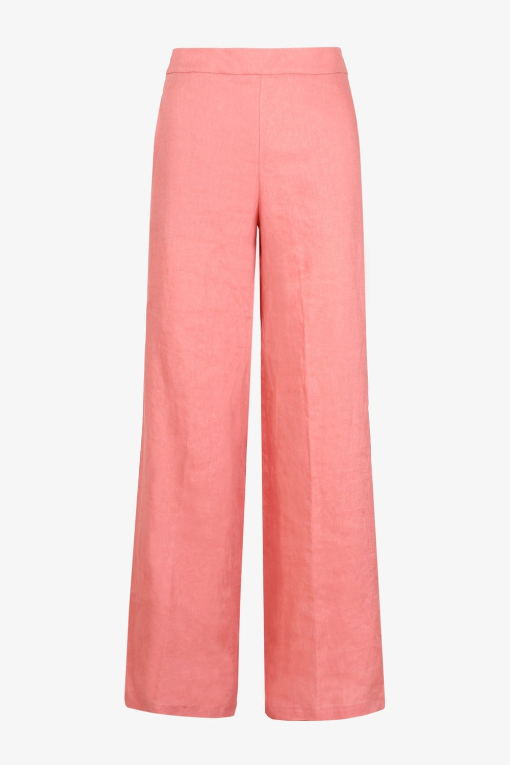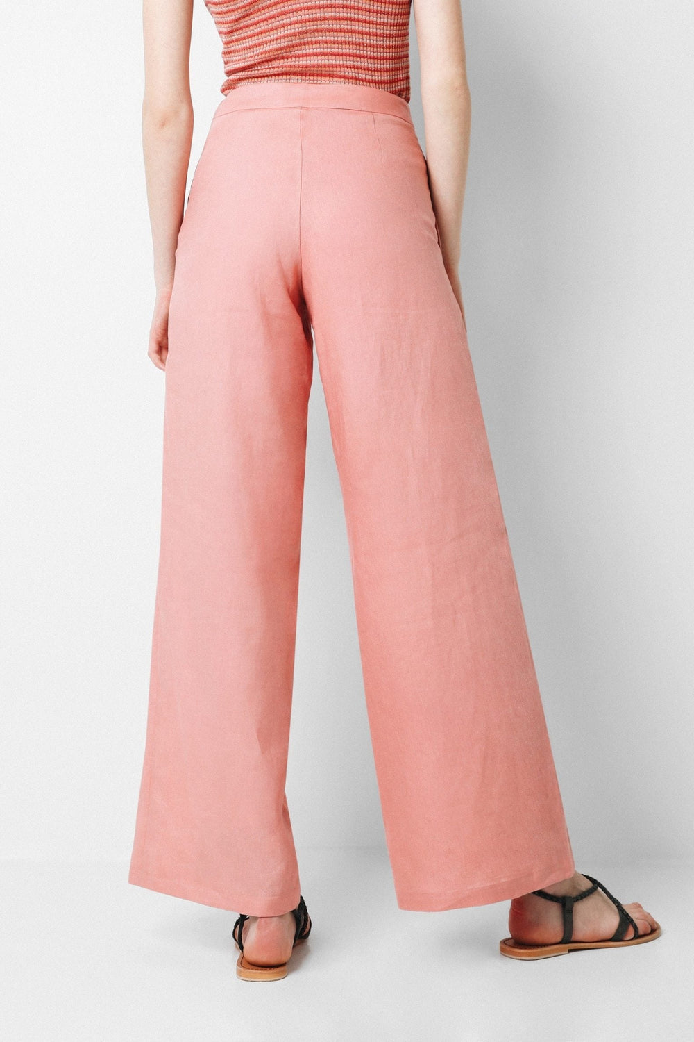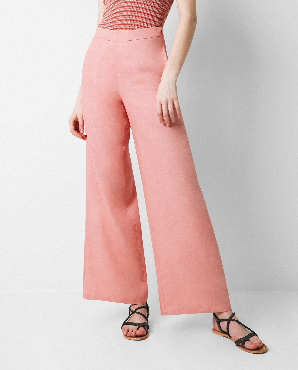 Pantalón confeccionado en tejido 100% lino. Corte palazzo y cierre con cremallera invisible. Detalle de bolsillo lateral.