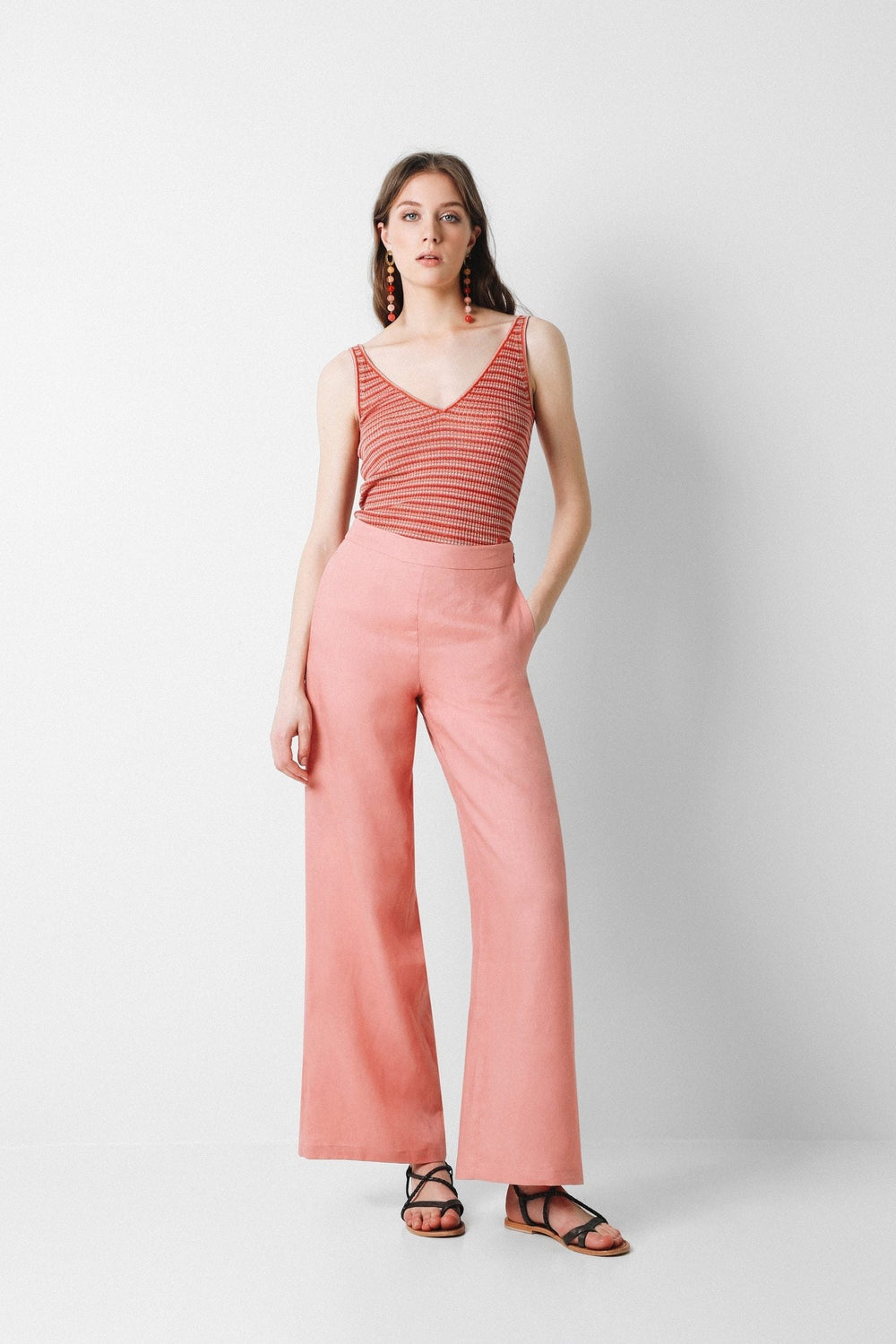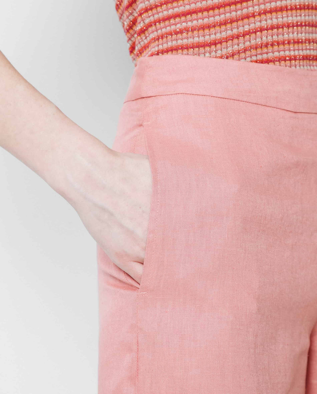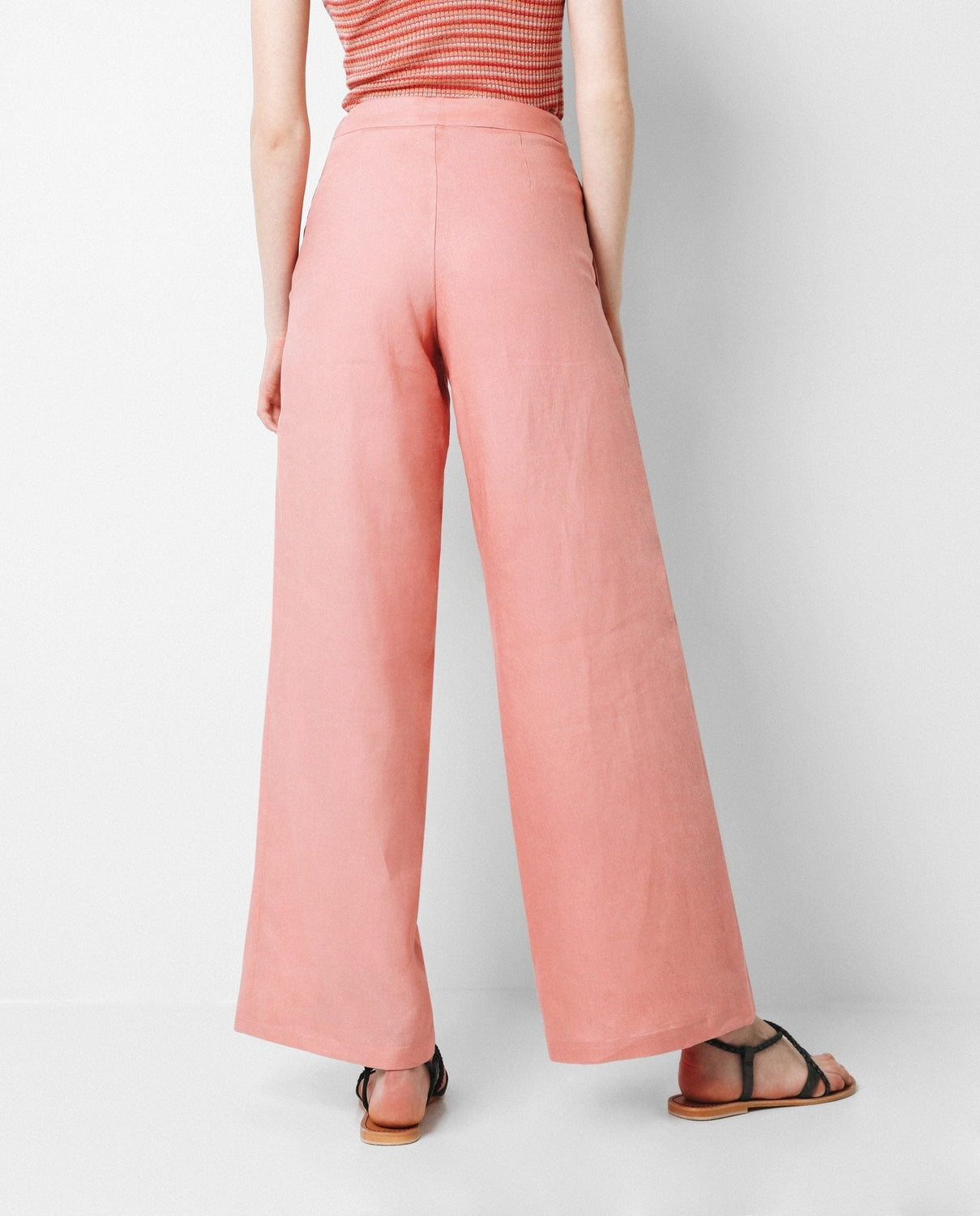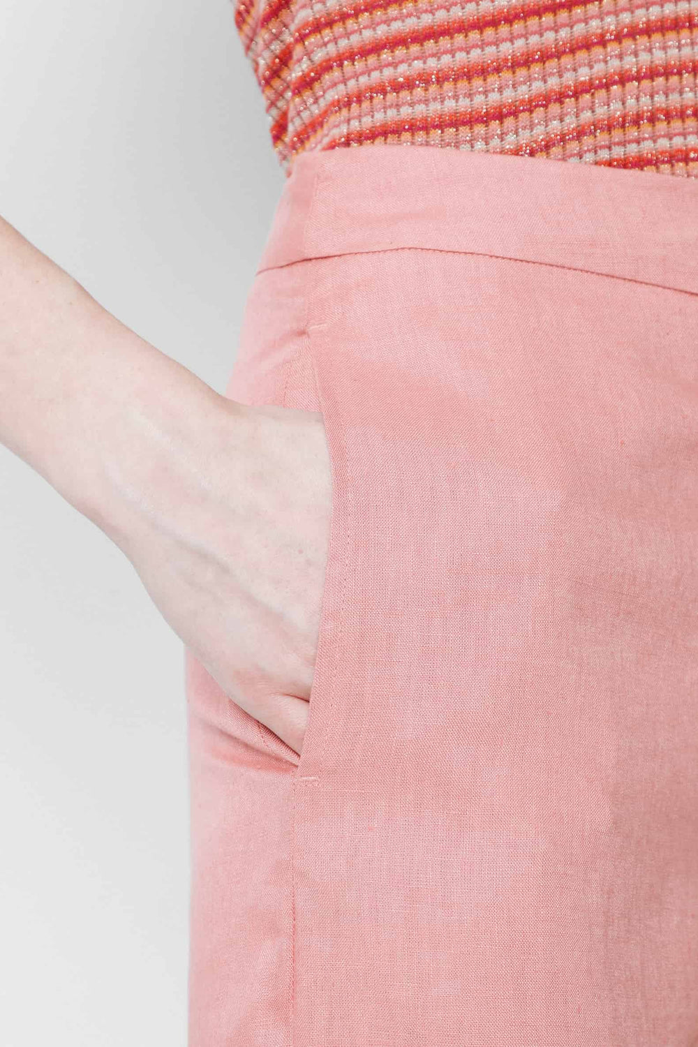 Pantalón confeccionado en tejido 100% lino. Corte palazzo y cierre con cremallera invisible. Detalle de bolsillo lateral.