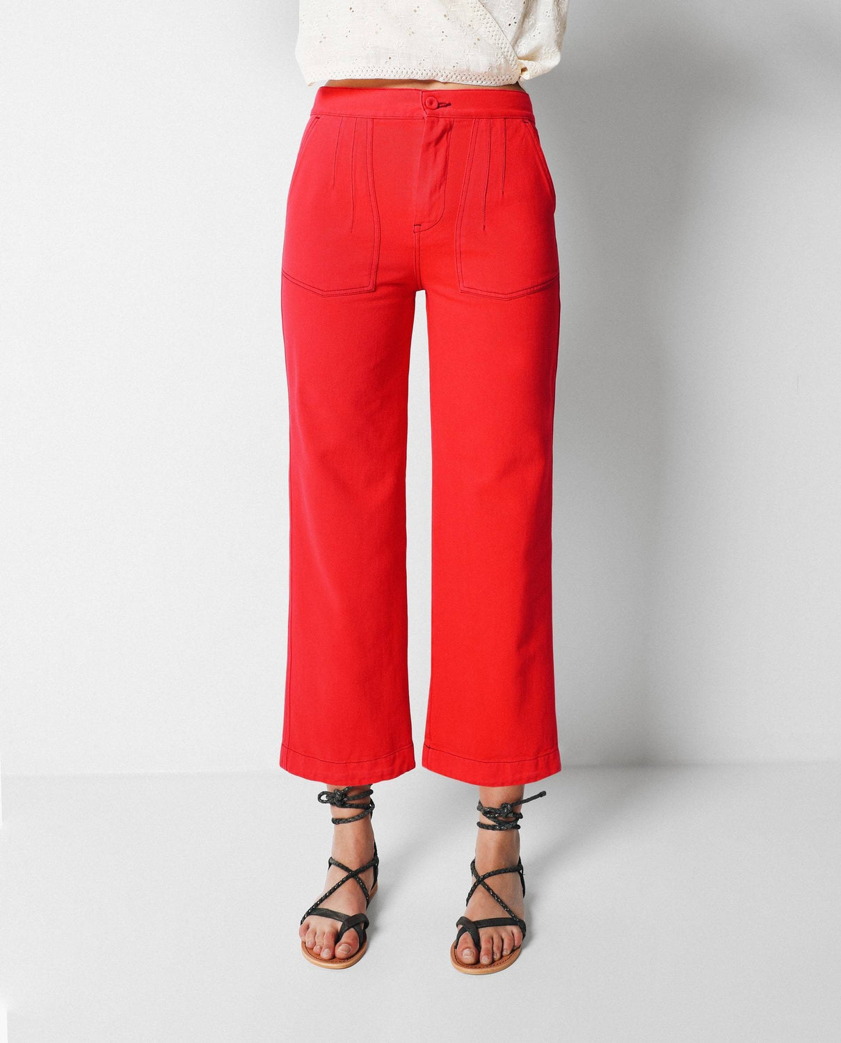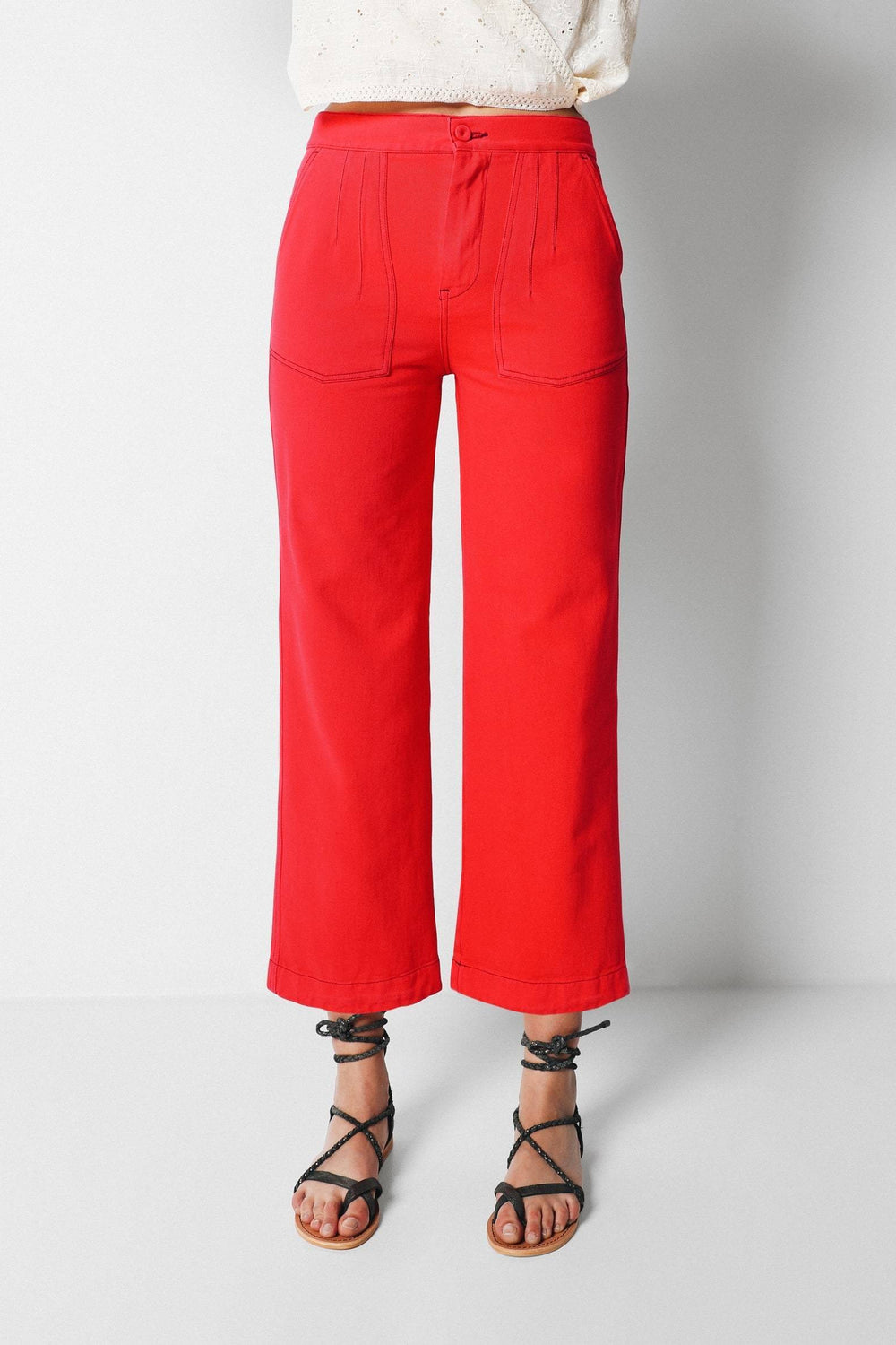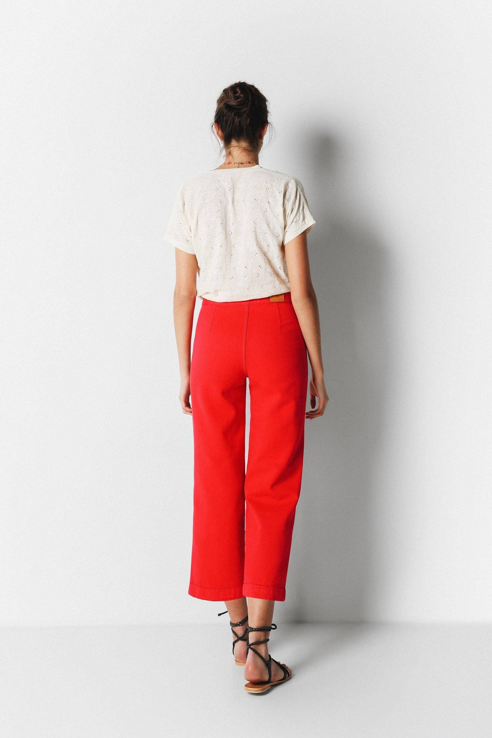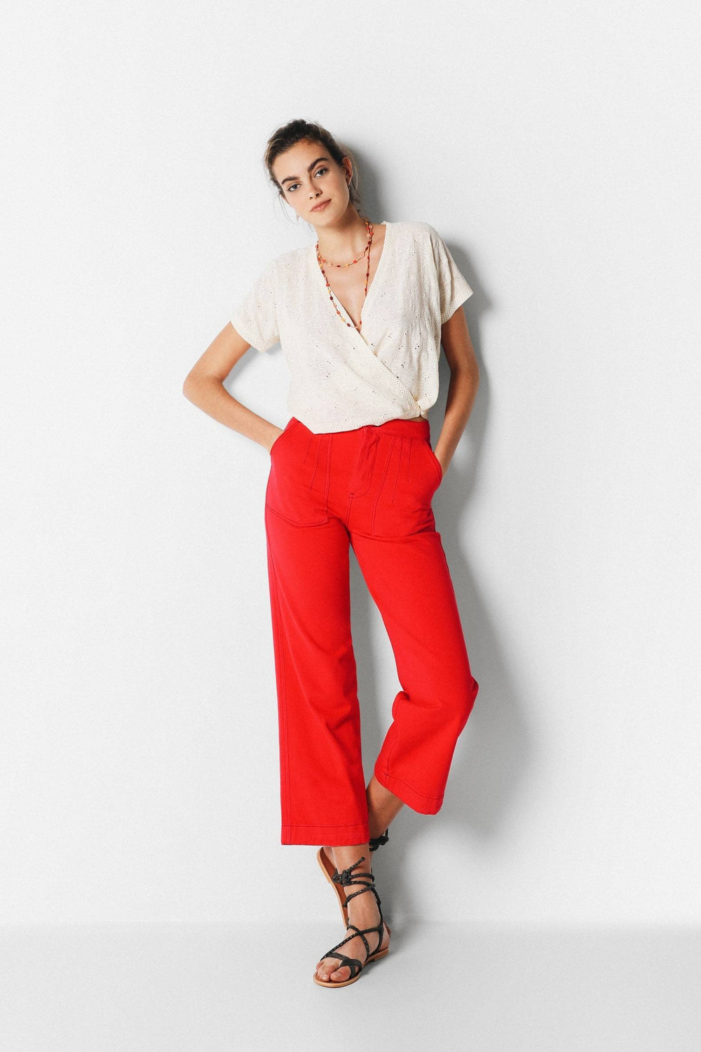Pantalón confeccionado en tejido de algodón. Corte culotte, cierre con botón y cremallera. Bolsillos delanteros de plastrón. Detalle de ribetes a contraste.