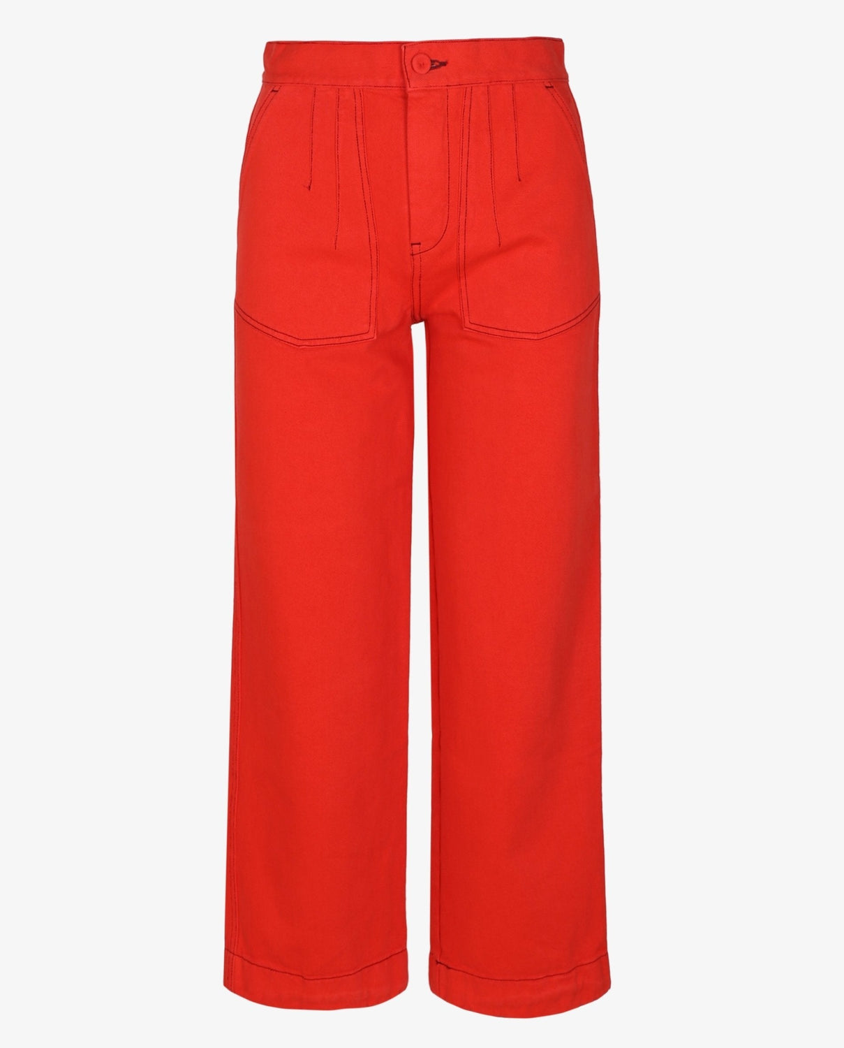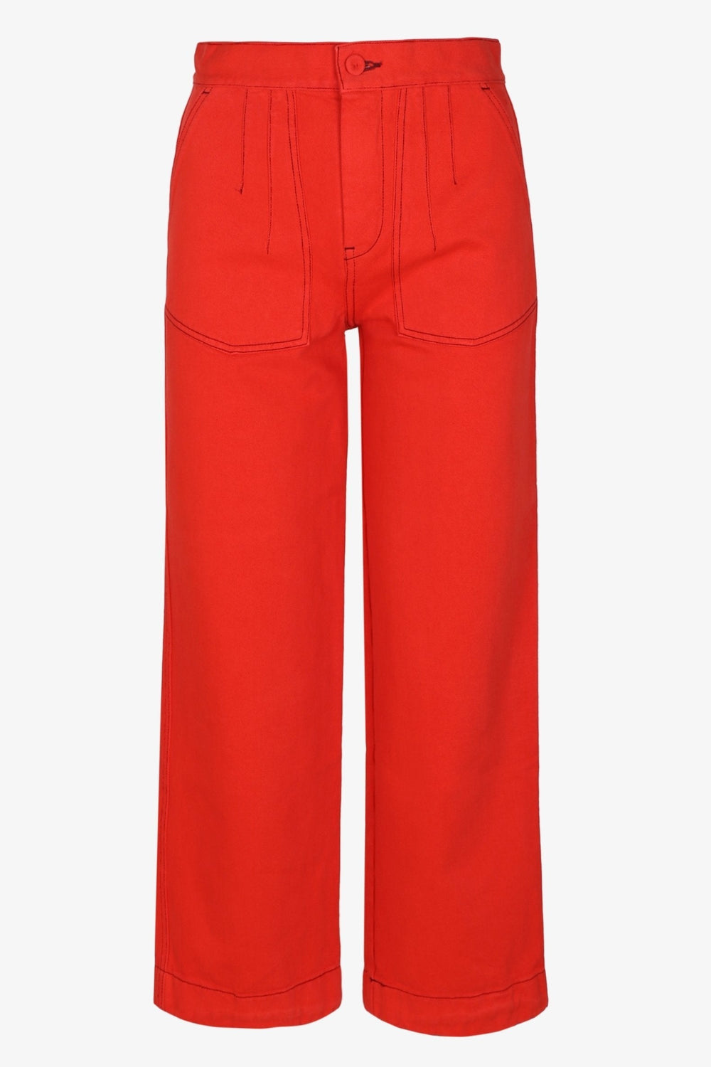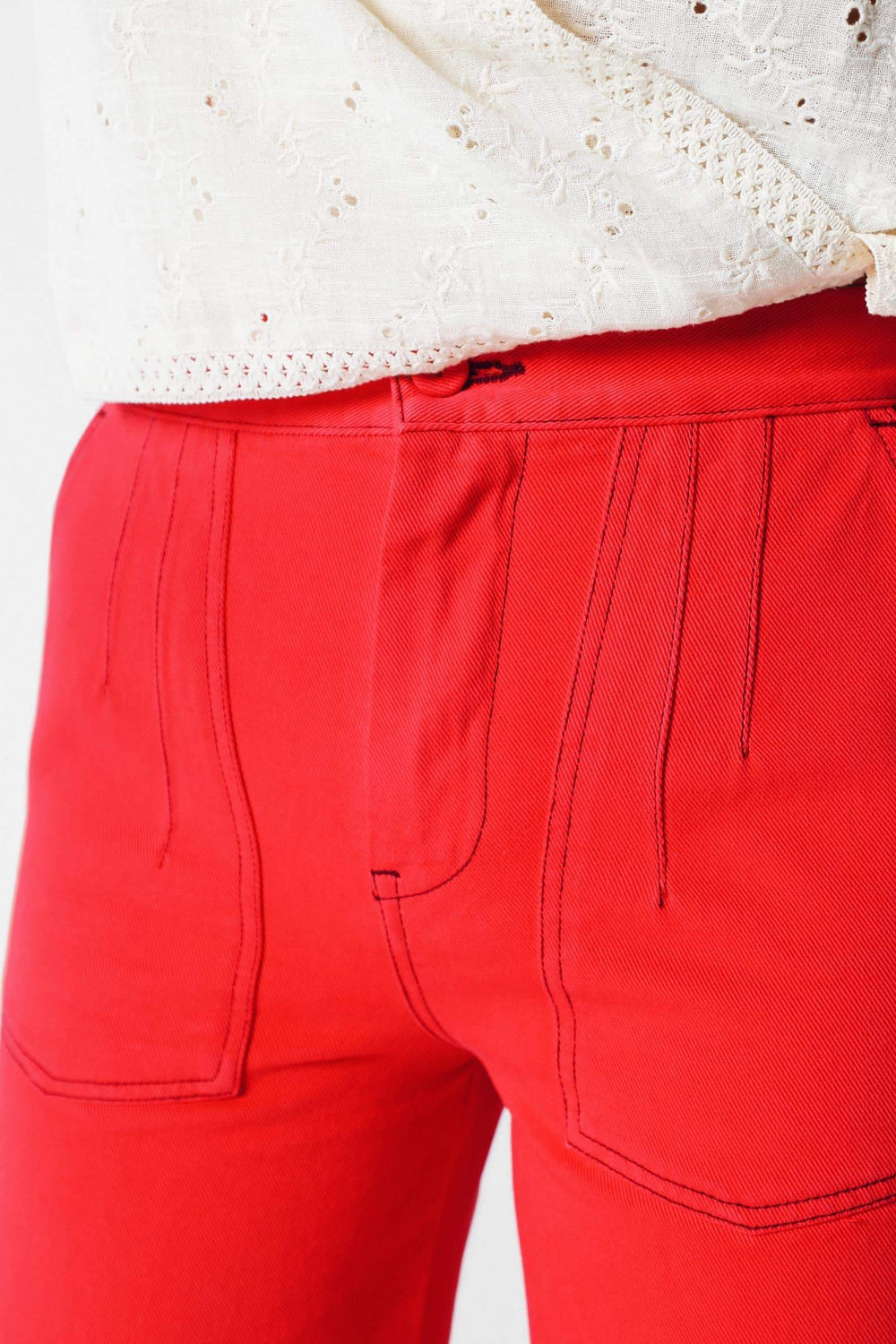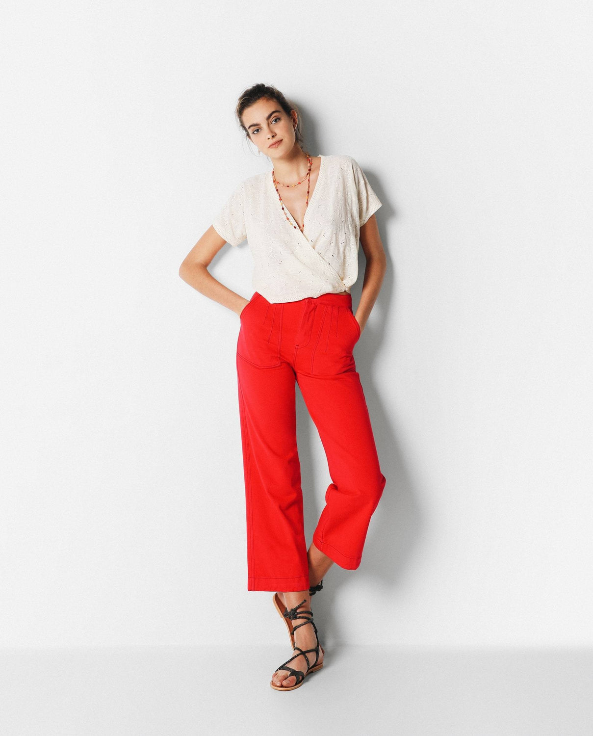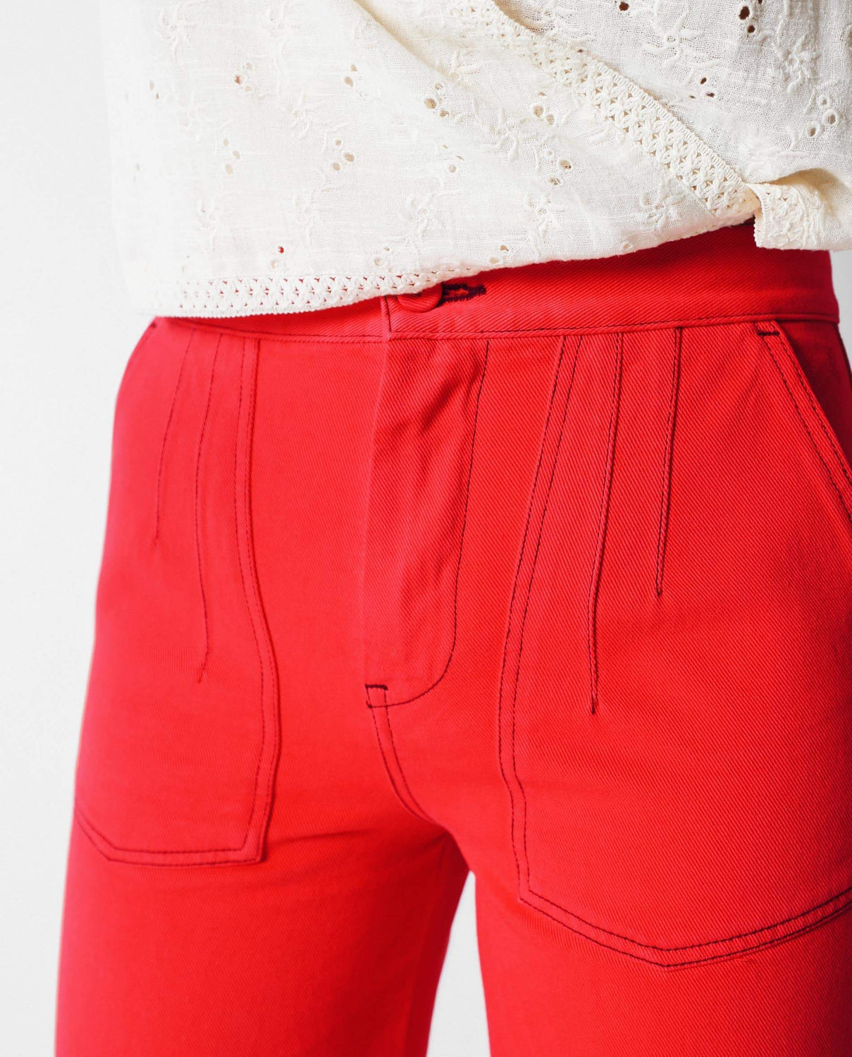Pantalón confeccionado en tejido de algodón. Corte culotte, cierre con botón y cremallera. Bolsillos delanteros de plastrón. Detalle de ribetes a contraste.