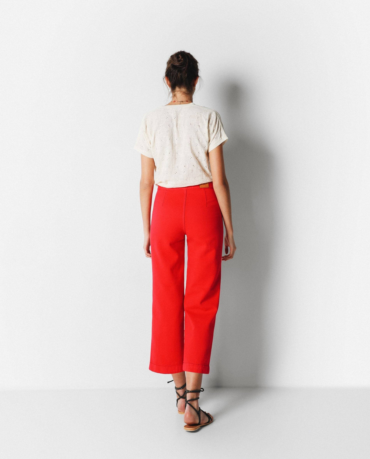 Pantalón fabricado con algodón orgánico cultivado mediante prácticas que protegen la biodiversidad.