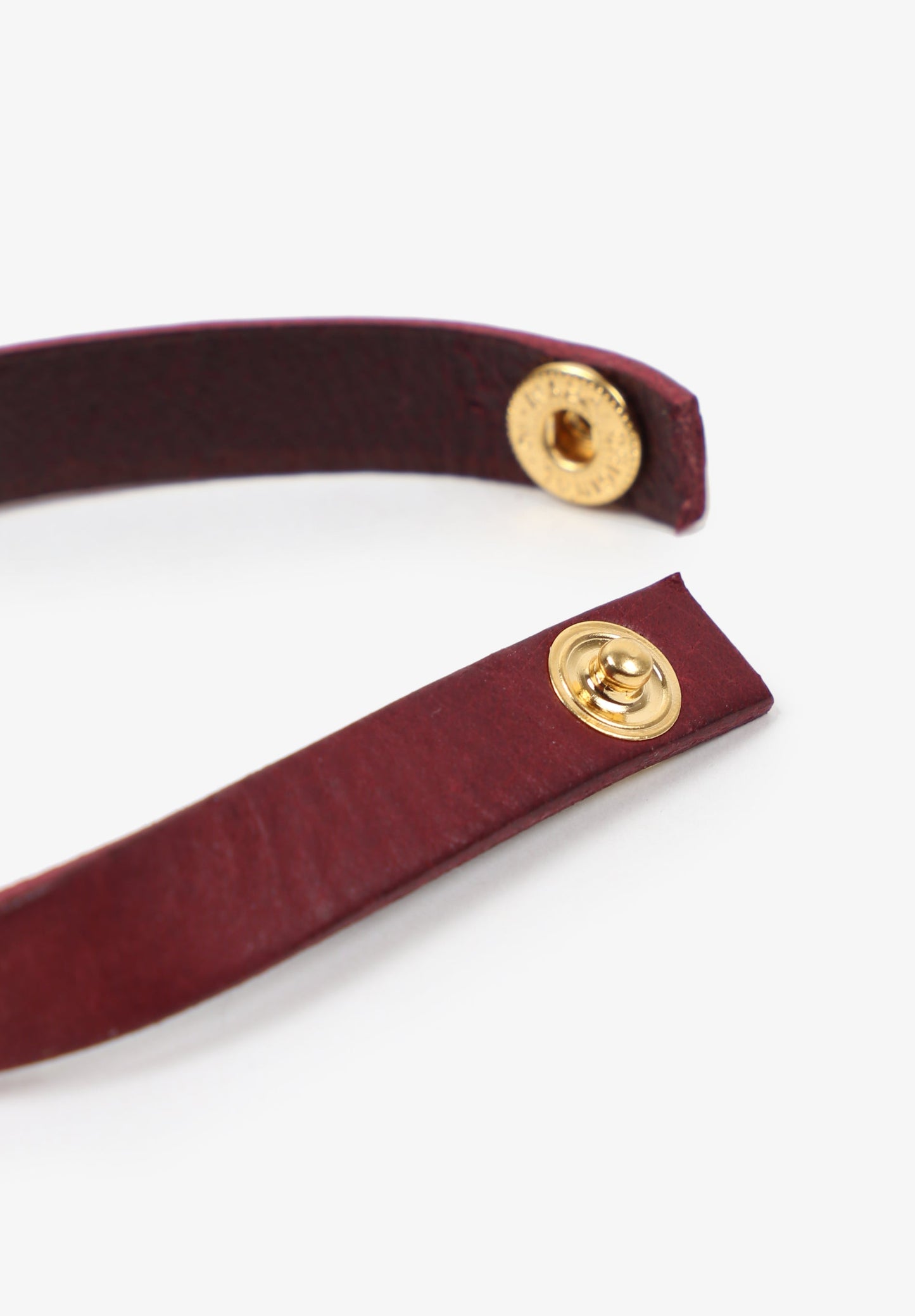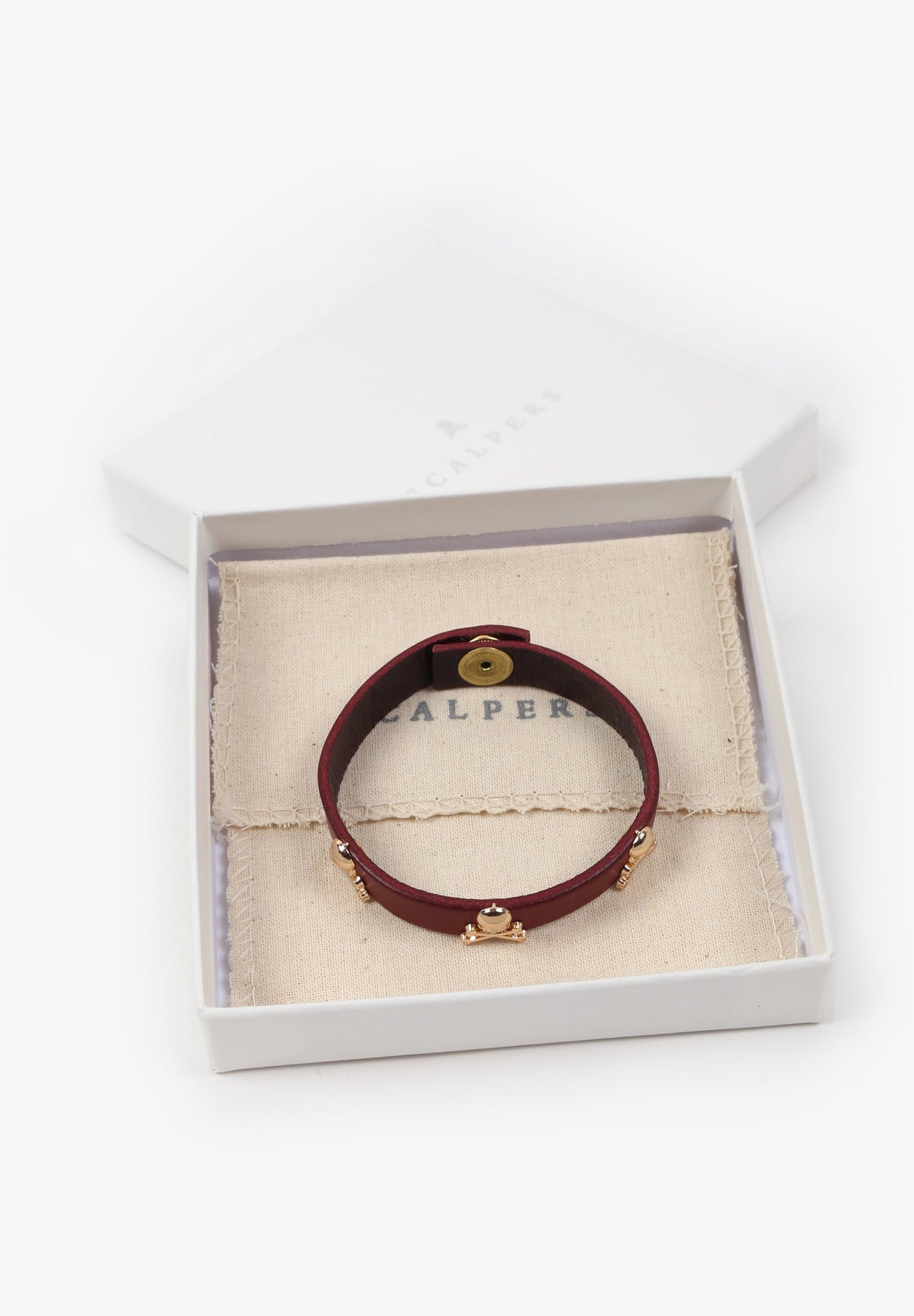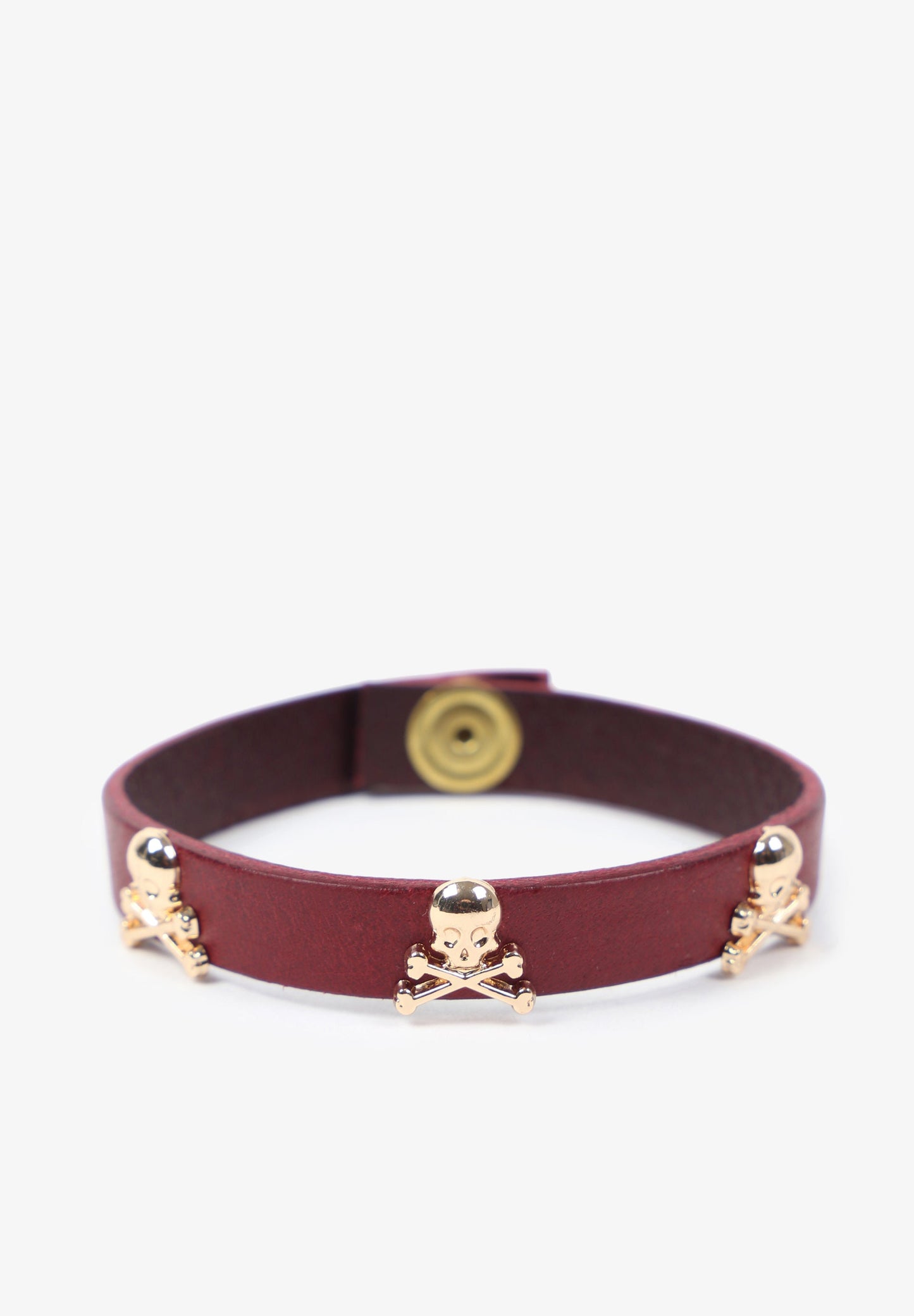Pulsera confeccionada en piel con detalle de calaveras. Cierre con snap.