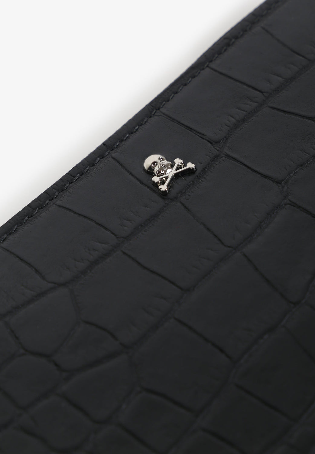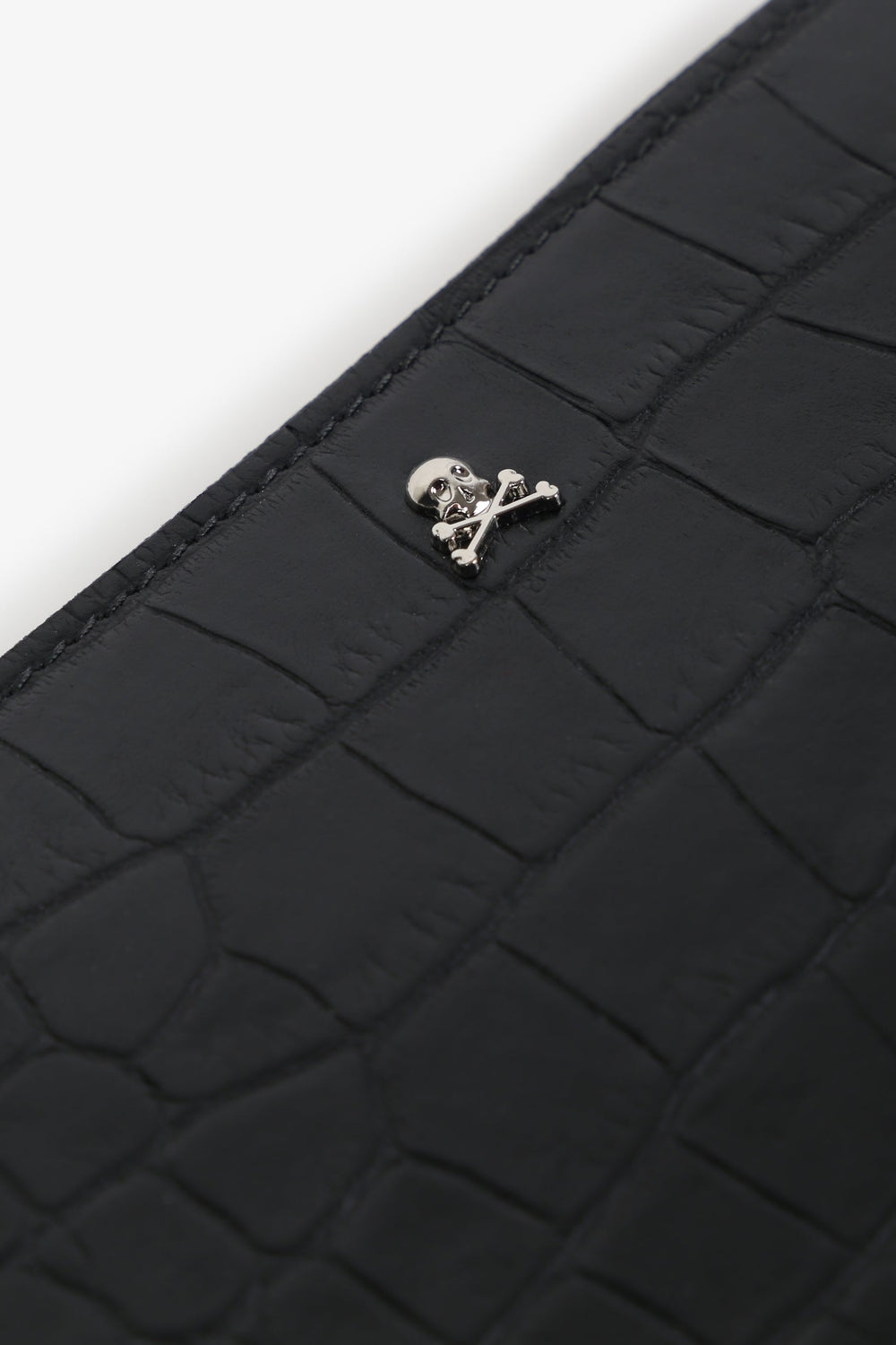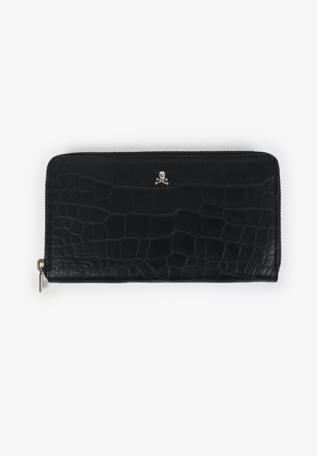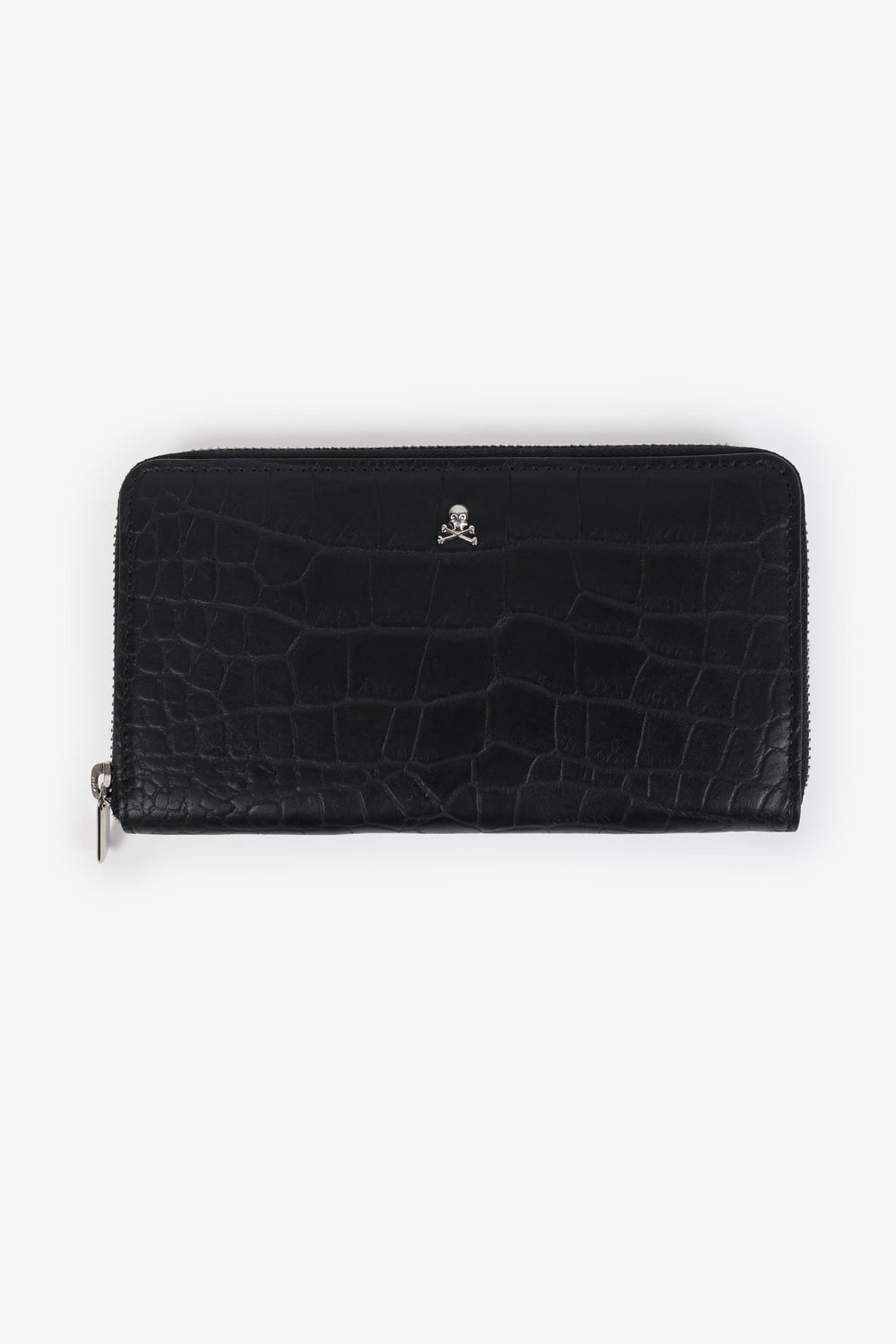 Billetera confeccionada en tejido 100% piel vacuno con grabado. Cierre con cremallera y dos compartimentos interiores. Detalle de tachuela en la calavera en la parte delantera.