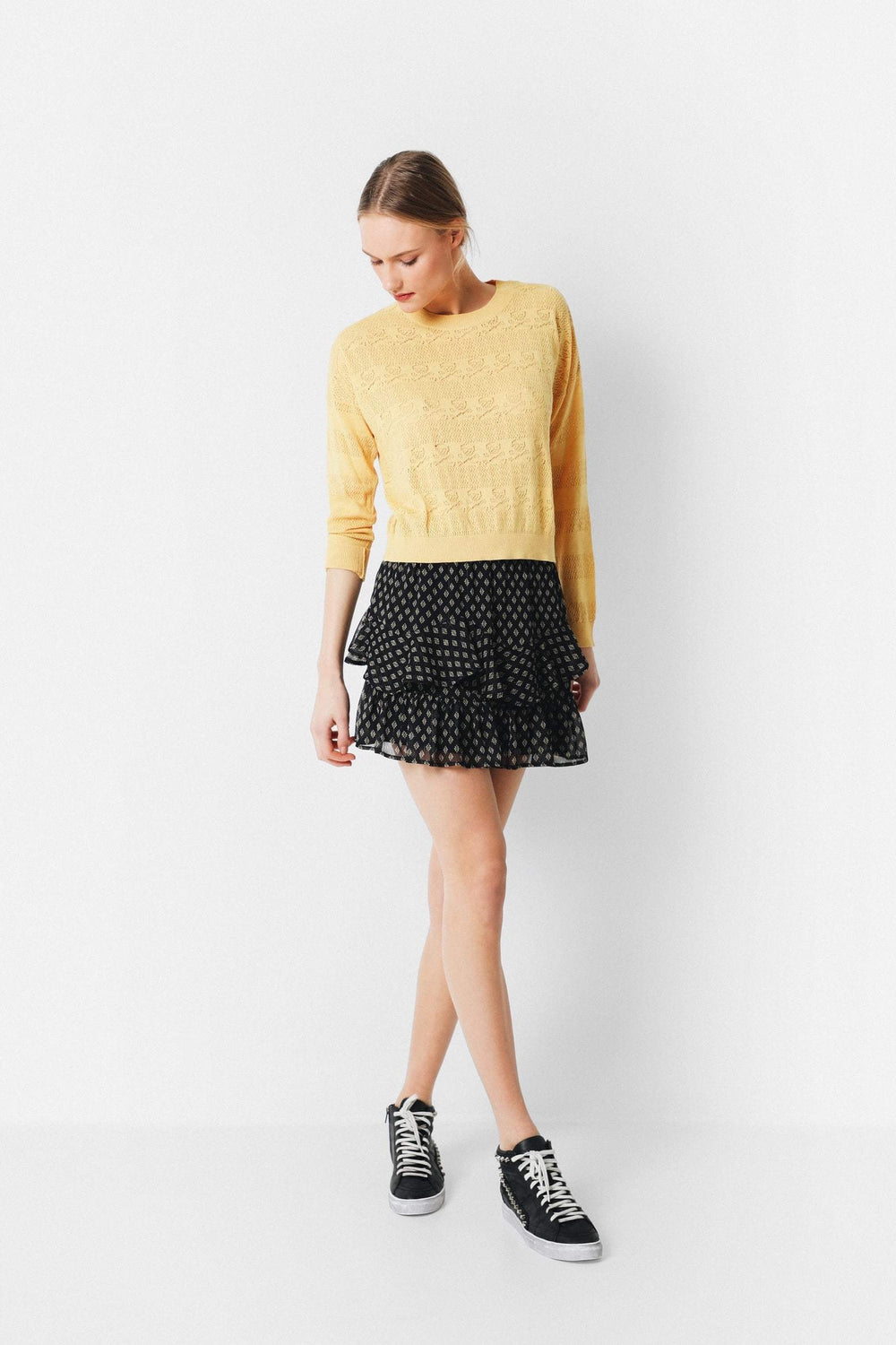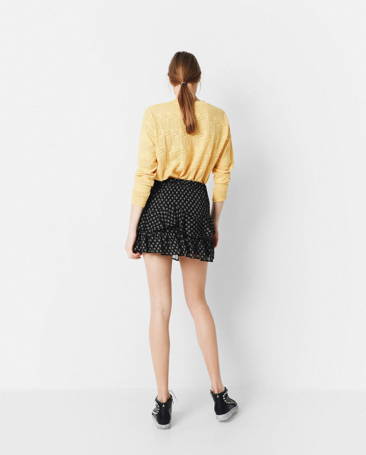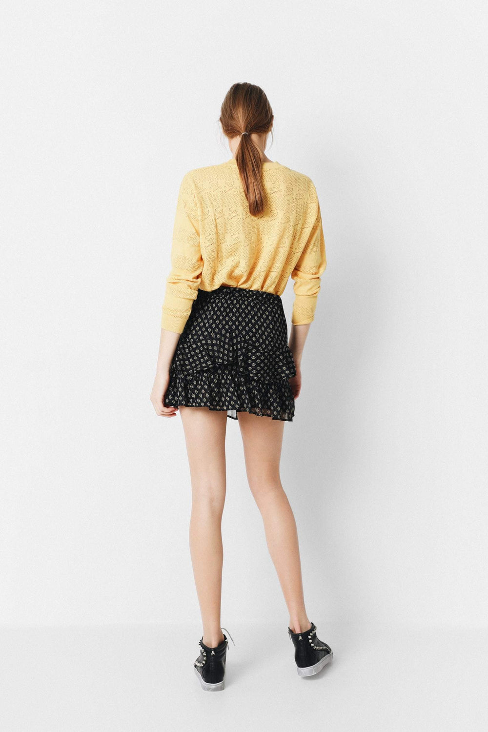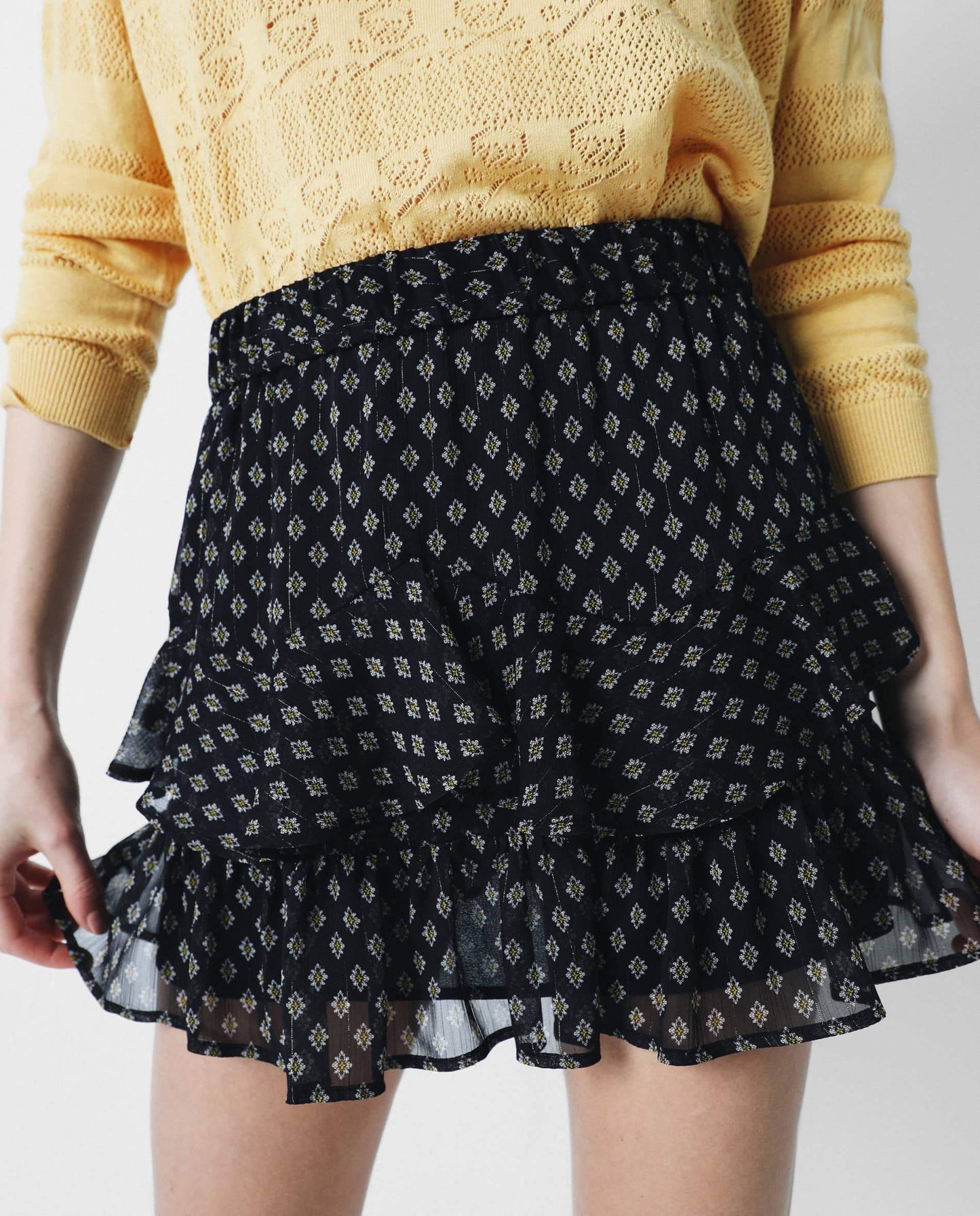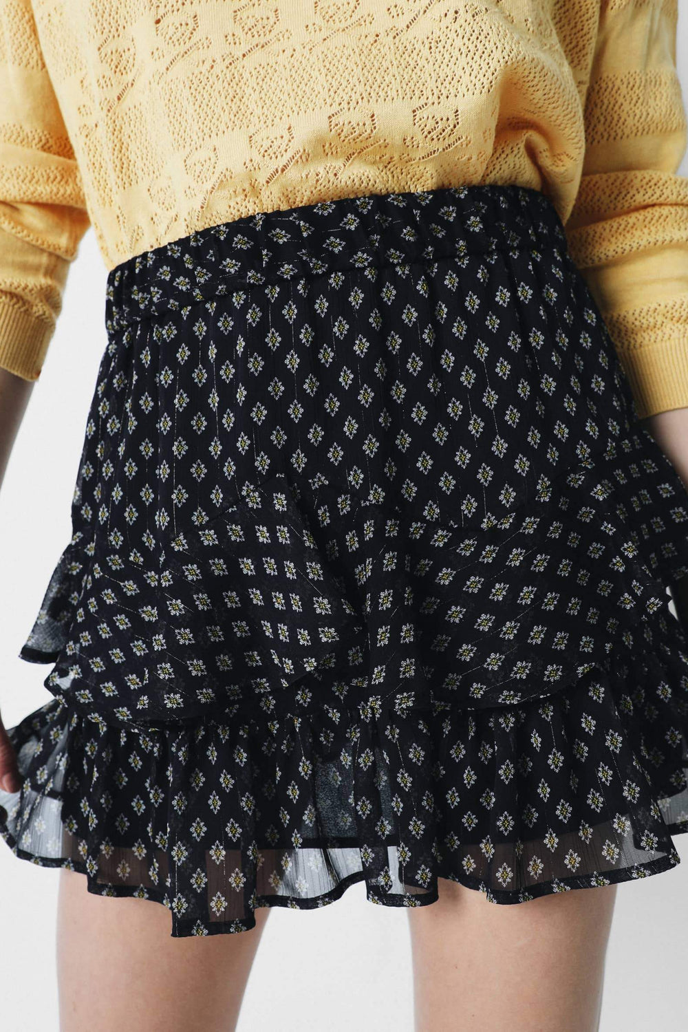 Falda mini con estampado. Corte con vuelo y doble volante y cinturilla elástica.