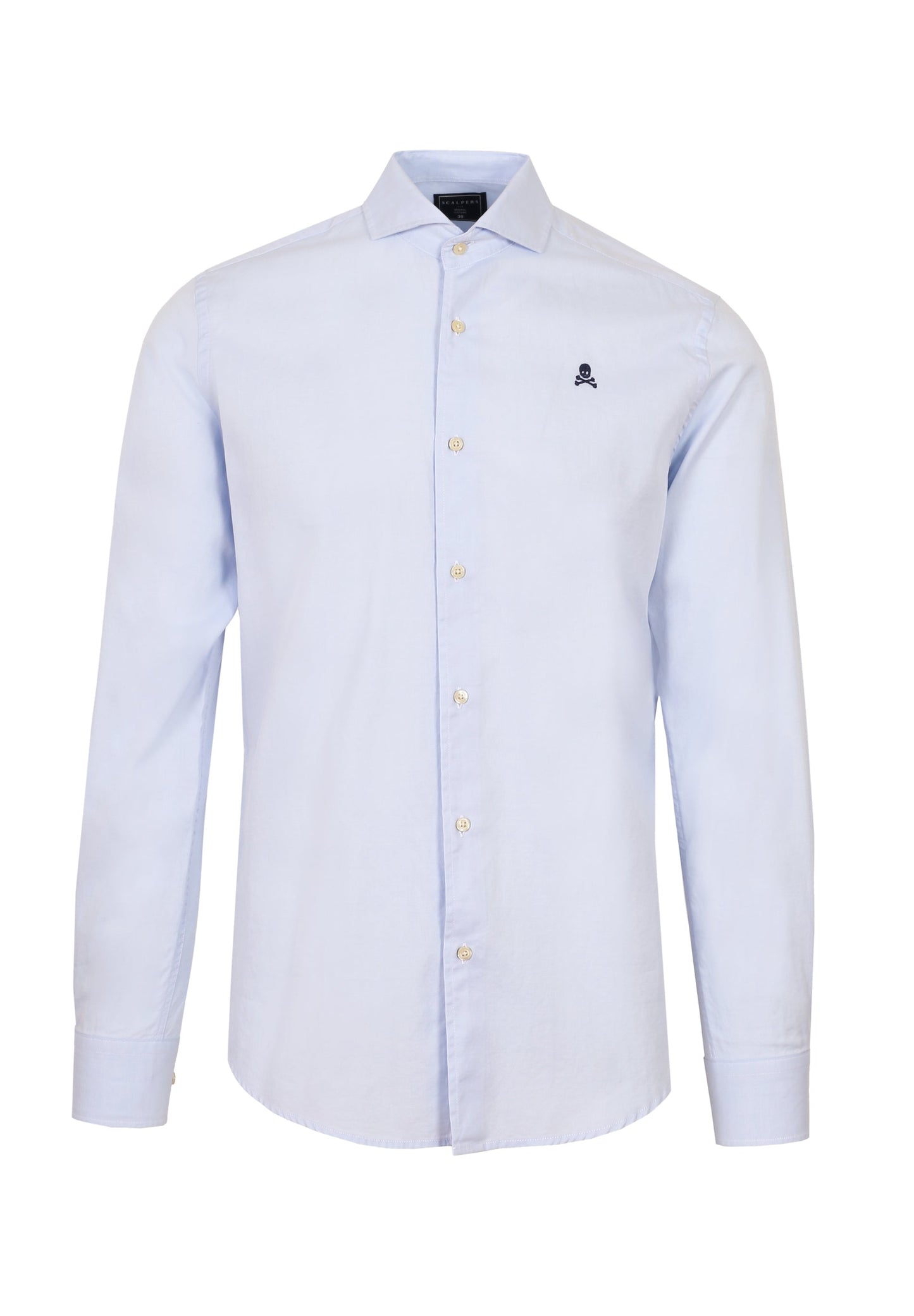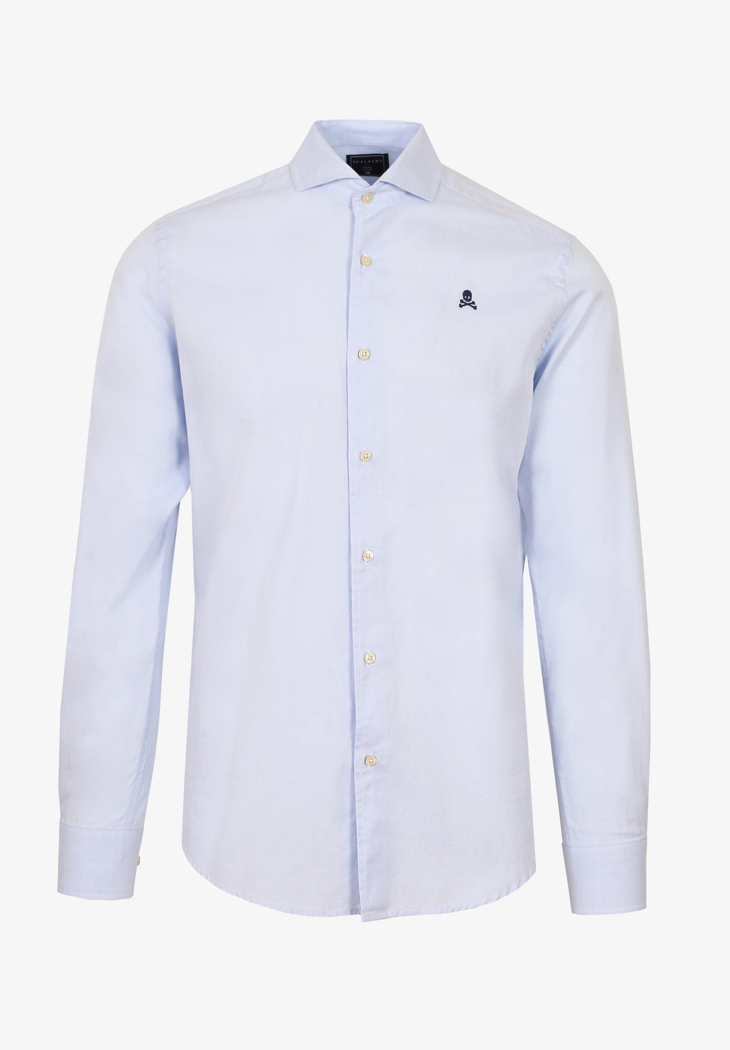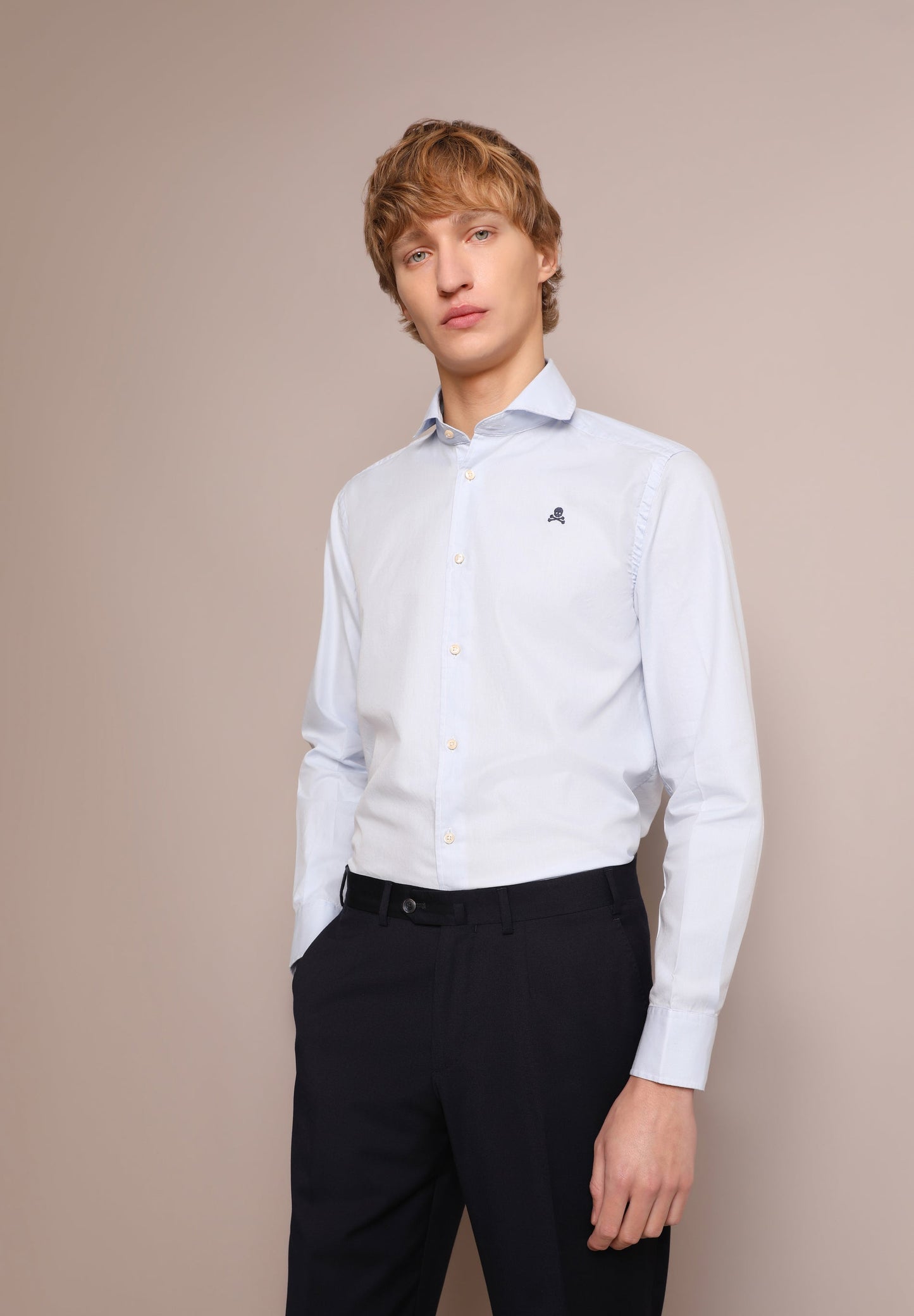 Camisa de rayas confeccionada en tejido 100% algodón. Corte Regular Fit, cuello cutaway y cierre con botones. Manga larga terminada en puño simple y detalle de calavera bordada en el pecho.