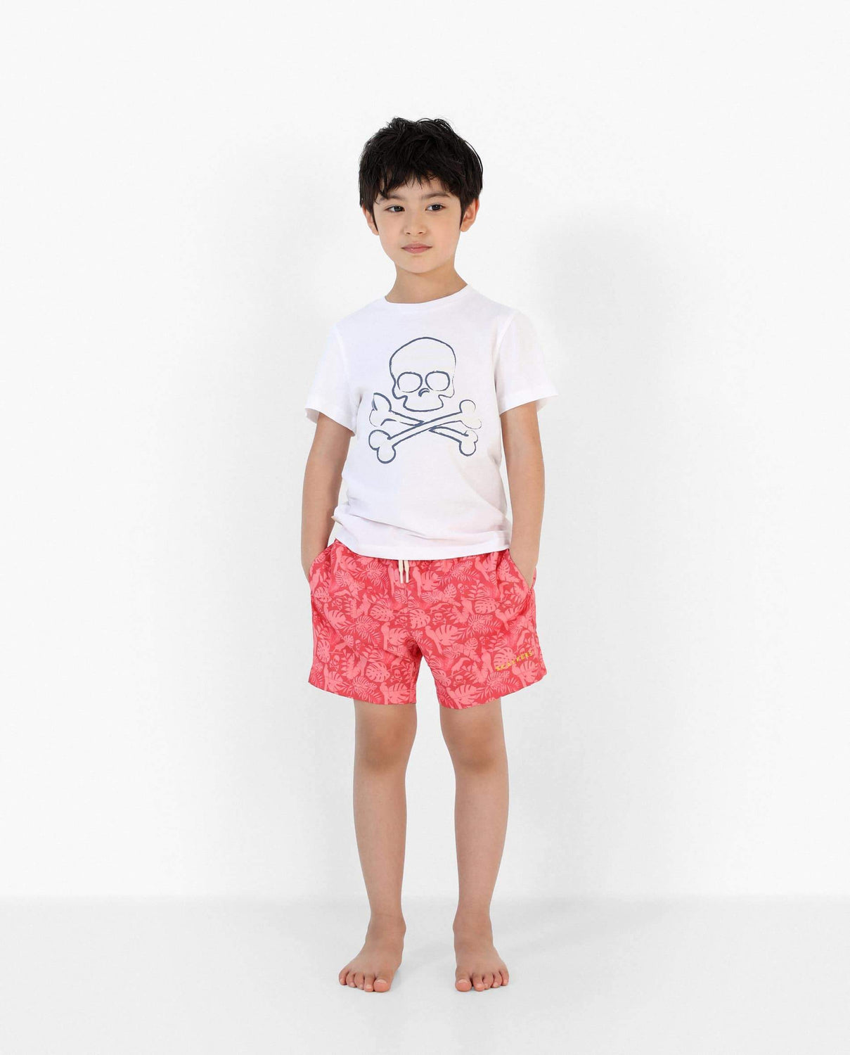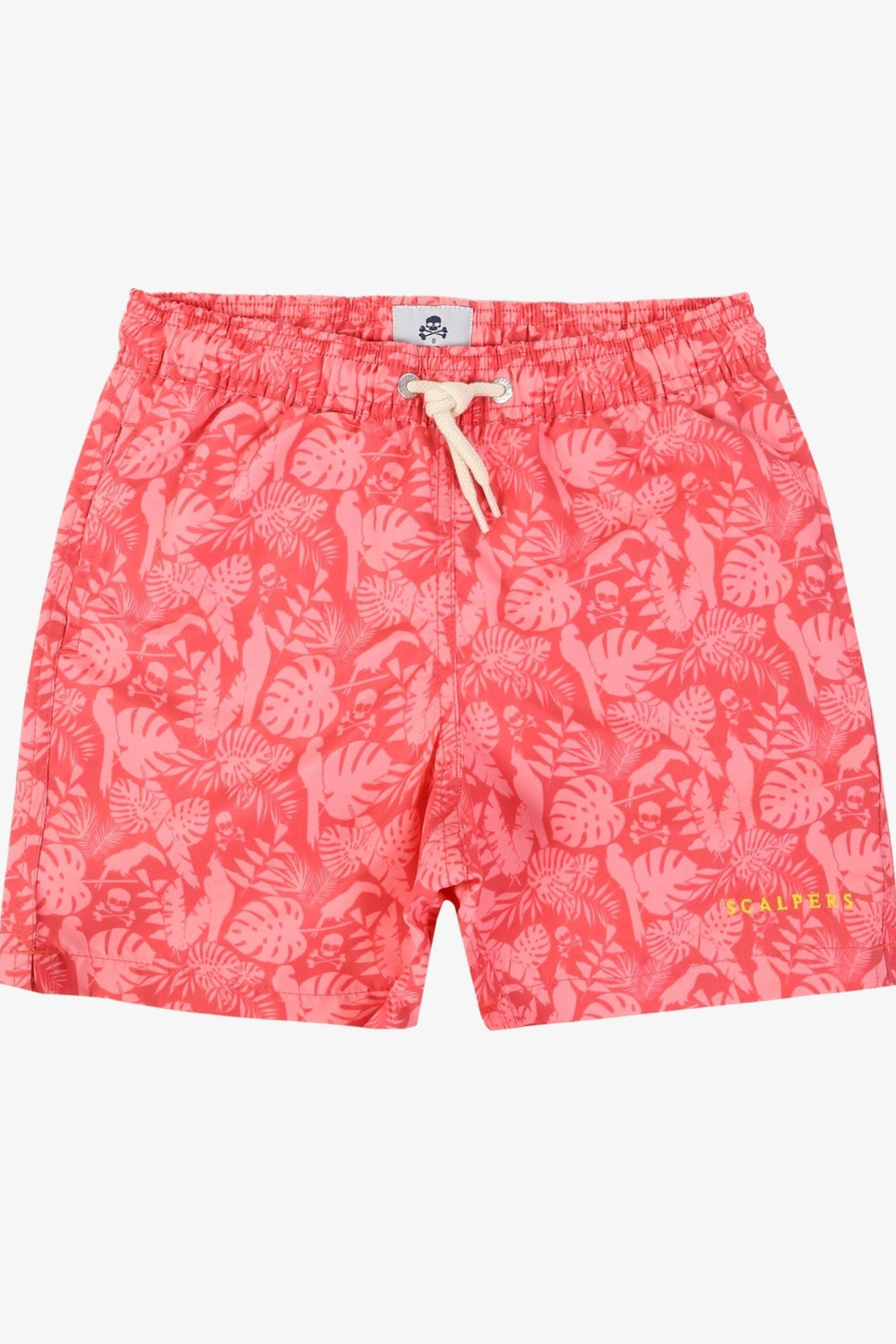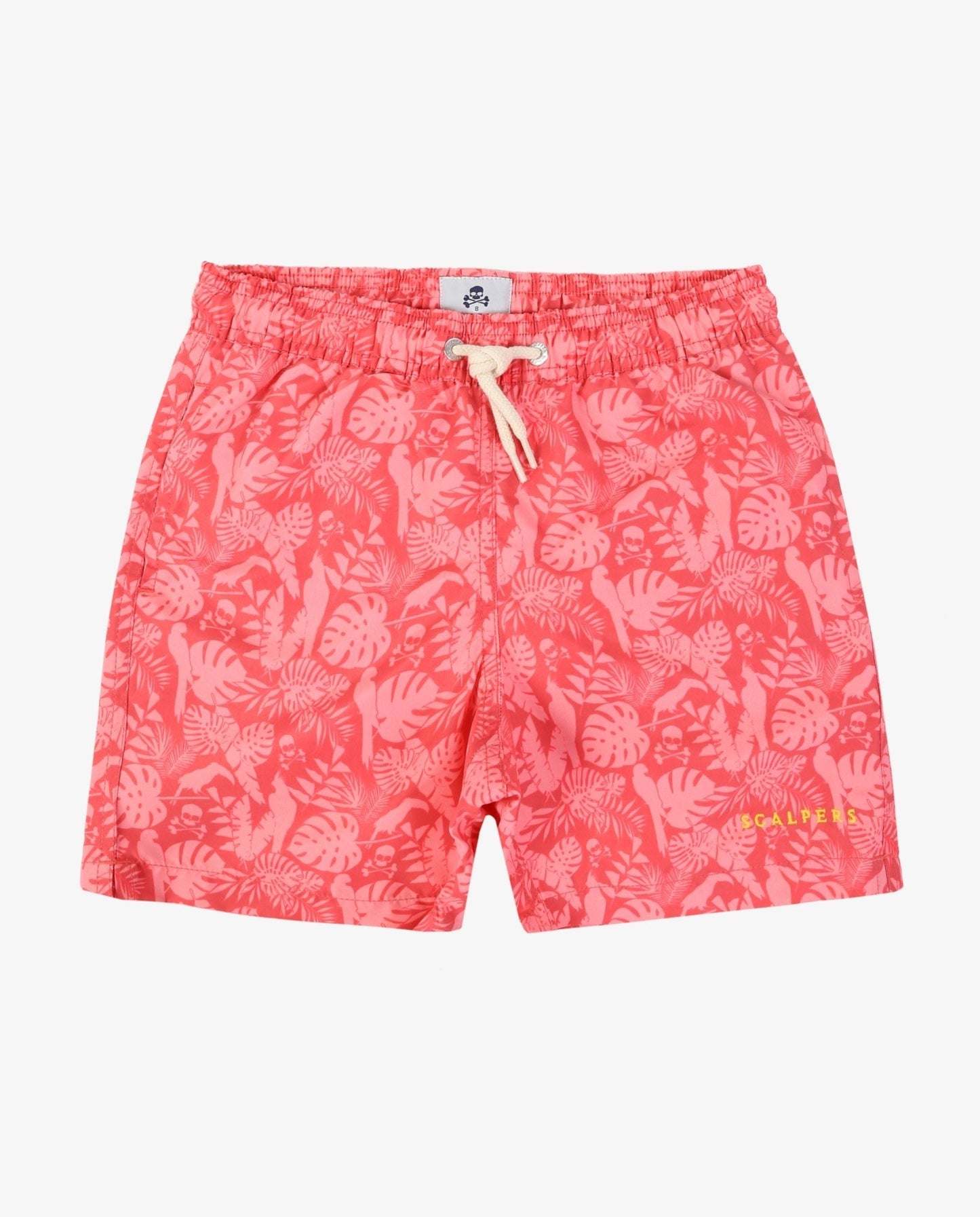 Bañador con estampado de palmeras y calaveras. Corte a media pierna con cintura elástica y cierre con cordón ajustable. Bolsillos laterales y trasero y detalle de bordado de Scalpers a contraste.