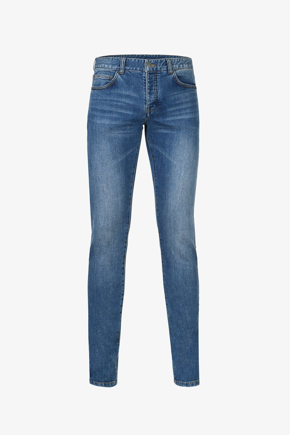 • Corte Slim Fit, cierre con botones ocultos por tapeta y cinco bolsillos.