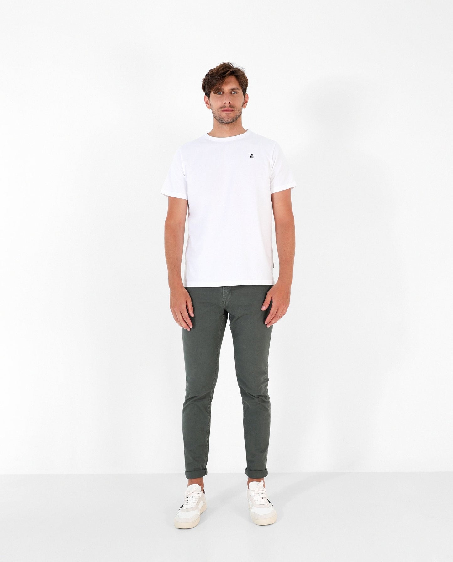 Pantalón confeccionado en tejido de algodón garment dyed. Corte Slim Fit, cierre con botón y cremallera. Cinco bolsillos y trabillas Logo bordado en el bolsillo.