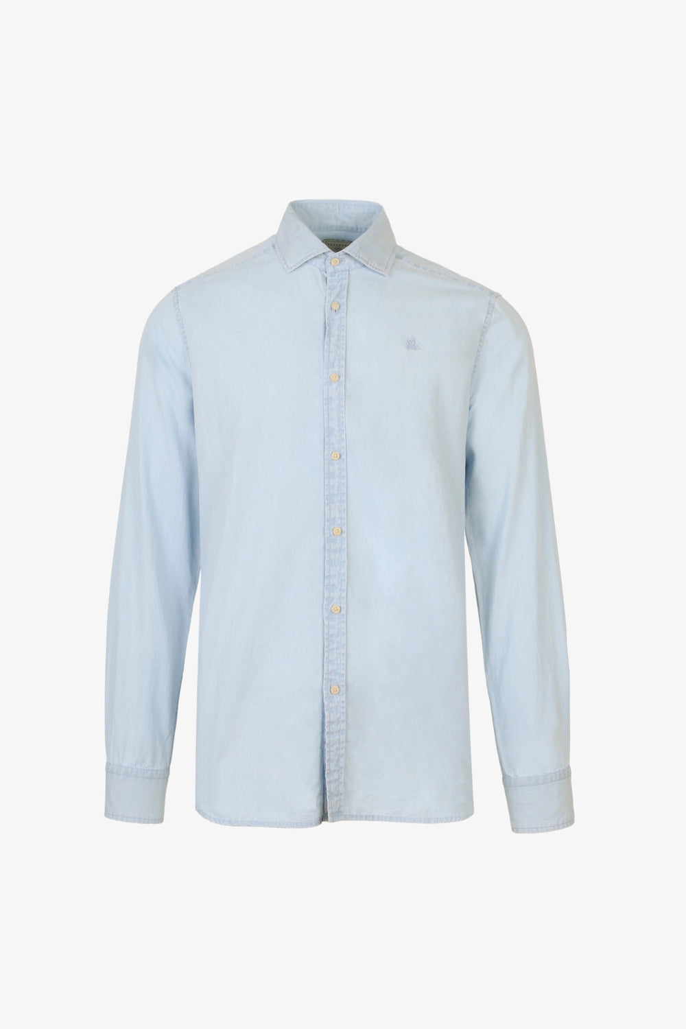 Camisa confeccionada en tejido denim. Corte Regular Fit, cuello italiano con ballenas y cierre con botones. Manga larga terminada en puño y detalle de calavera bordada en el pecho.