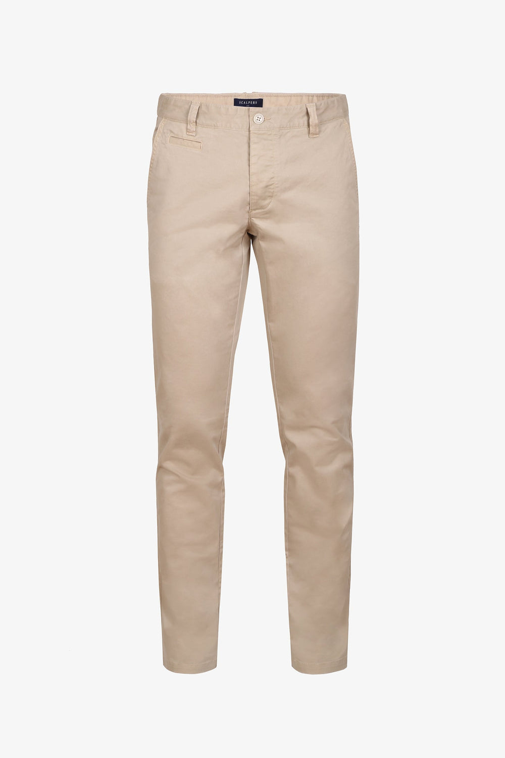 Pantalón chino garment dyed confeccionado en algodón con acabado suave. Cierre con botones ocultos por tapeta. Tiene dos bolsillos laterales y dos bolsillos cerilleros. Tiene trabillas, y presenta como detalle el hilo haciendo contraste en el interior de la cintura.
