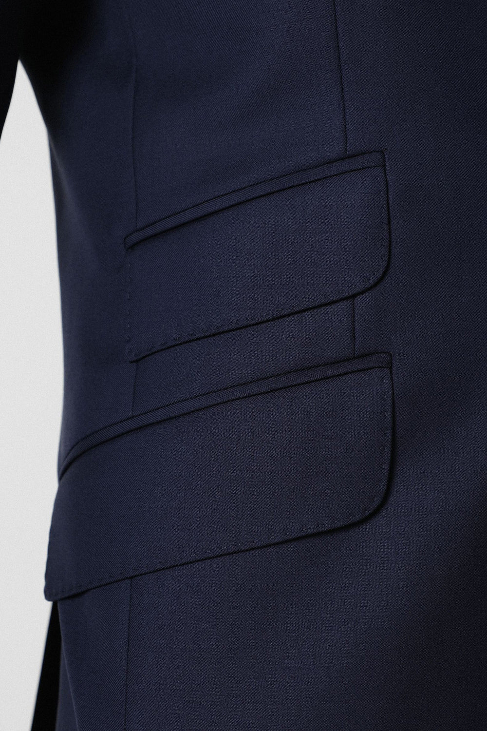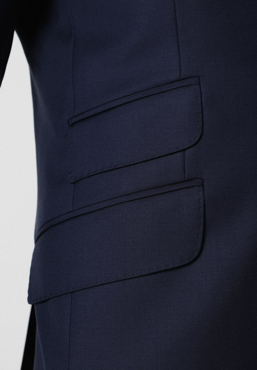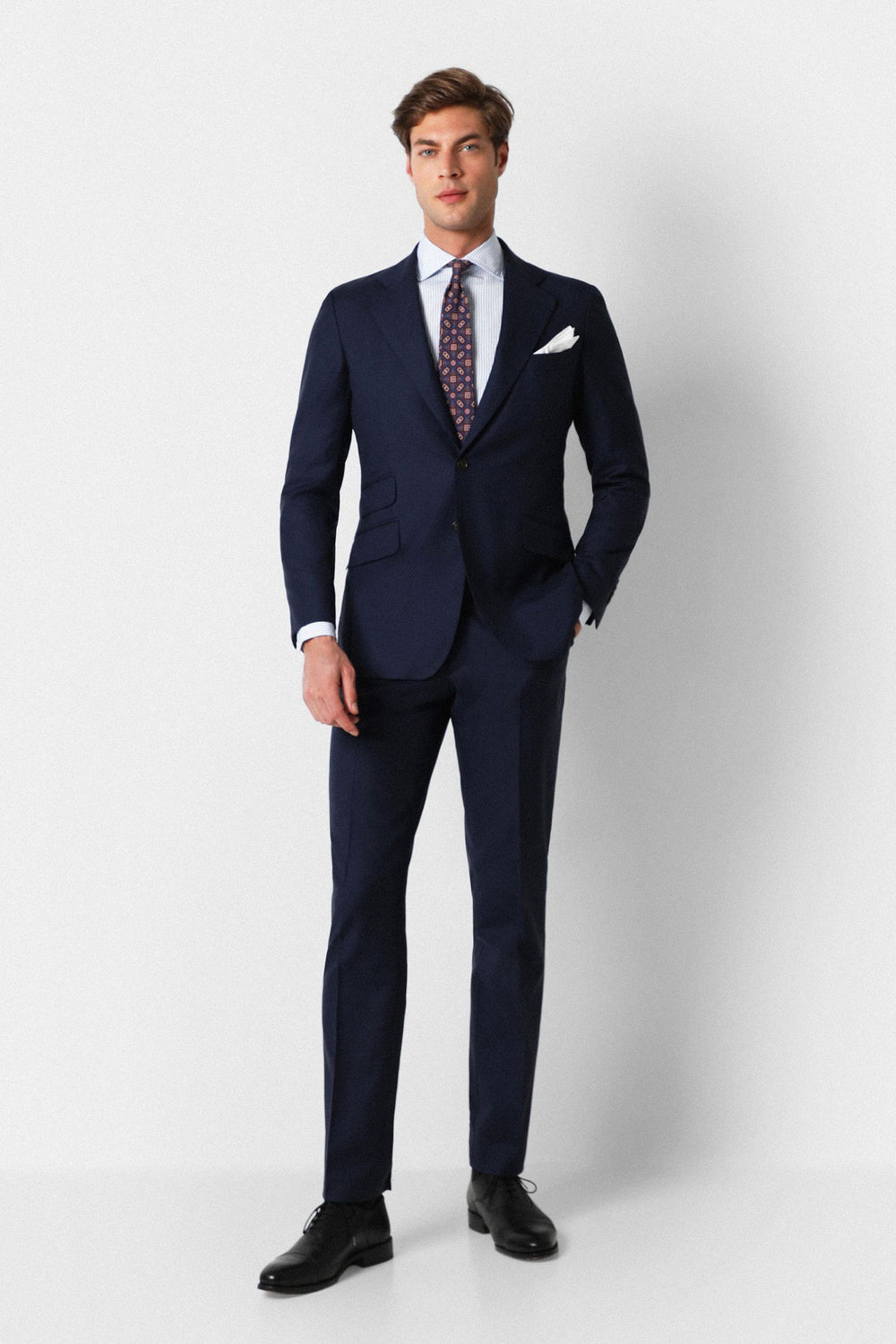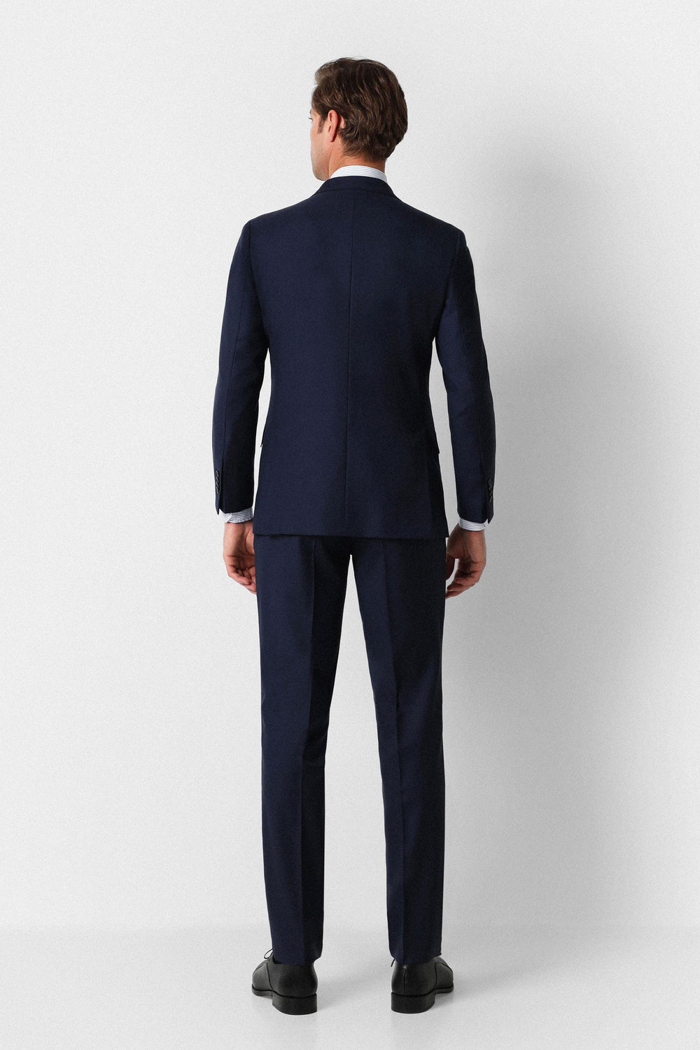 Traje confeccionado en tejido 100% lana. Corte Slim Fit, americana con solapa de muesca y ojal y cierre con dos botones. Manga larga terminada en puño con botones y bolsillos laterales con tapeta. Bolsillos interiores.