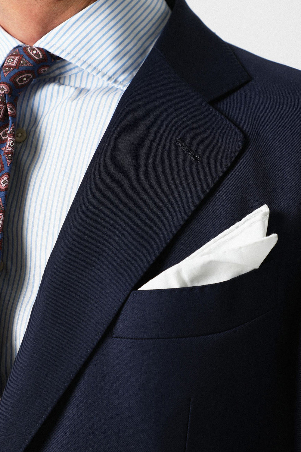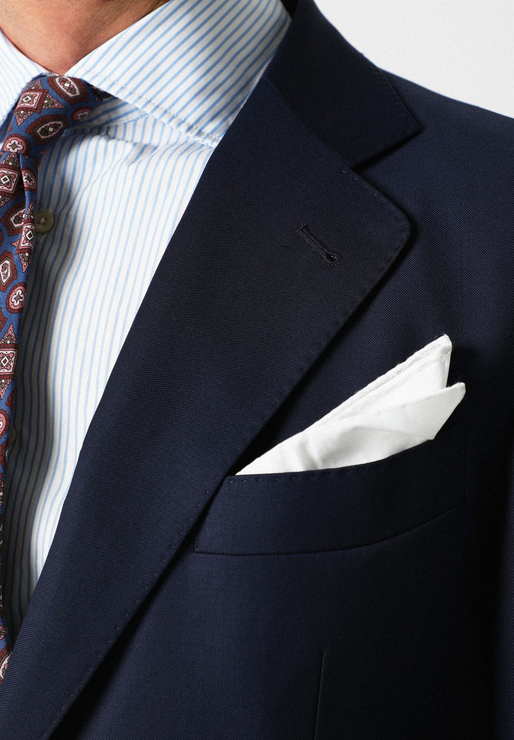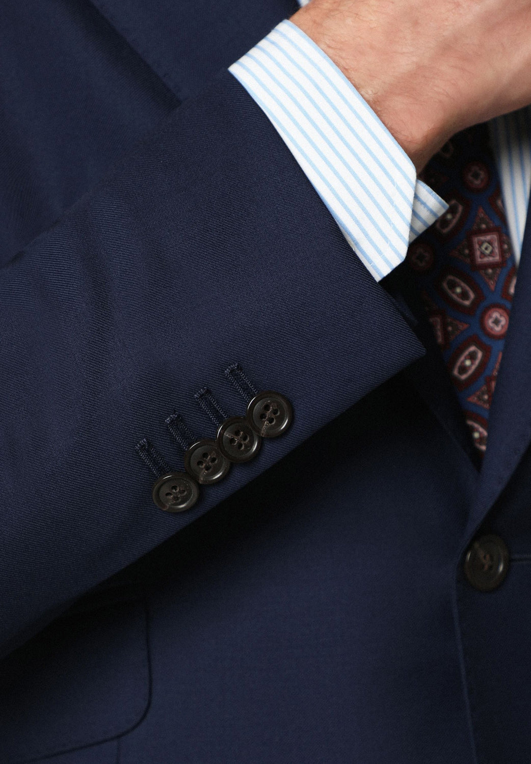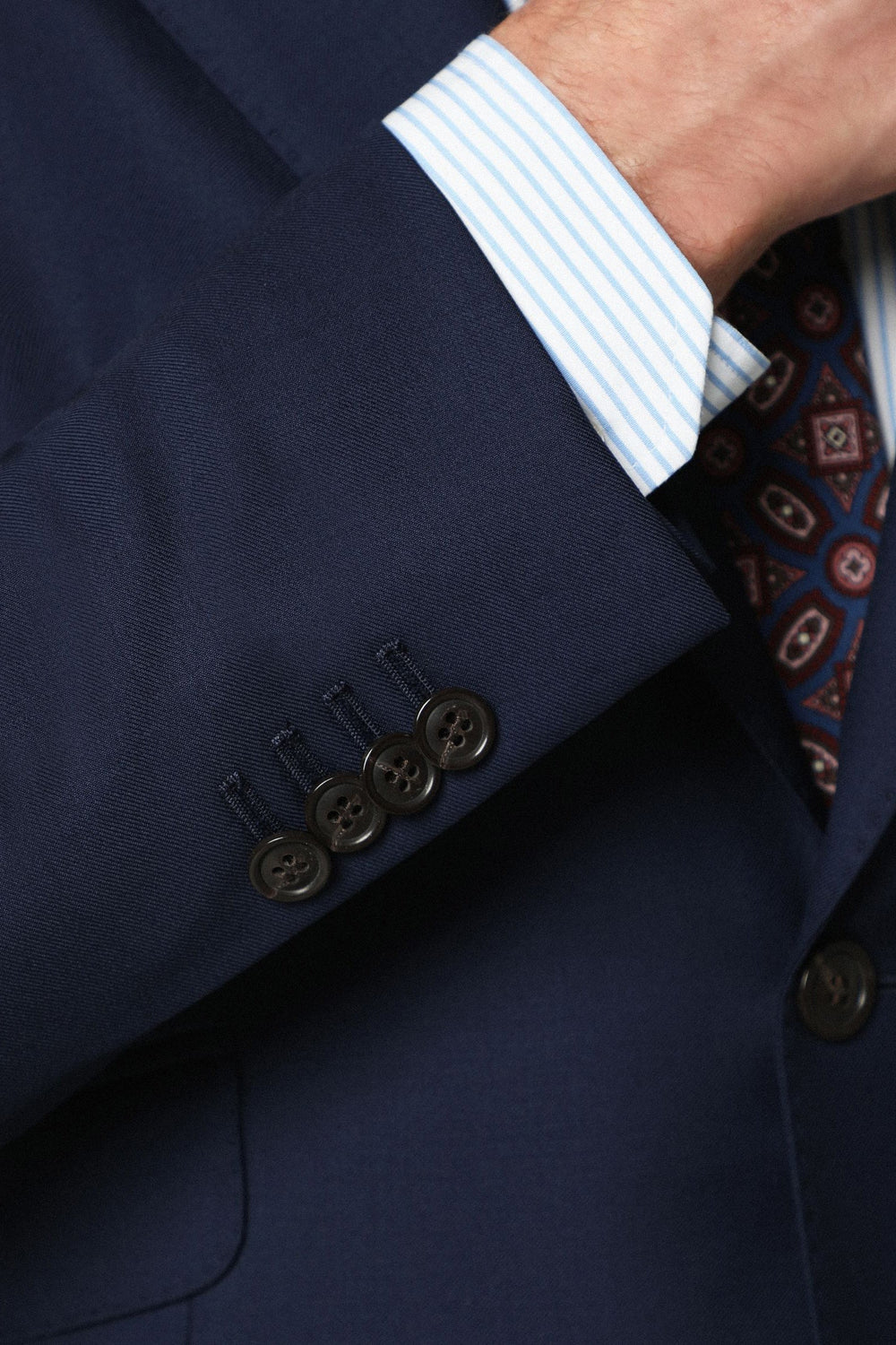 Traje confeccionado en tejido 100% lana. Corte Slim Fit, americana con solapa de muesca y ojal y cierre con dos botones. Manga larga terminada en puño con botones y bolsillos laterales con tapeta. Bolsillos interiores.