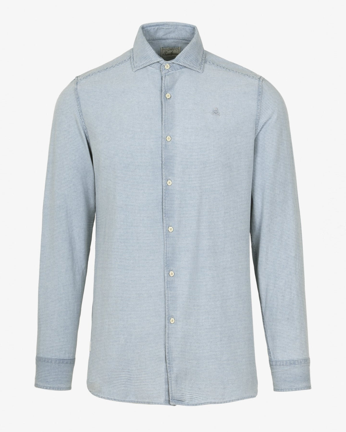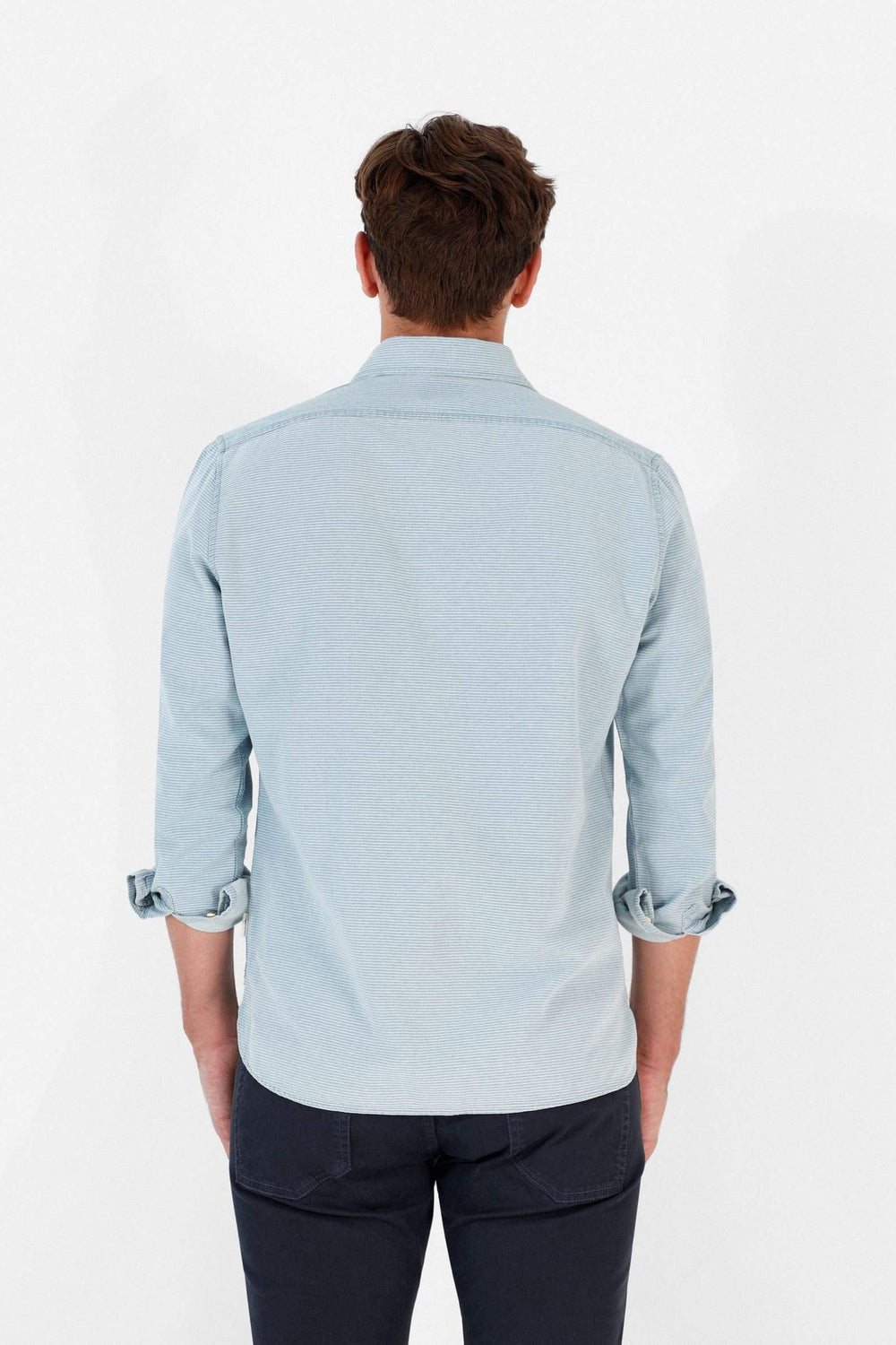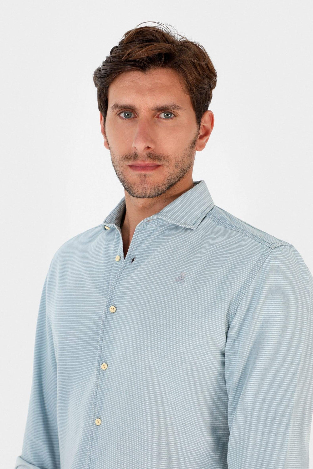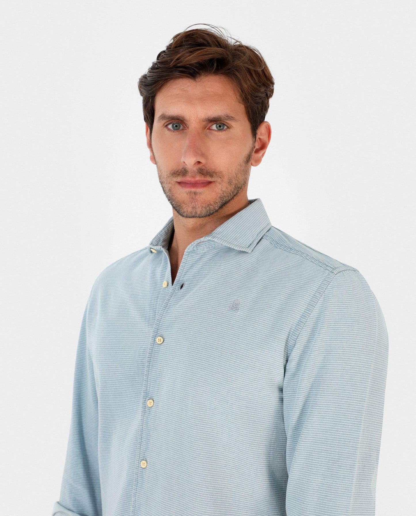 Camisa de rayas finas confeccionada en tejido 100% algodón. Corte Regular Fit, cuello cutaway con ballenas y cierre con botones sin tapeta. Manga larga terminada en puño simple y detalle de calavera bordada a contraste en el pecho.