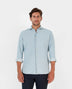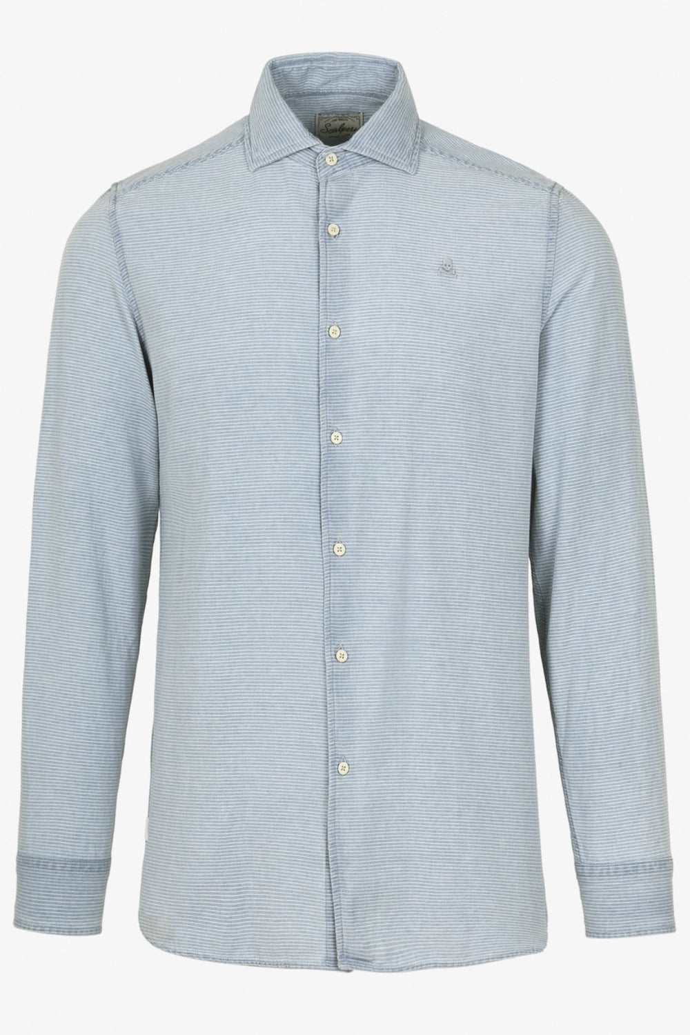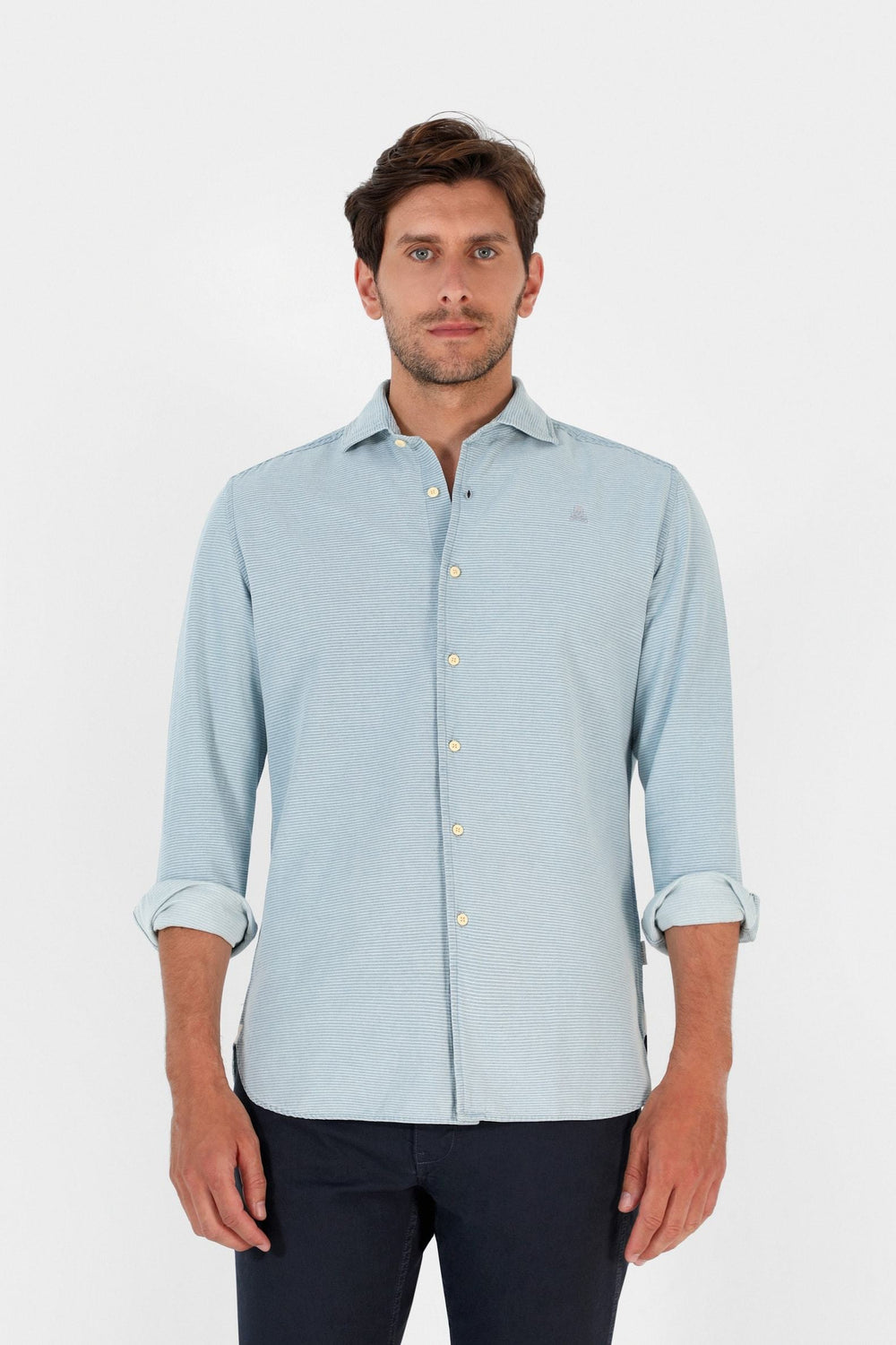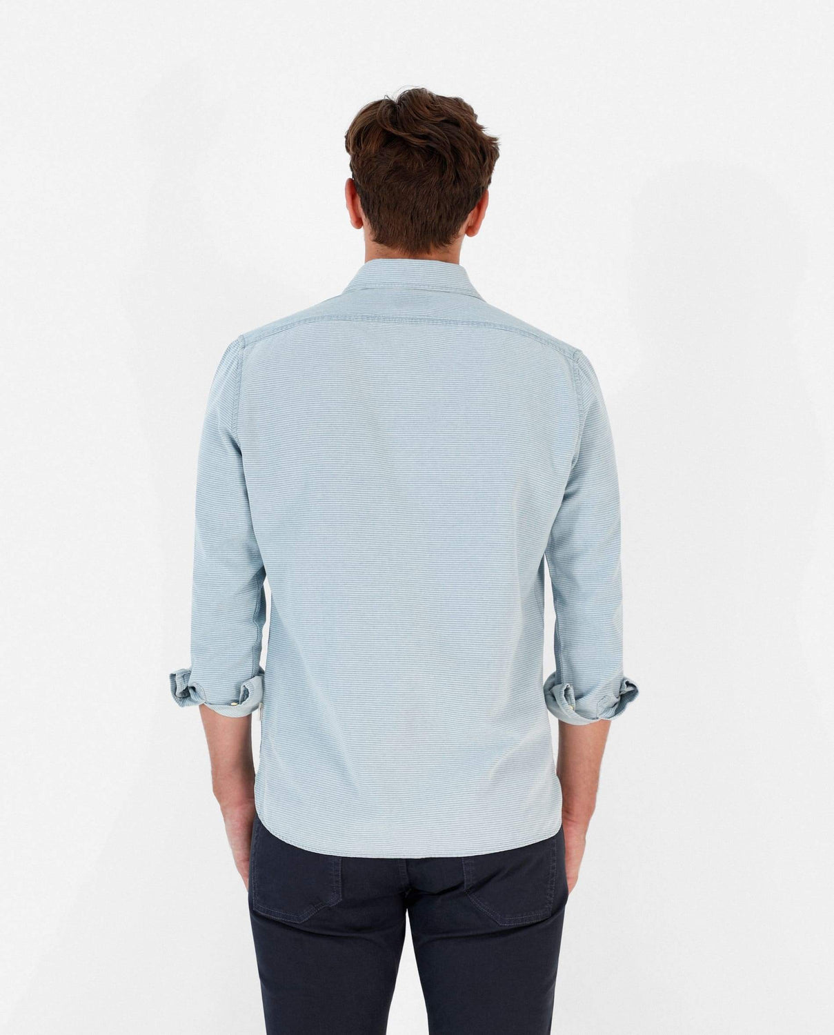 Camisa de rayas finas confeccionada en tejido 100% algodón. Corte Regular Fit, cuello cutaway con ballenas y cierre con botones sin tapeta. Manga larga terminada en puño simple y detalle de calavera bordada a contraste en el pecho.
