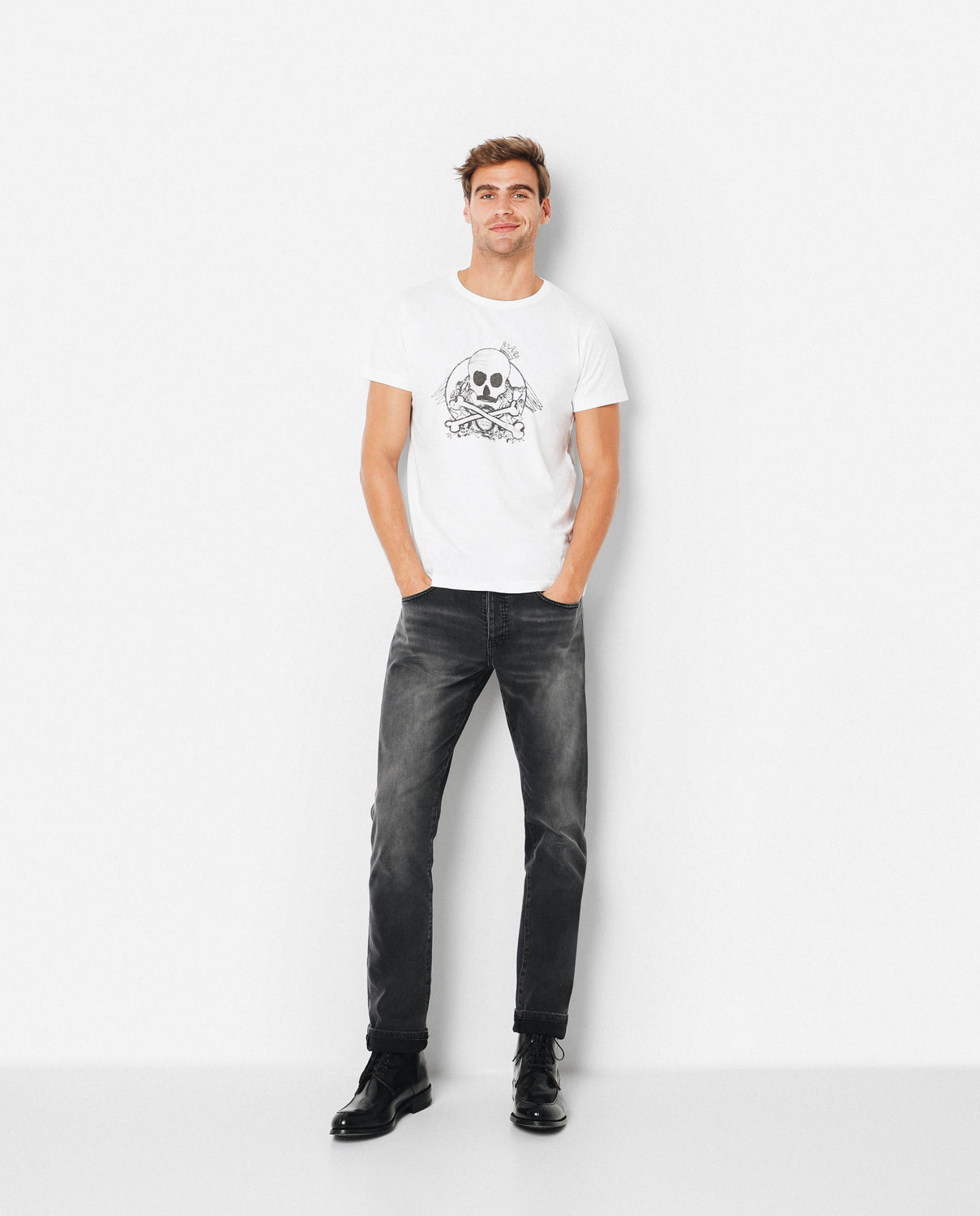 Camiseta confeccionada en tejido de algodón. Corte Regular Fit, cuello redondo y manga corta. Detalle de print de calavera delantero.