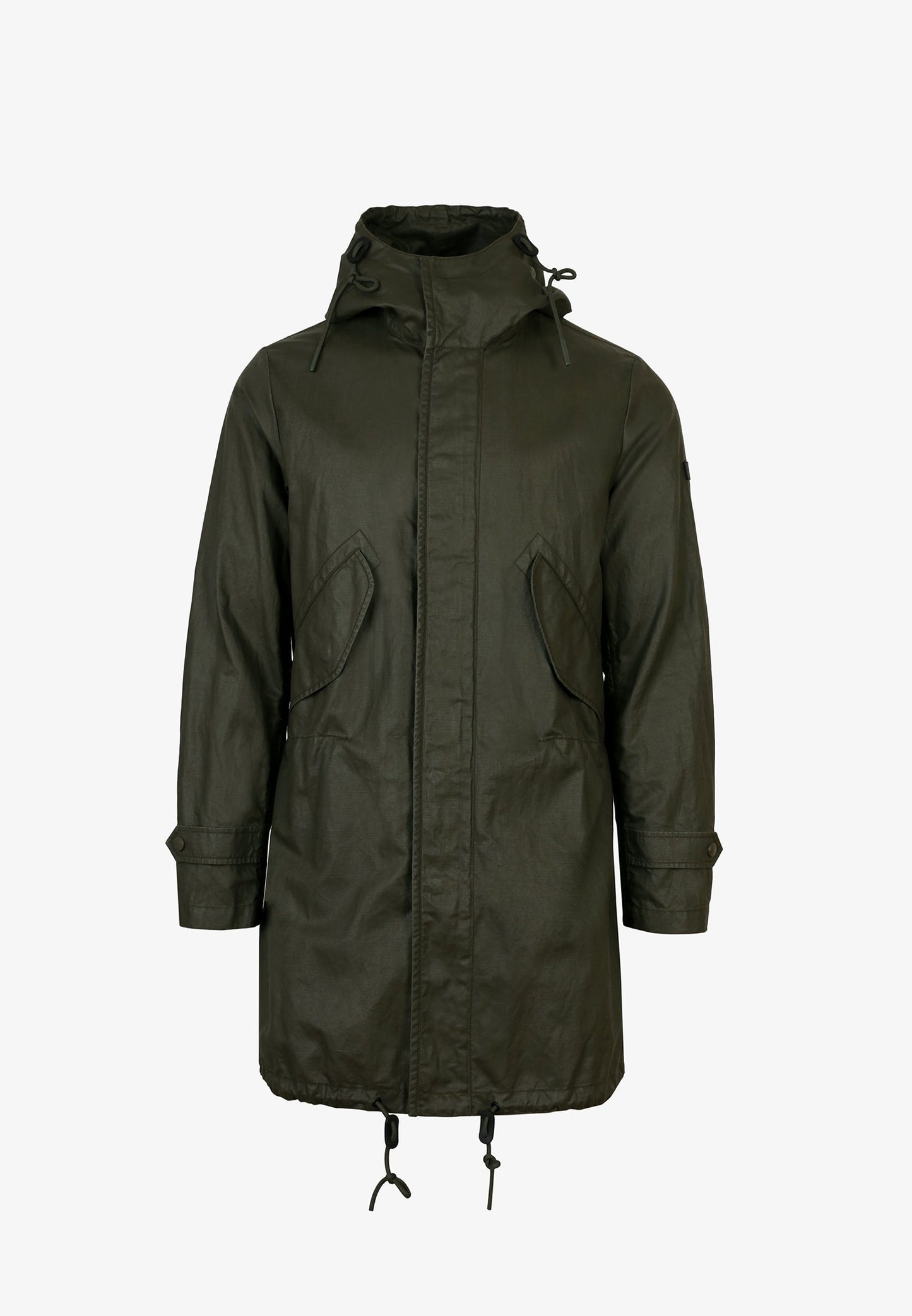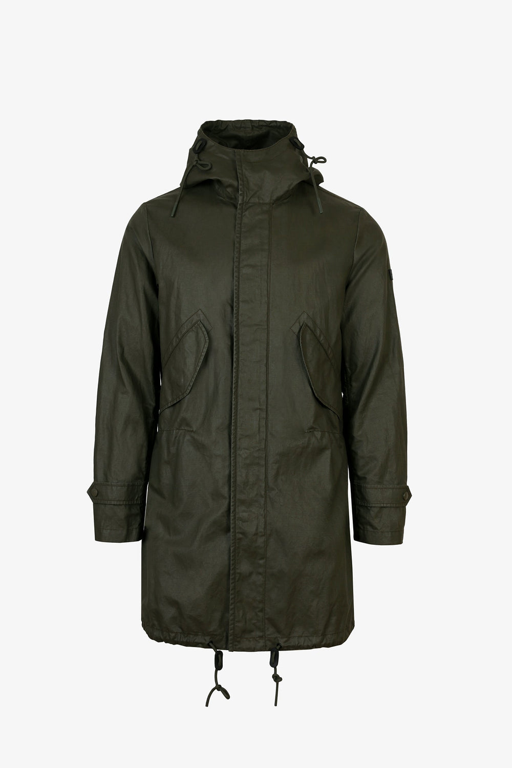 Parka larga confeccionada en tejido de efecto encerado. Corte Regular Fit y cintura ajustable con cordón, cuello con capucha ajustable con cordón y cierre con cremallera de doble carro y botones automáticos. Manga larga terminada en puño con botón automático y bolsillos laterales.