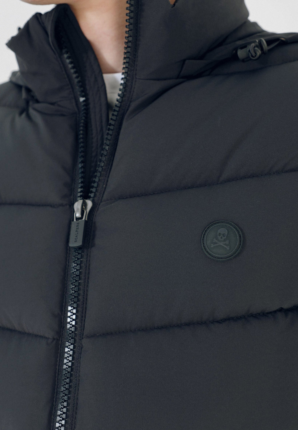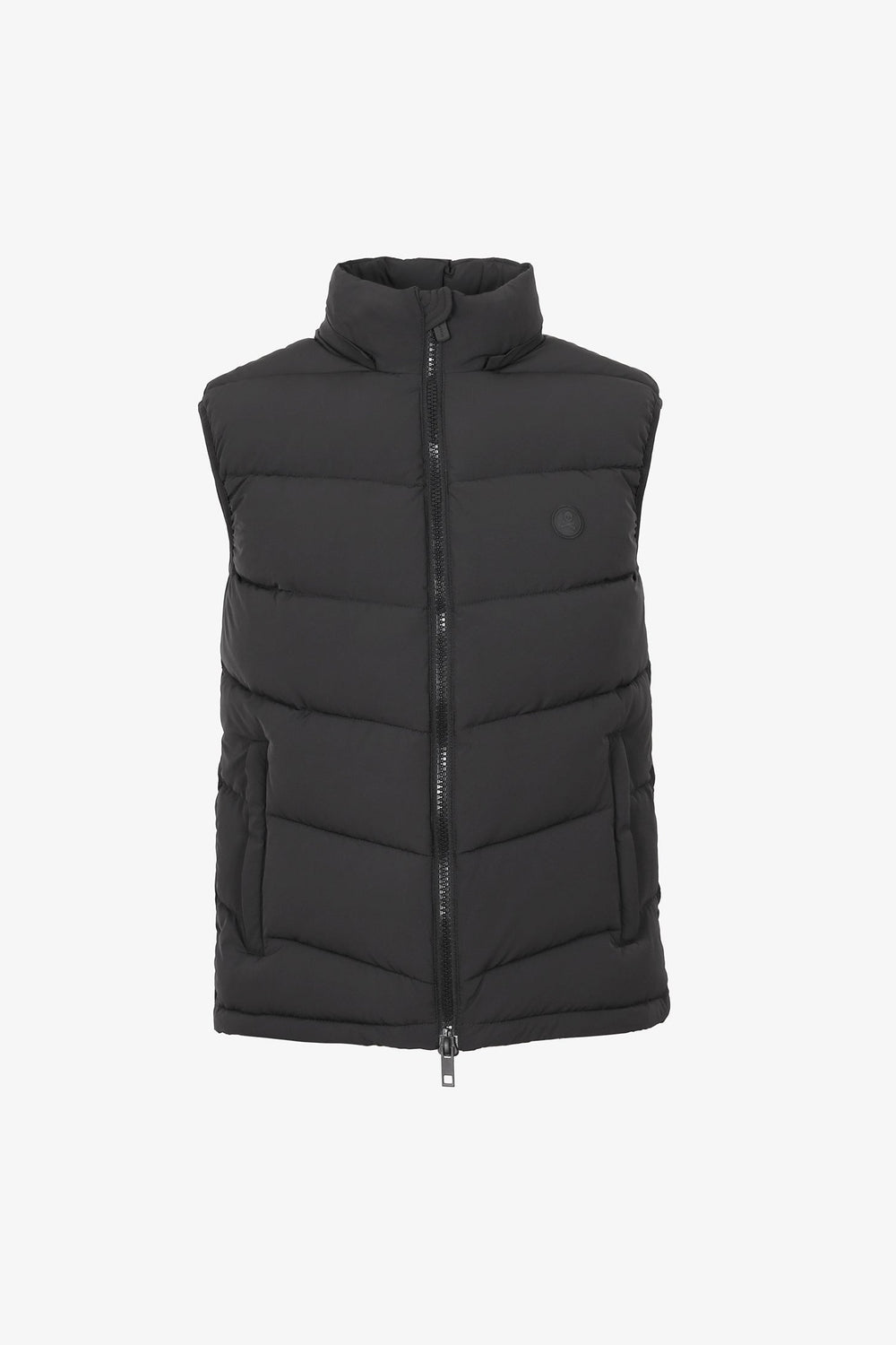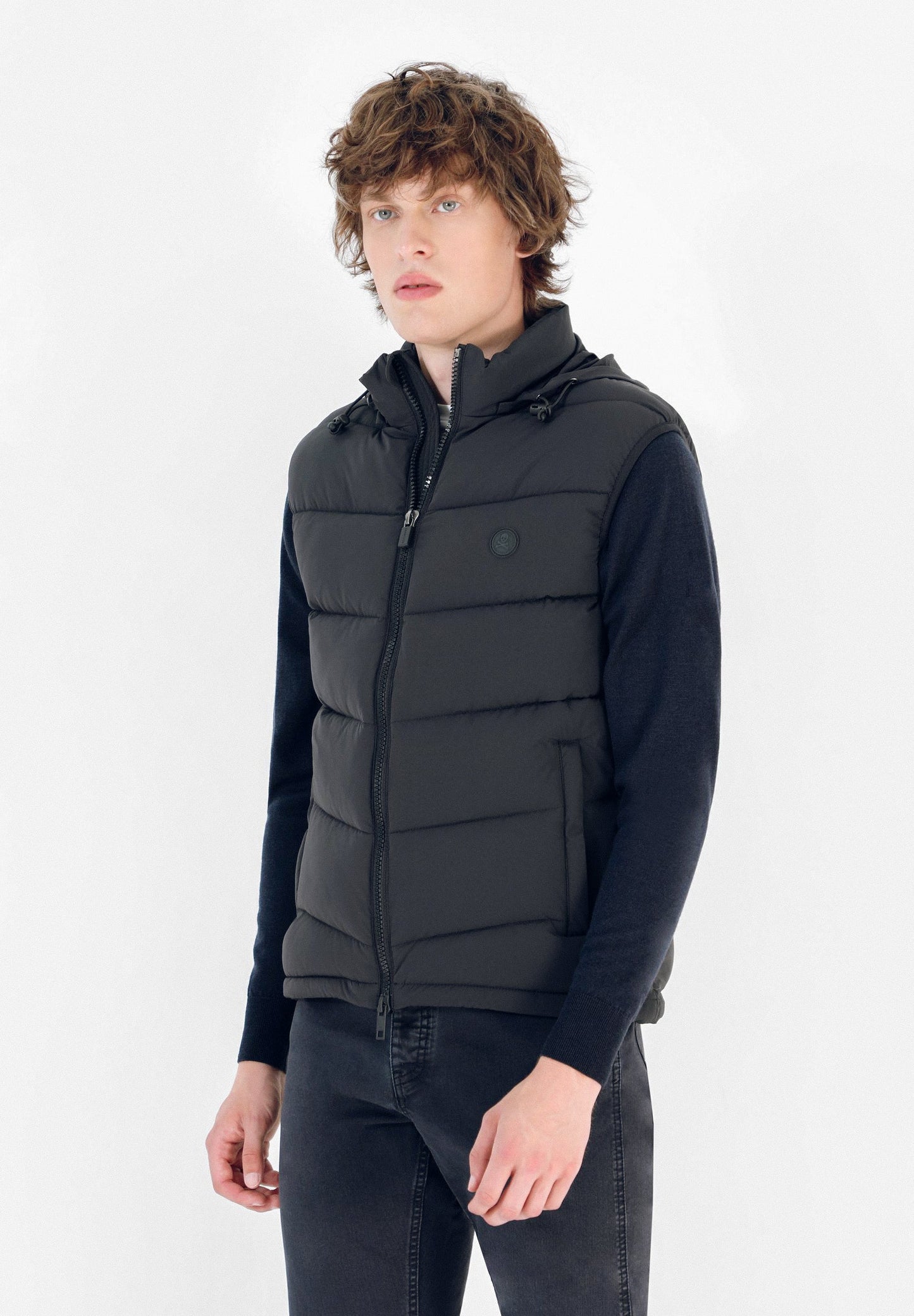 Chaleco confeccionado en nailon con relleno de poliéster. Corte Regular Fit, cuello subido con capucha oculta con cremallera y cierre con cremallera de doble carro. Bolsillos laterales con cremallera y bolsillos interiores. Detalle de parche de calavera en el pecho.
