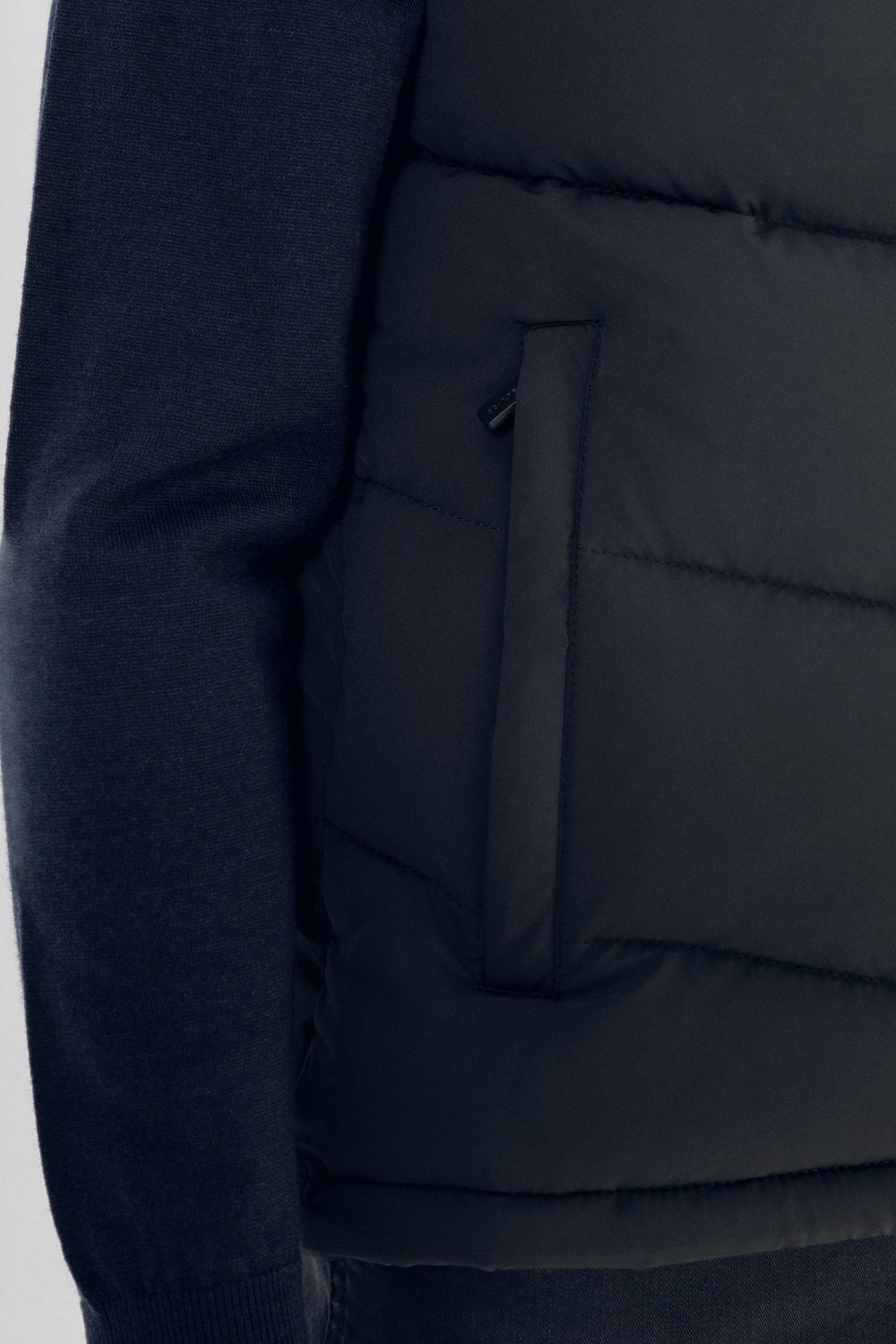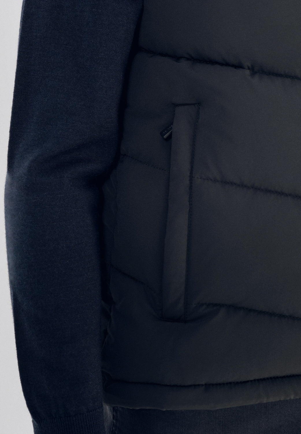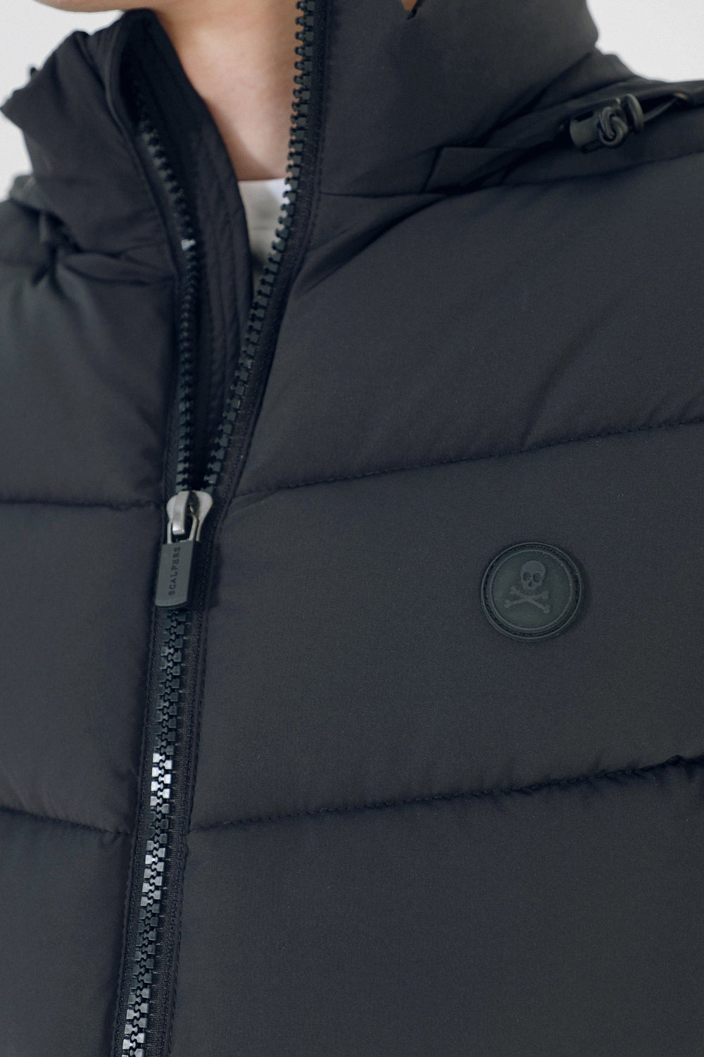 Chaleco confeccionado en nailon con relleno de poliéster. Corte Regular Fit, cuello subido con capucha oculta con cremallera y cierre con cremallera de doble carro. Bolsillos laterales con cremallera y bolsillos interiores. Detalle de parche de calavera en el pecho.
